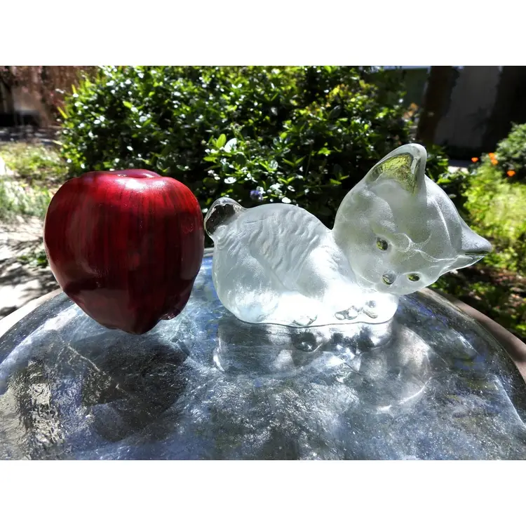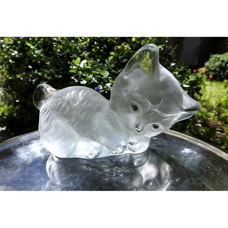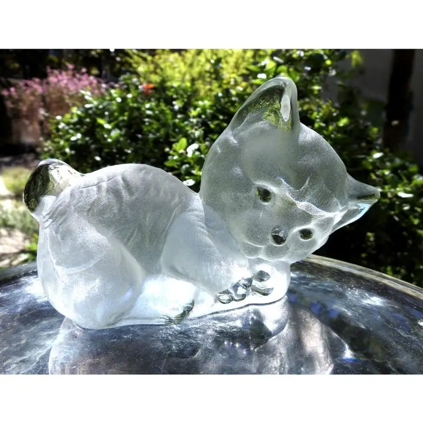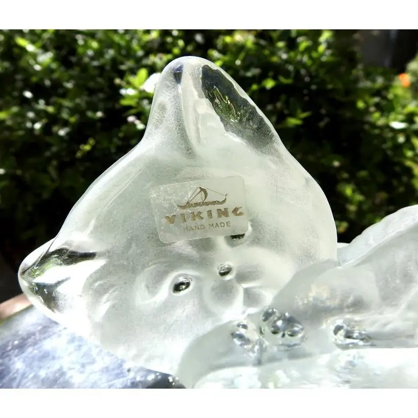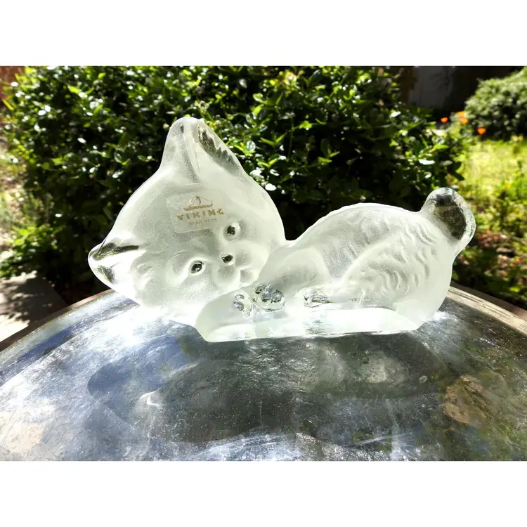 Clear and satin glass cat figurine by Viking. Circa 1980s. Excellent condition. 6.5"X4"X1.5"D. It can be used as a figurine or as a paper weight.
