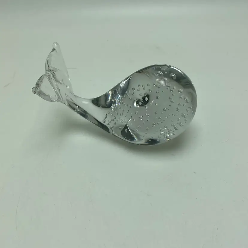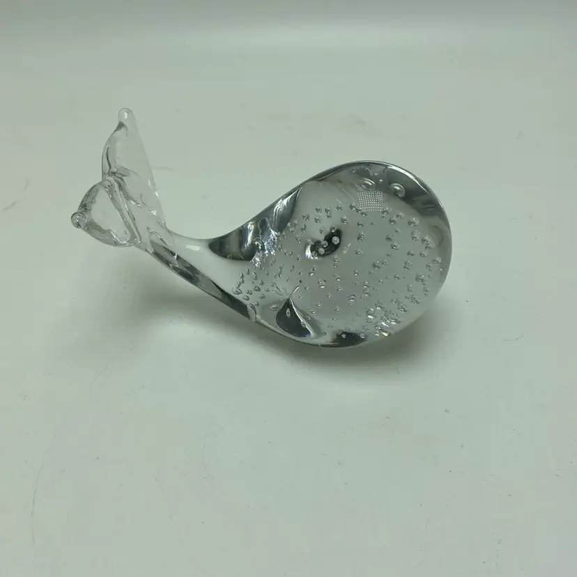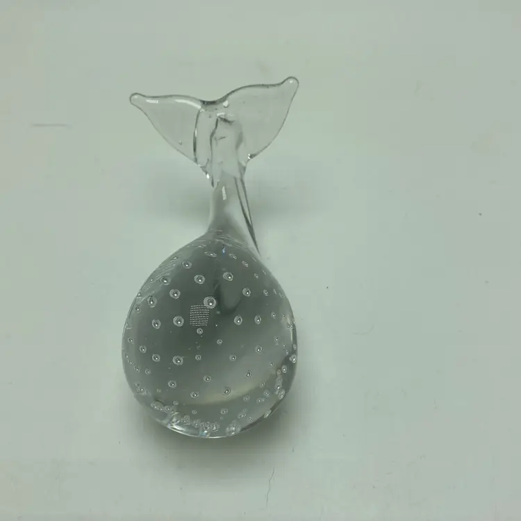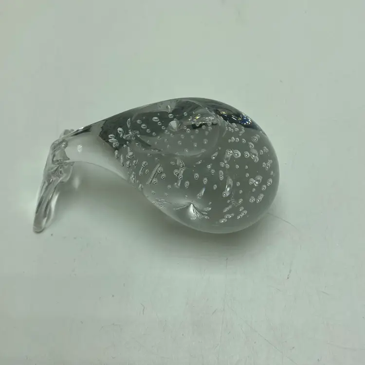 Clear glass with bubbles Smooth bottom Length 4” Height 3” Measurements are approximate