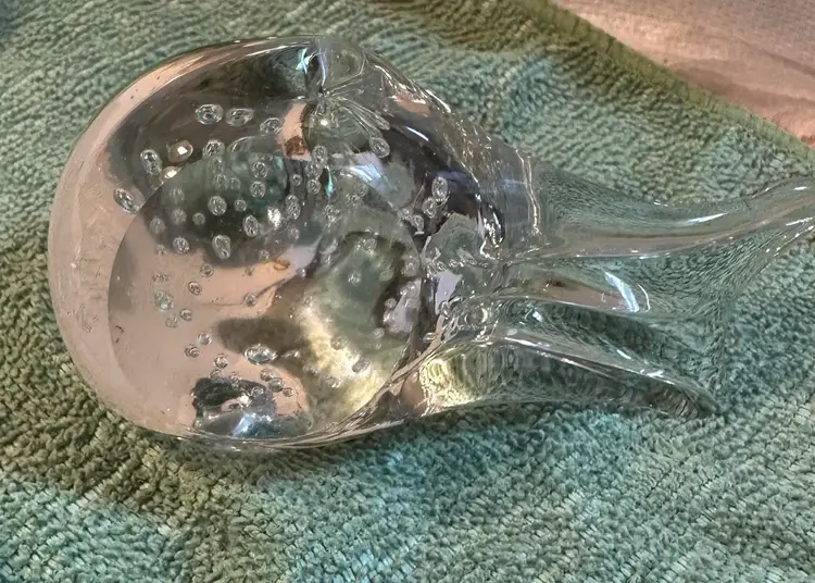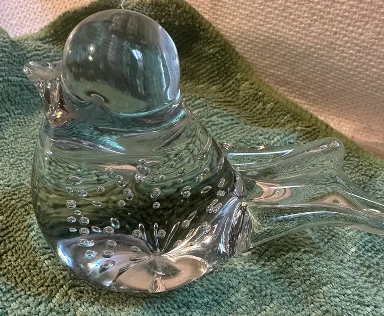 The Clear Art Glass Controlled Bubbles Bird Paperweight is a beautifully crafted decorative piece featuring a bird design with controlled bubbles throughout. Made from clear art glass, this paperweight adds elegance and charm to any space. Perfect for those who appreciate intricate details and unique designs, this piece is sure to be a conversation starter in any room.