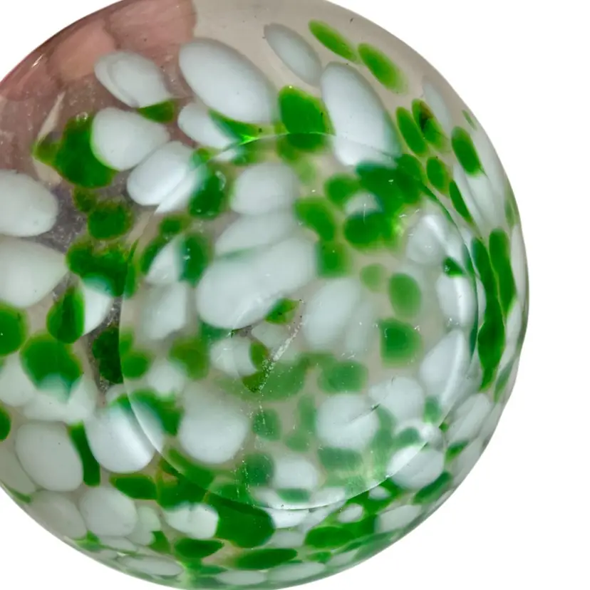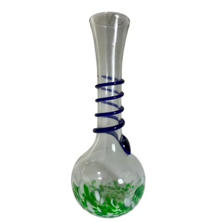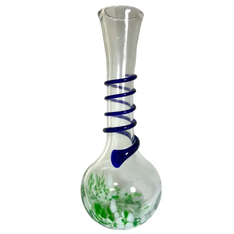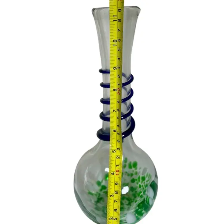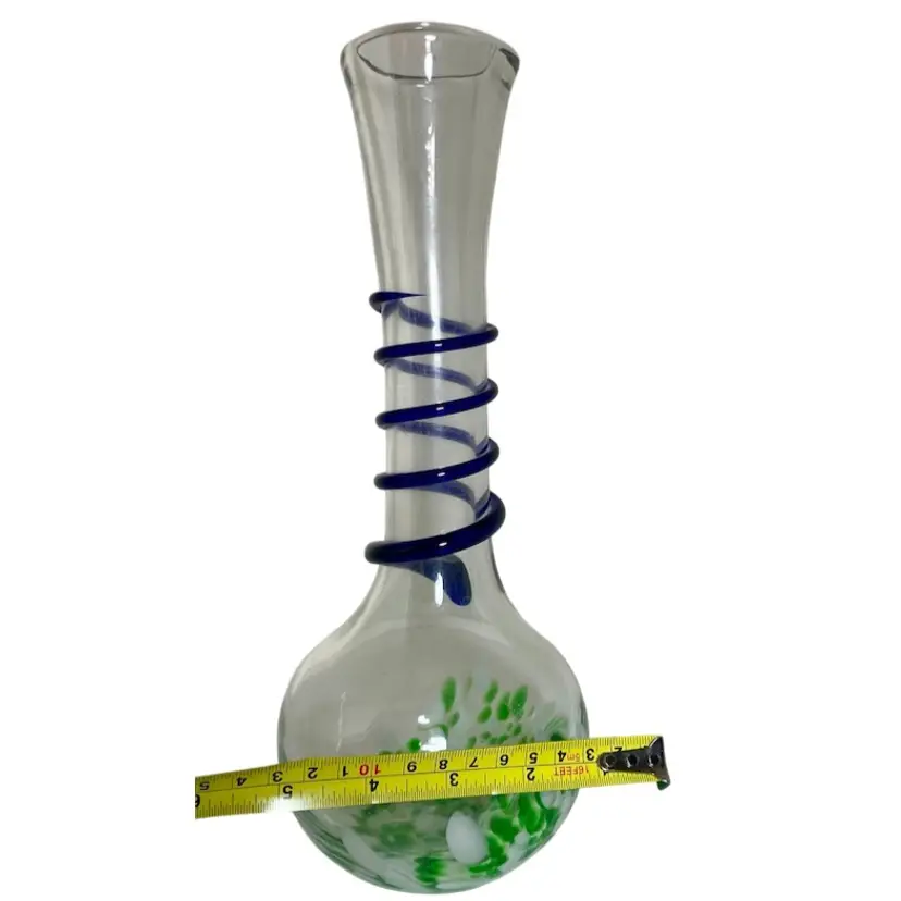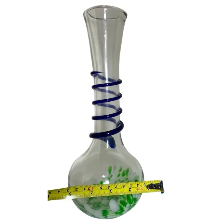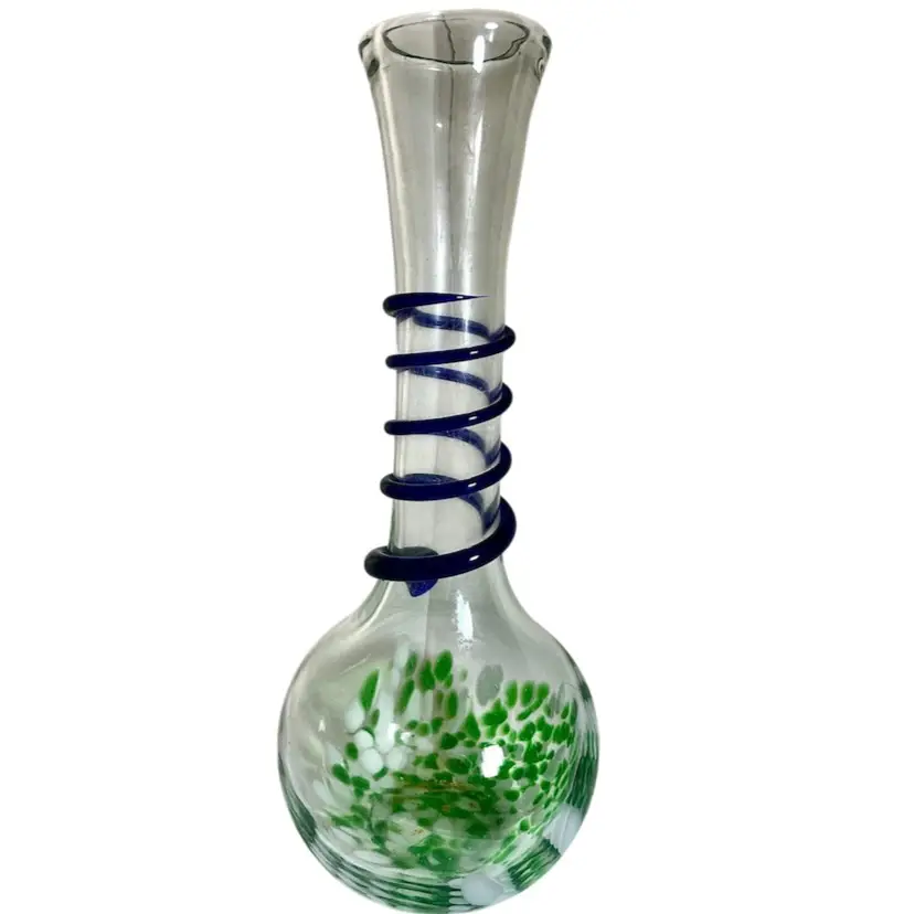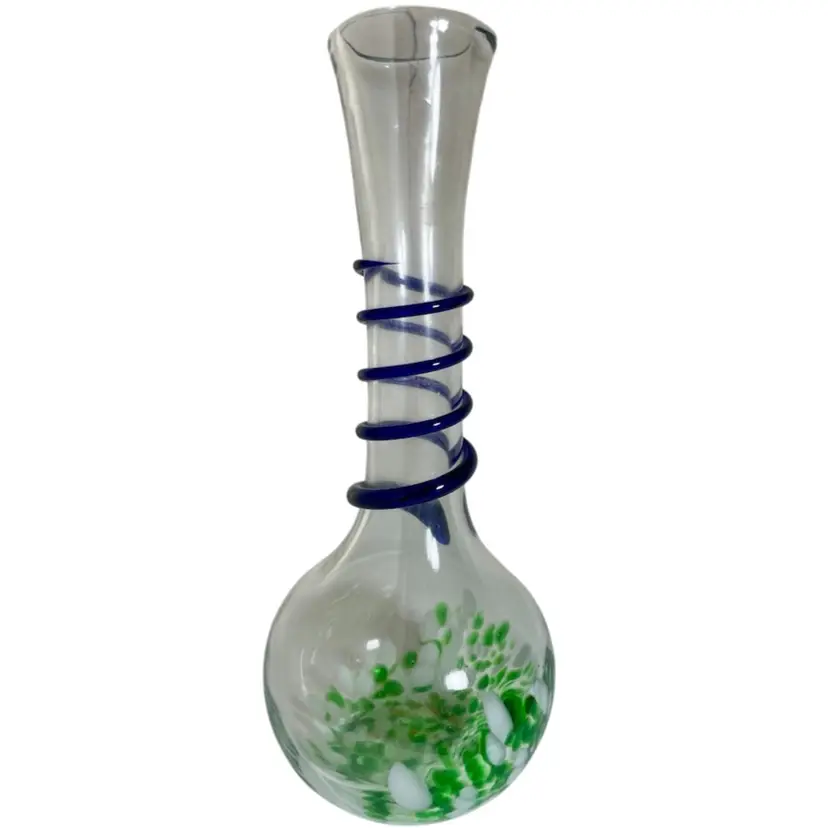 Art Glass Green Splatter Vase with Applied Blue Swirl 11.5” Condition is Used. Shipped with USPS Mail