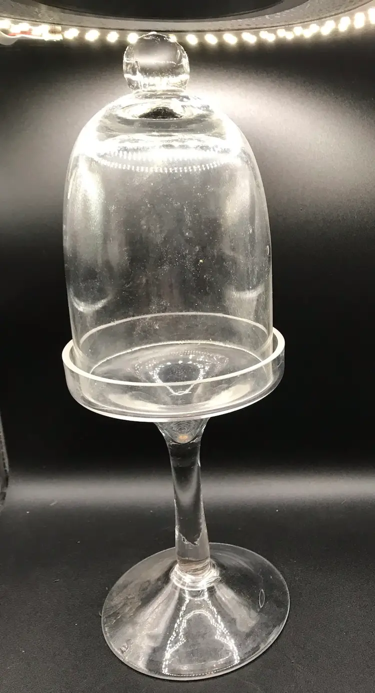 Condition: Good, no chips or cracks, small factory imperfection air bubble on one side of cloche, some air bubbles in glass throughout, otherwise no flaws