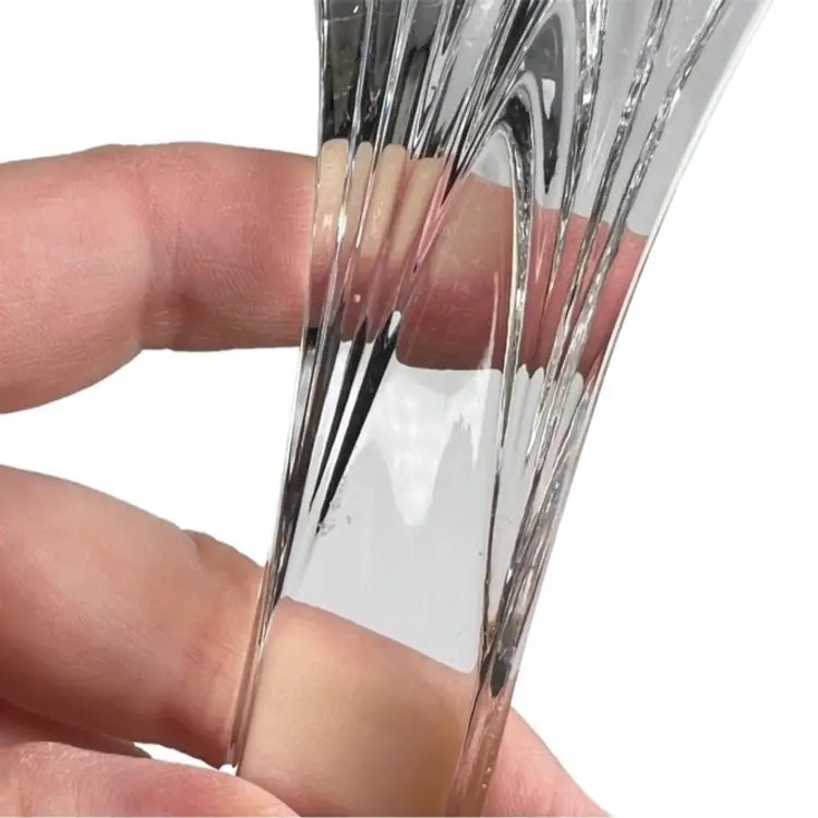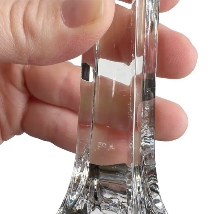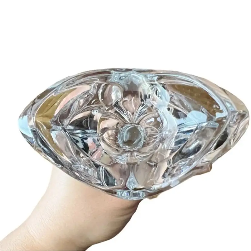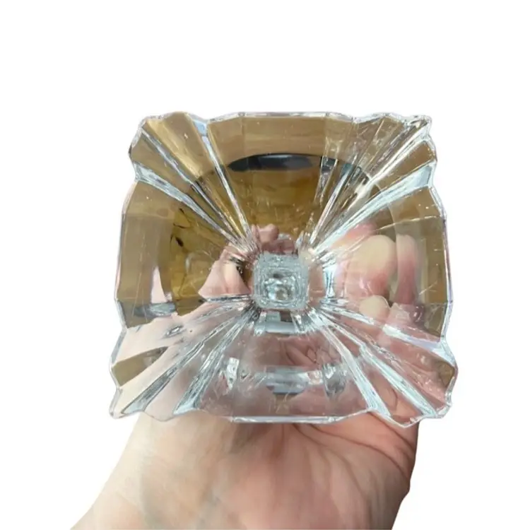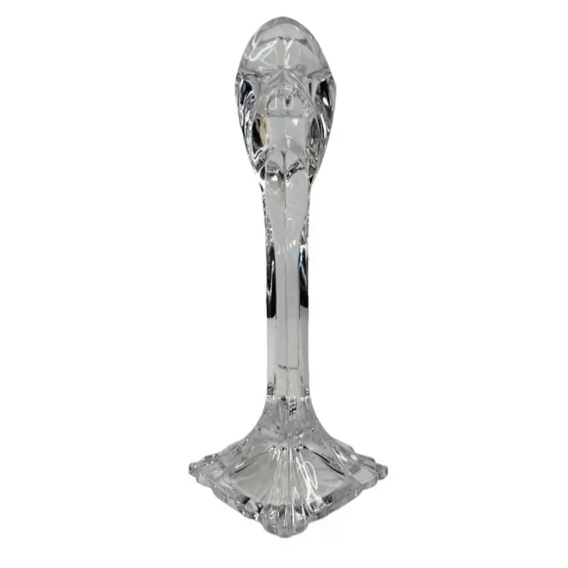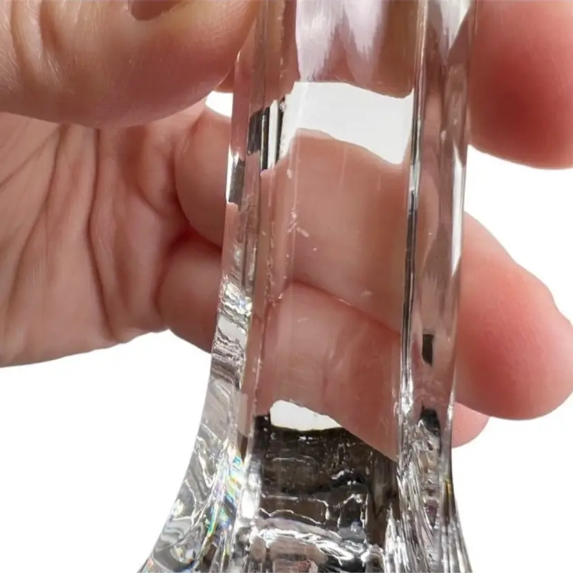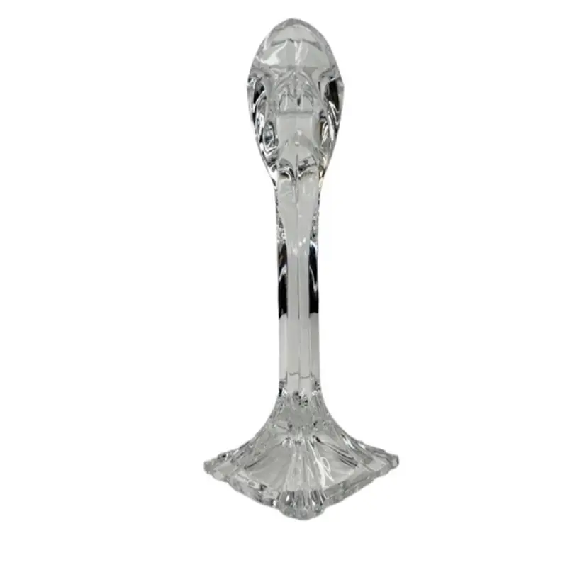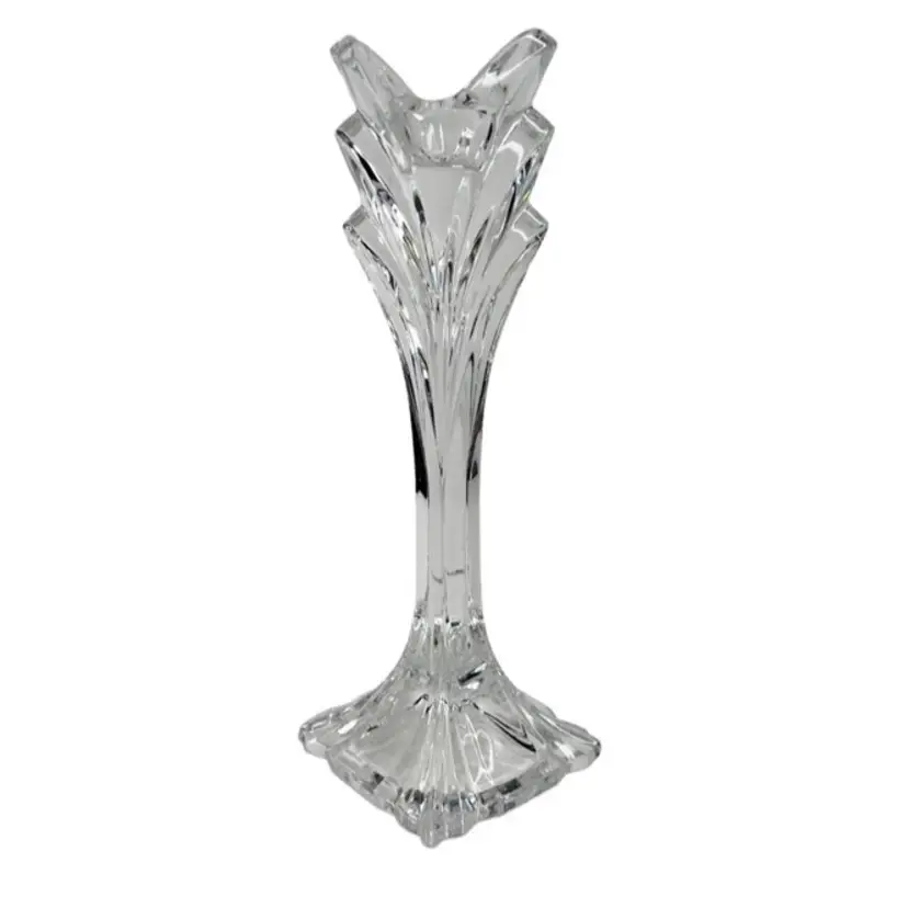 Clear Crystal? Glass Art Deco Style 9 Inch Candlestick Holder. In good preowned condition with some small flea bites and scratches to the stem but no other chips or cracks. It might be Mikasa but because there is no sticker, I am not 100% sure. Tiered fan shape at top with a square base. Very well made and sturdy. Weighs 1.5 pounds.