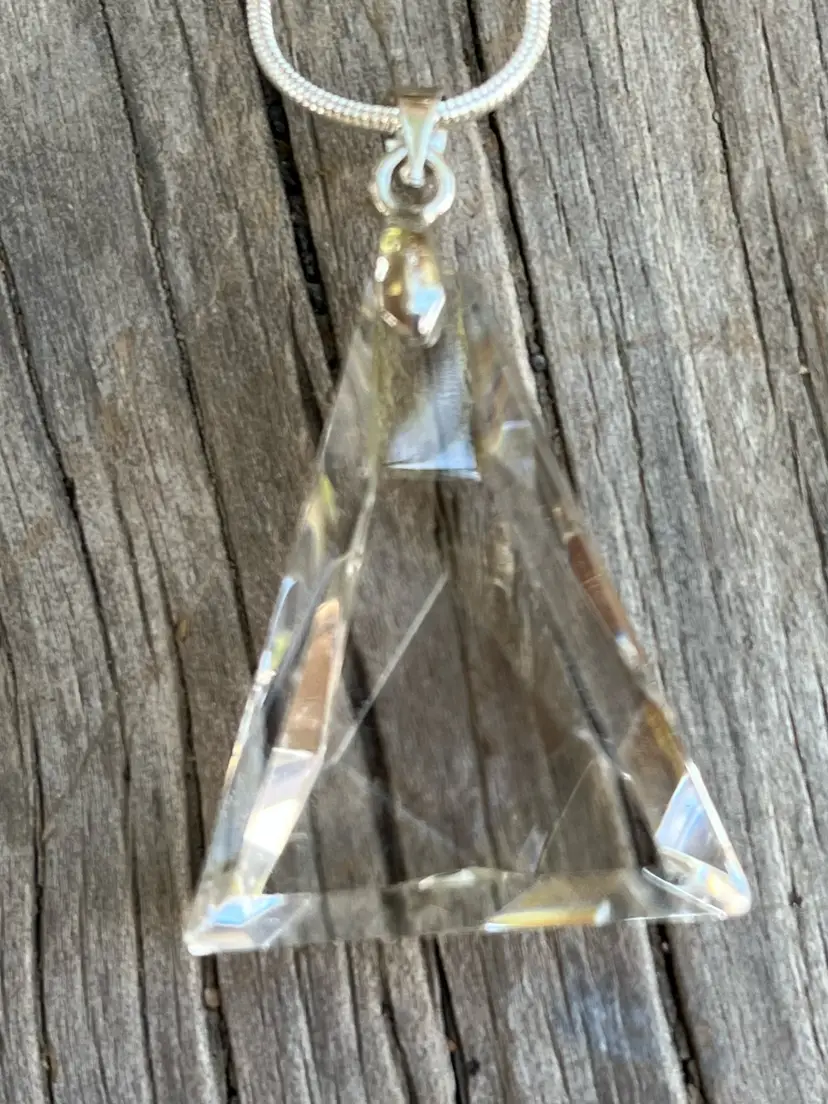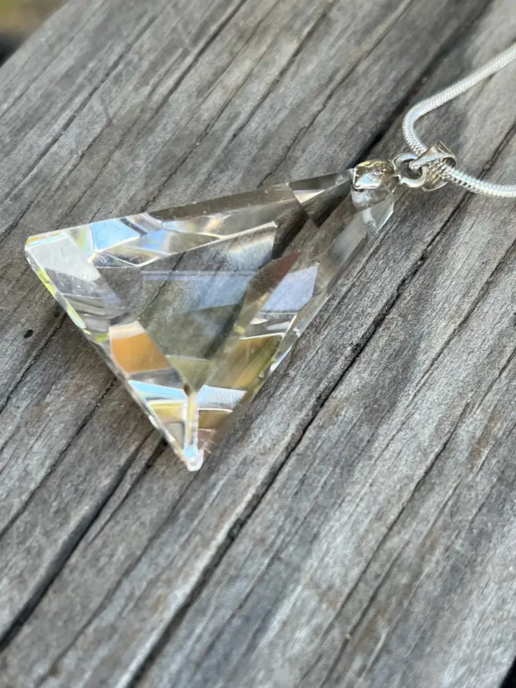 A beautiful clear Crystal Quartz faceted Triangular Pendant on an 18 inch 925 Sterling Silver Snake Chain. Super hard to get a good picture of this due to the faceting. It is gorgeous and I promise you will not be disappointed in it.
