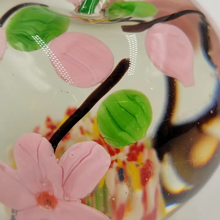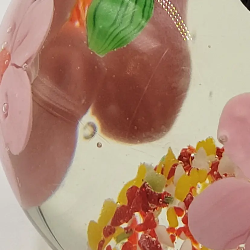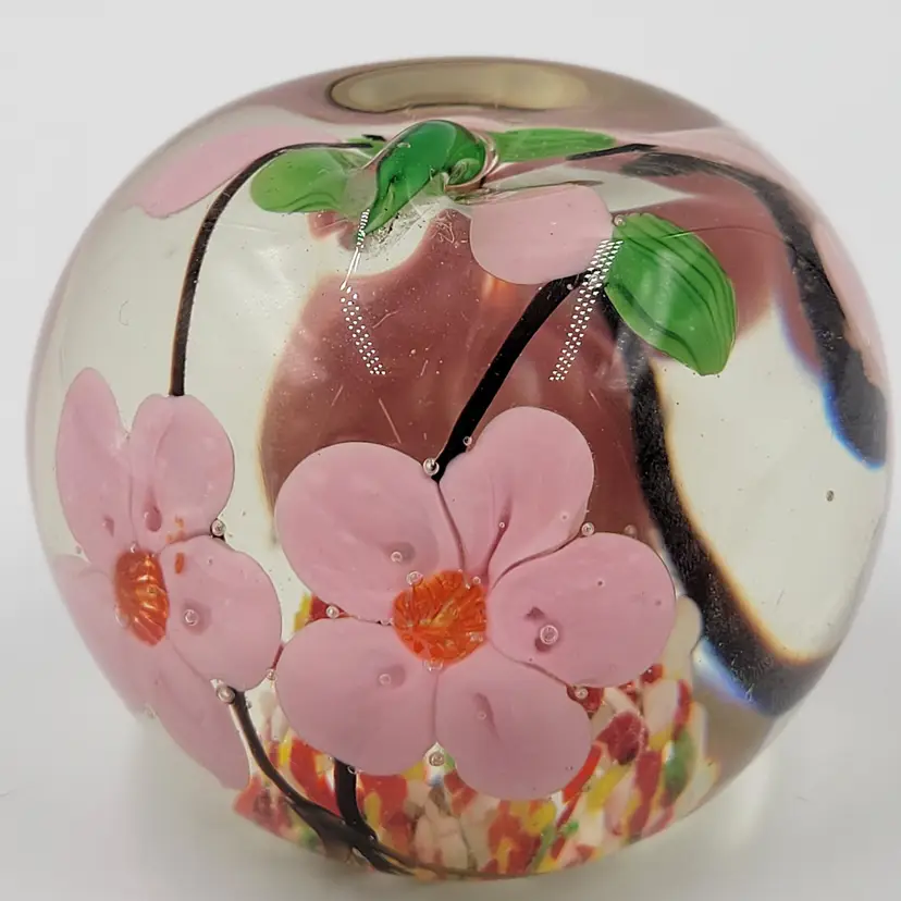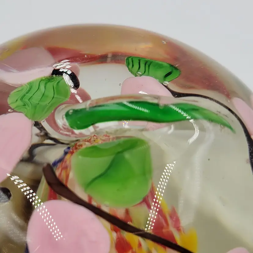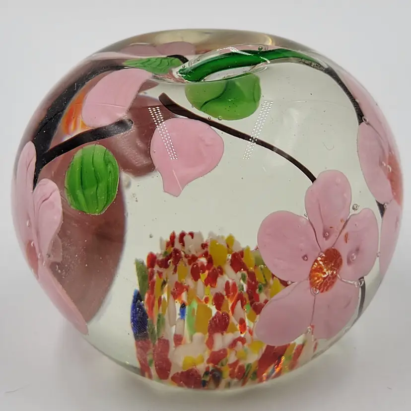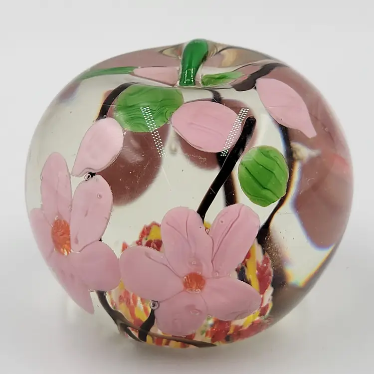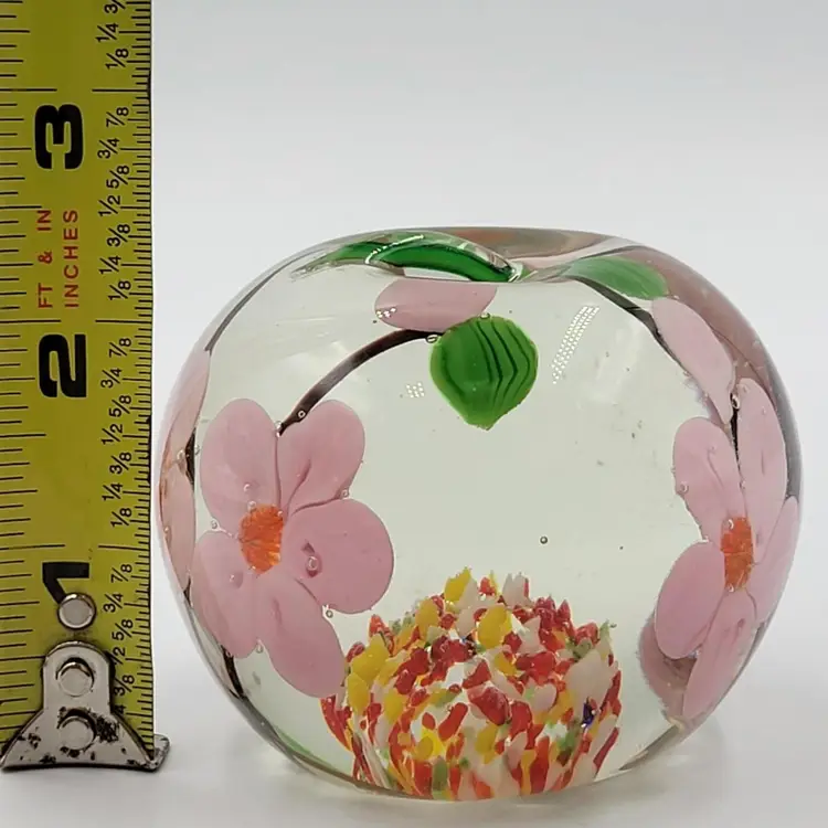 This is a beautiful paperweight. The clear glass is in the shape of an apple right down to the stem on top (see photos). There are pink flowers hanging on brown stems and small green leaves and a mulit colored middle (see photos). This paperweight measures about 2.50 inches high and about 2.75 inches wide. There are air bubbles on the glass. There are a few minor scratches (see photos).