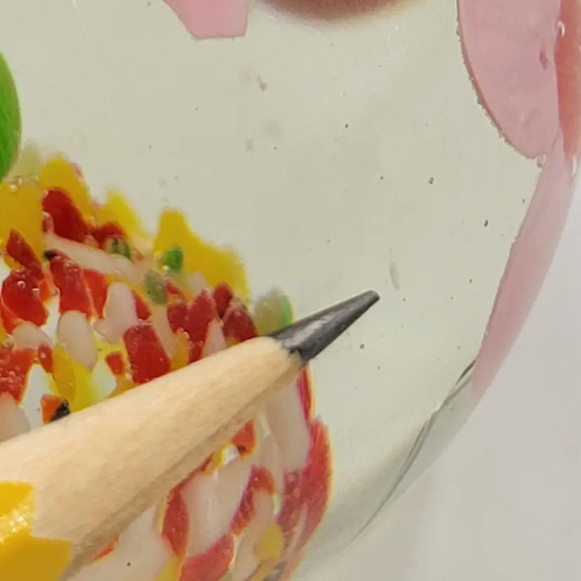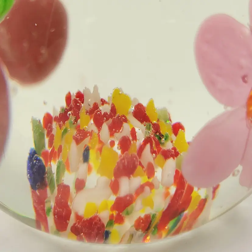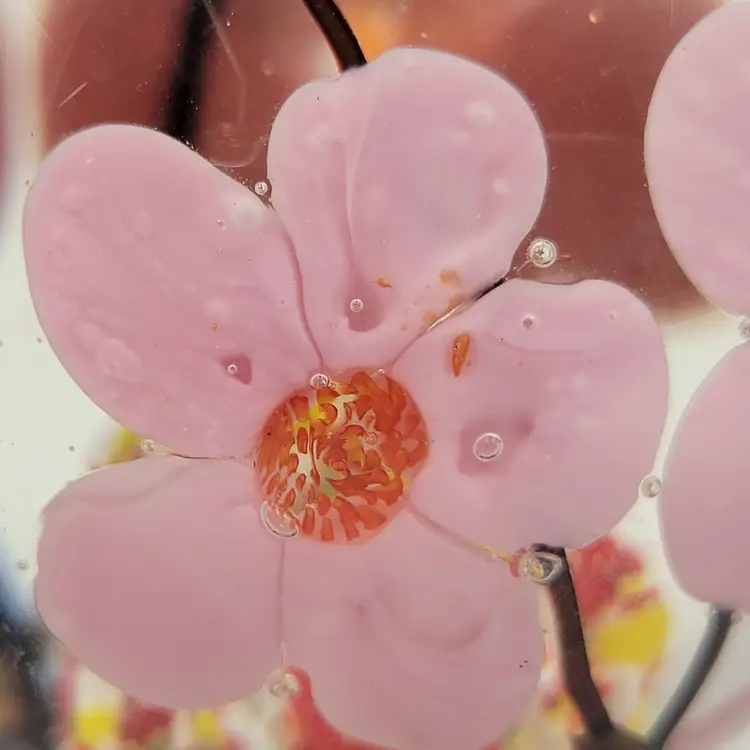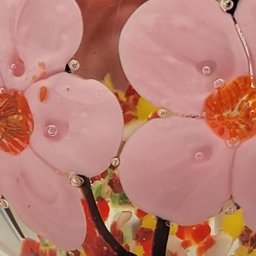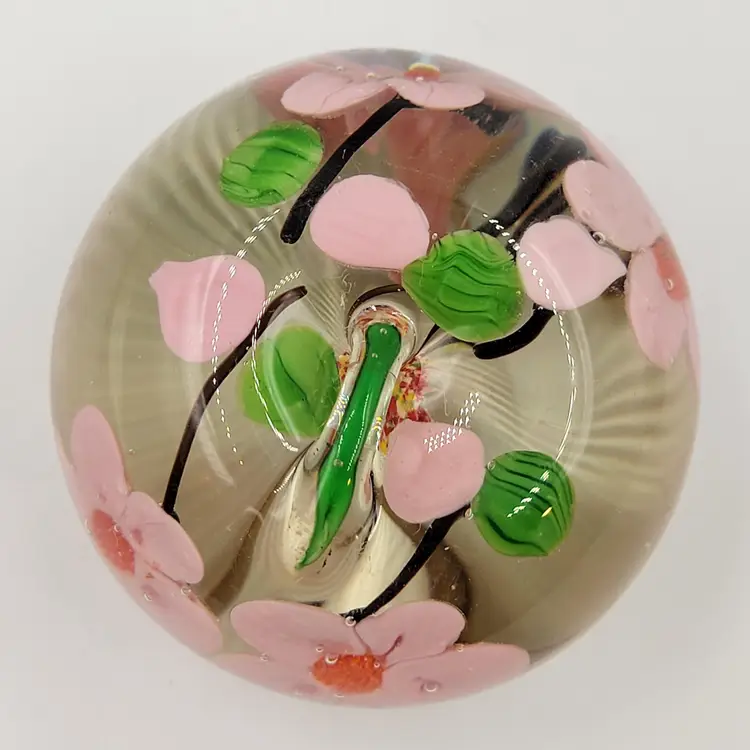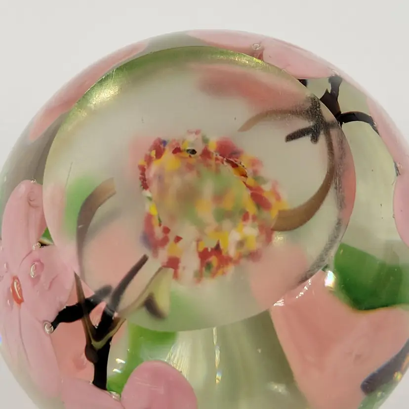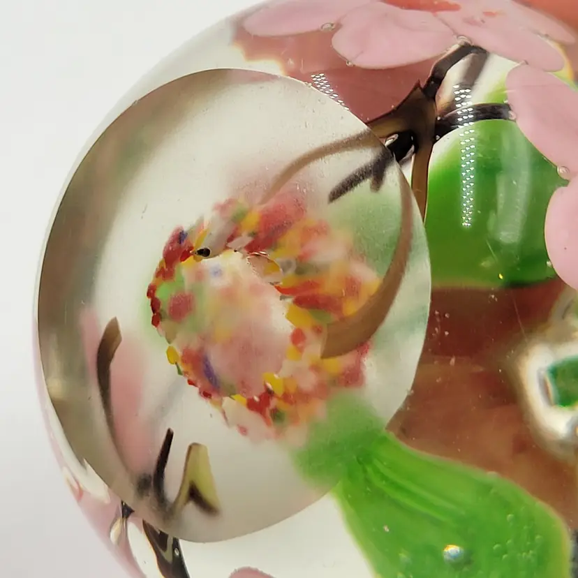 This is a beautiful paperweight. The clear glass is in the shape of an apple right down to the stem on top (see photos). There are pink flowers hanging on brown stems and small green leaves and a mulit colored middle (see photos). This paperweight measures about 2.50 inches high and about 2.75 inches wide. There are air bubbles on the glass. There are a few minor scratches (see photos).