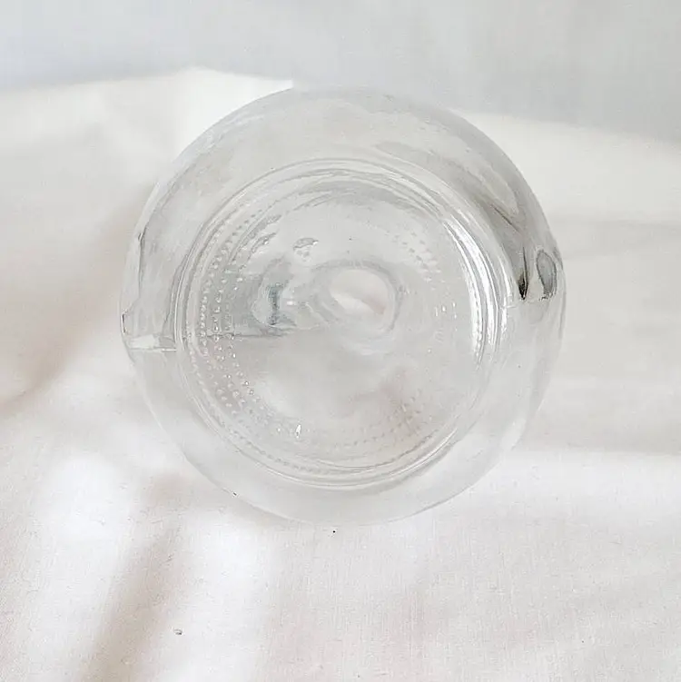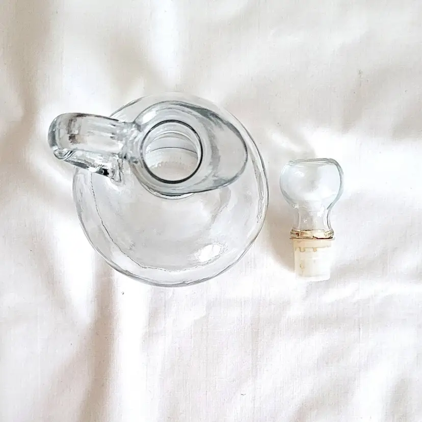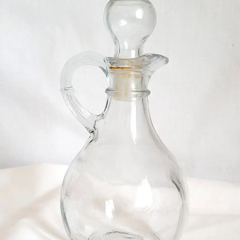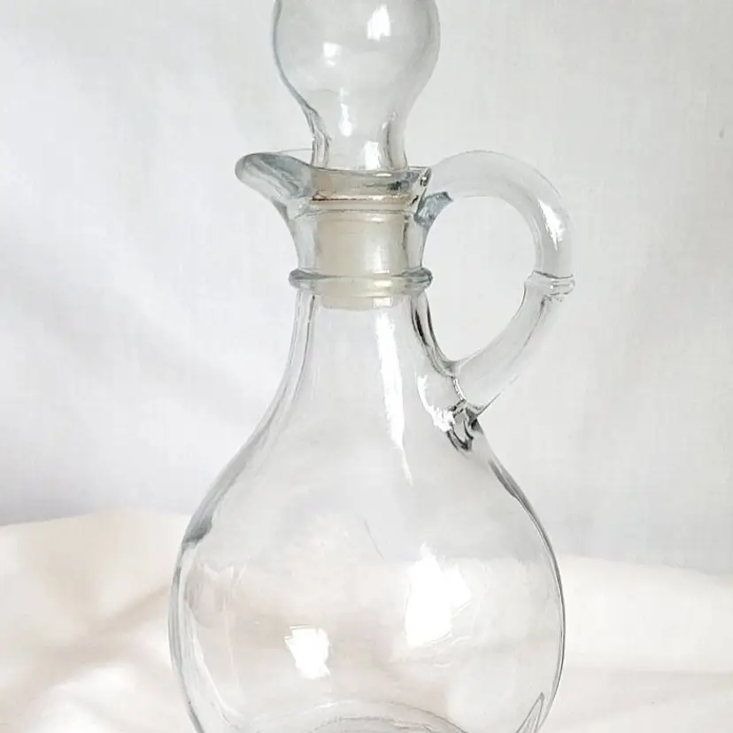Clear glass cruet featuring a classic silhouette and matching glass stopper. Standing 7 inches tall with the stopper in place, it’s perfect for oils, vinegar, dressings, or decorative display. The glass is bright and transparent, adding a simple, timeless touch to any kitchen or dining space. In excellent condition and ready to use or collect.