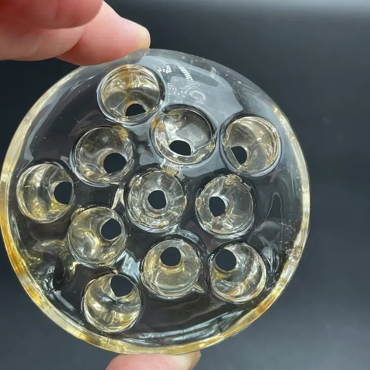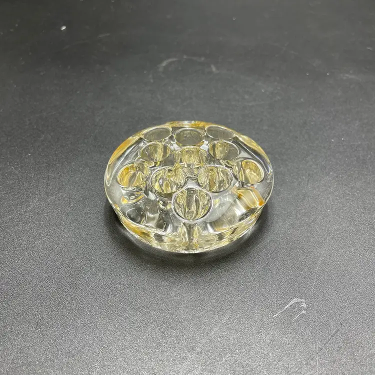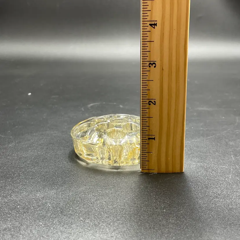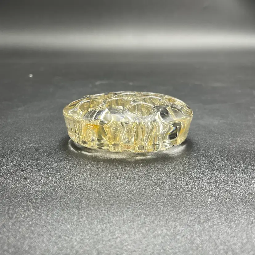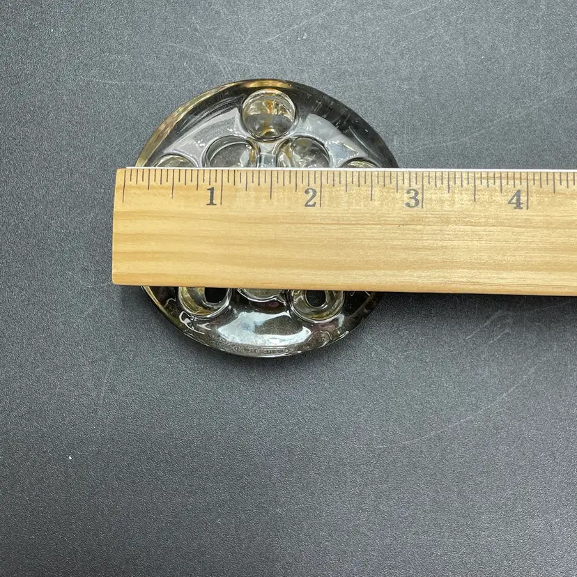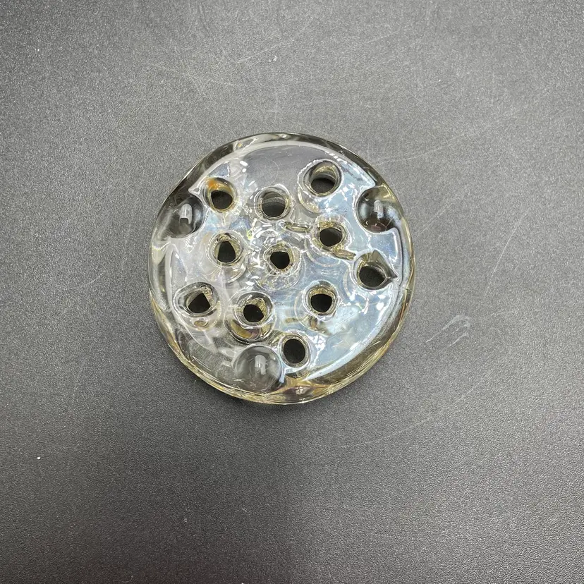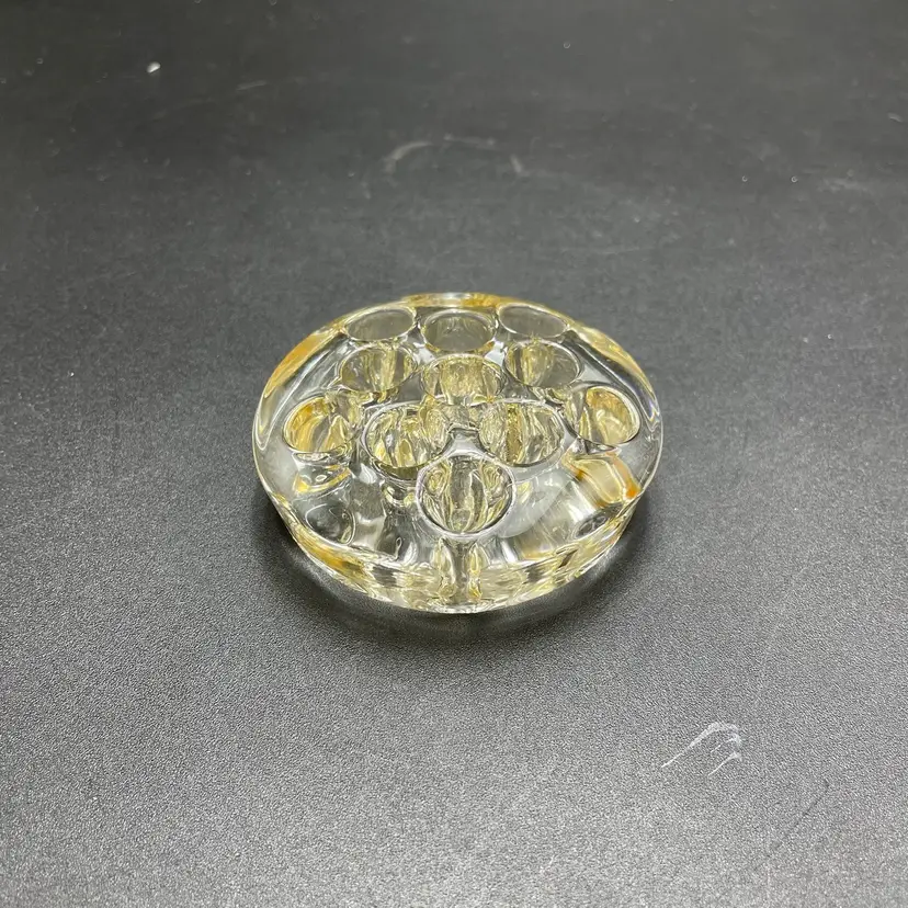 This is a vintage clear glass 11 hole flower frog. Measures approximately 3" across x .75" tall. The glass has yellowed with age. No major flaws.