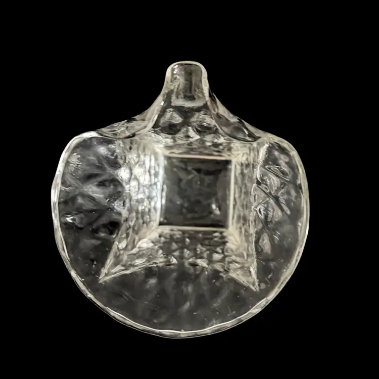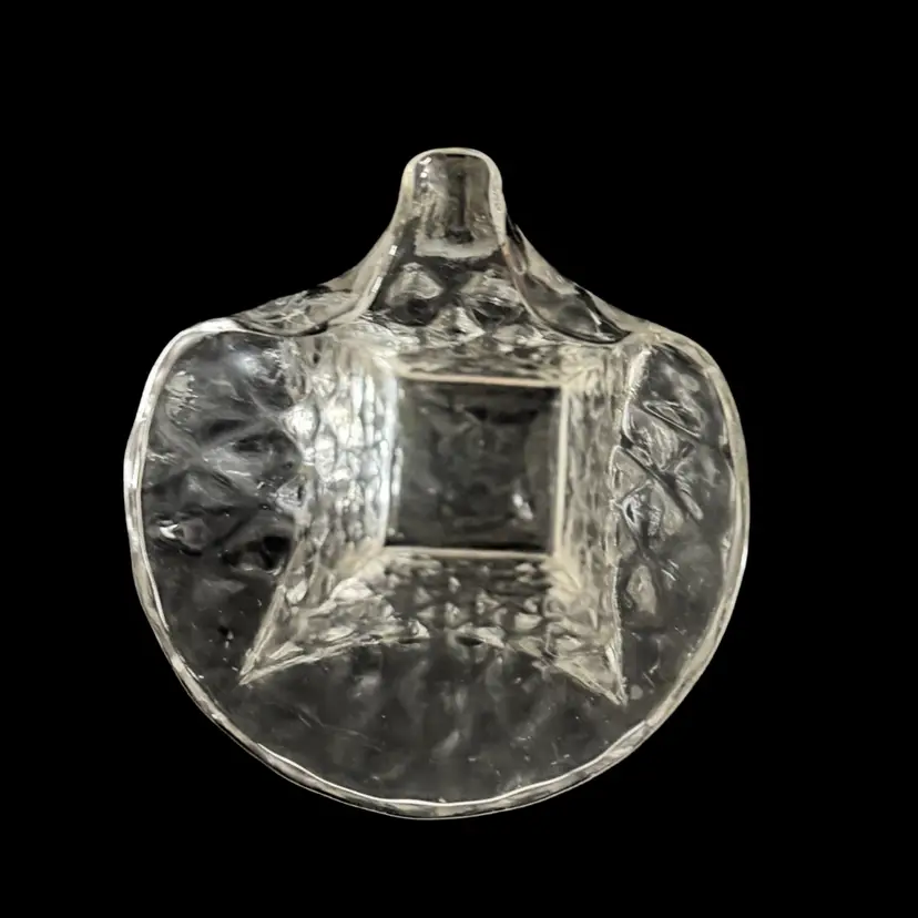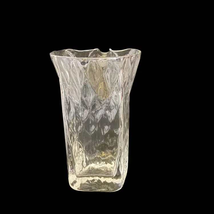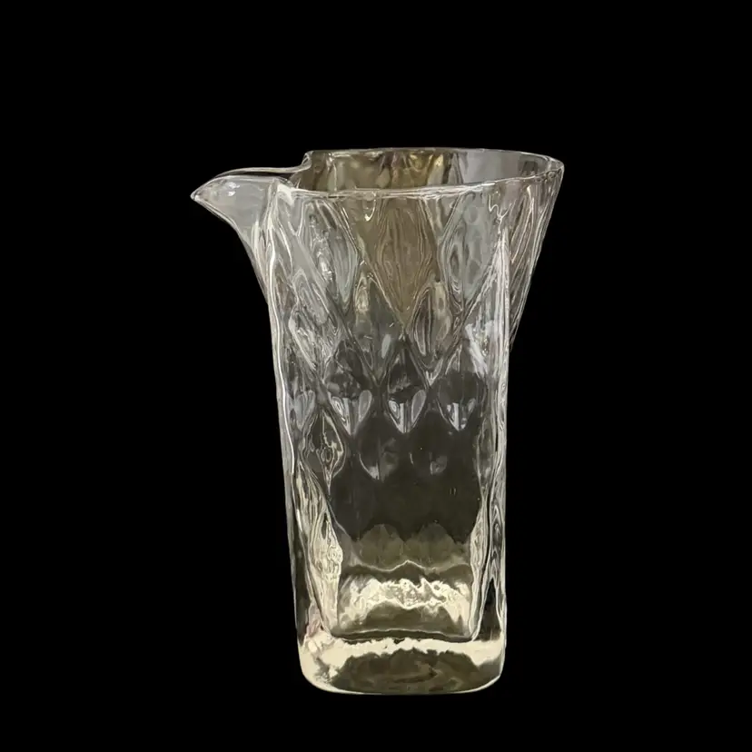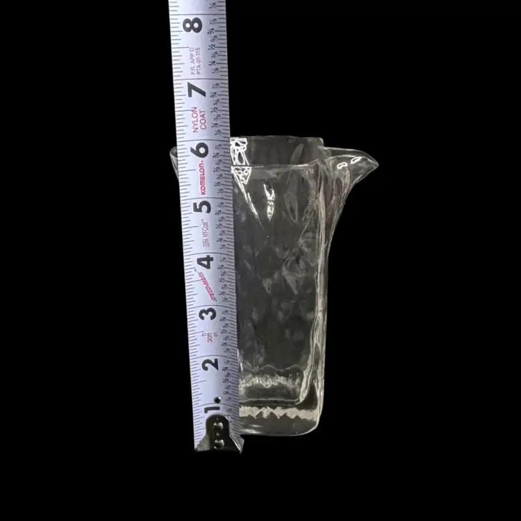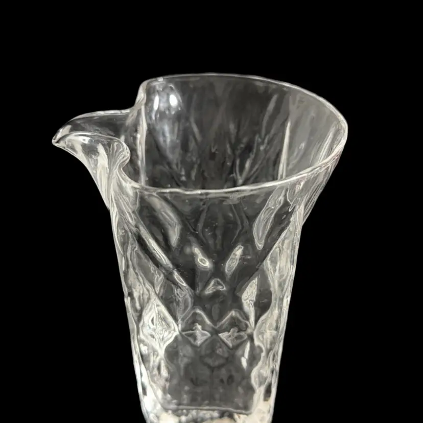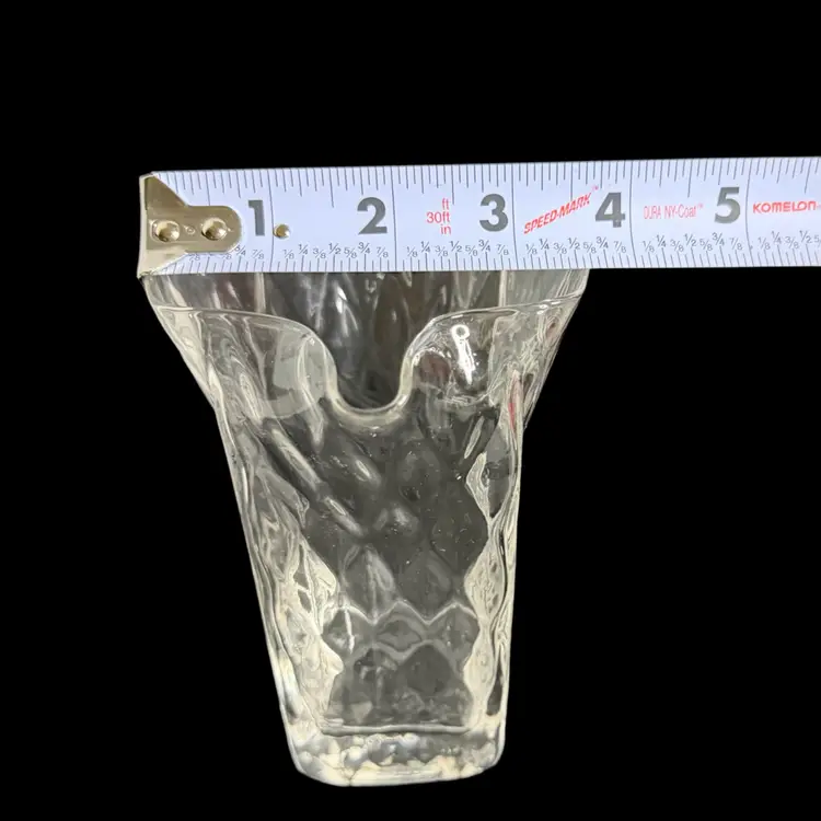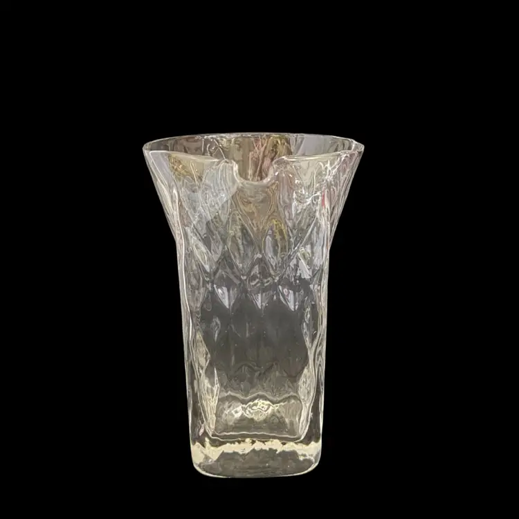 Beautiful clear quilted diamond optic glass pitcher or vase. Maker unknown, it’s a unicorn! Light glow with a 365 UV Light.