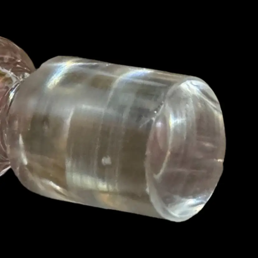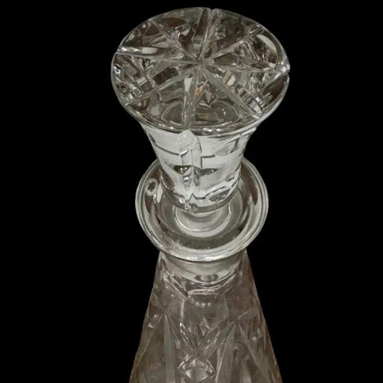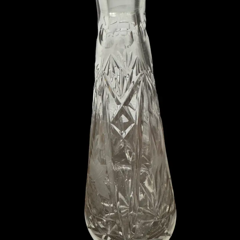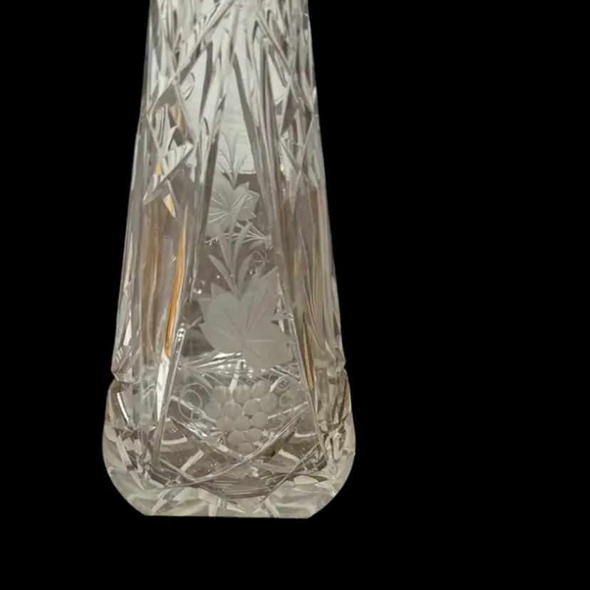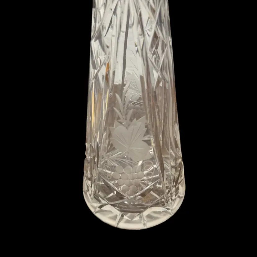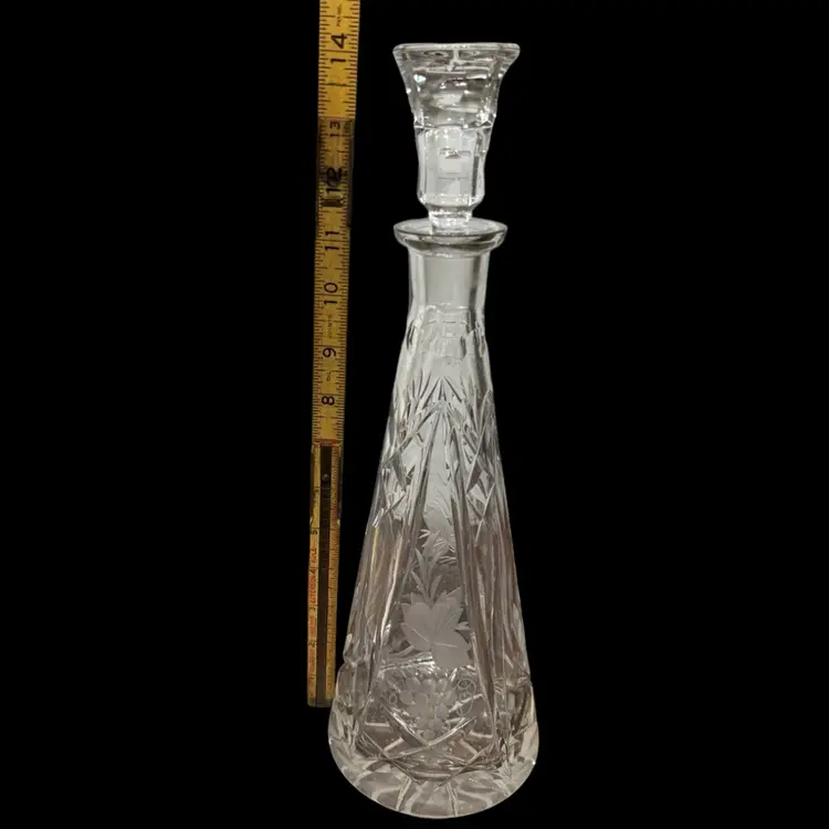 Great condition. Stopper has a flea bite on the bottom edge of glass and inside on the underside. I don’t feel it at all but the rest is perfect. 14” tall. Grape and grapevine design.