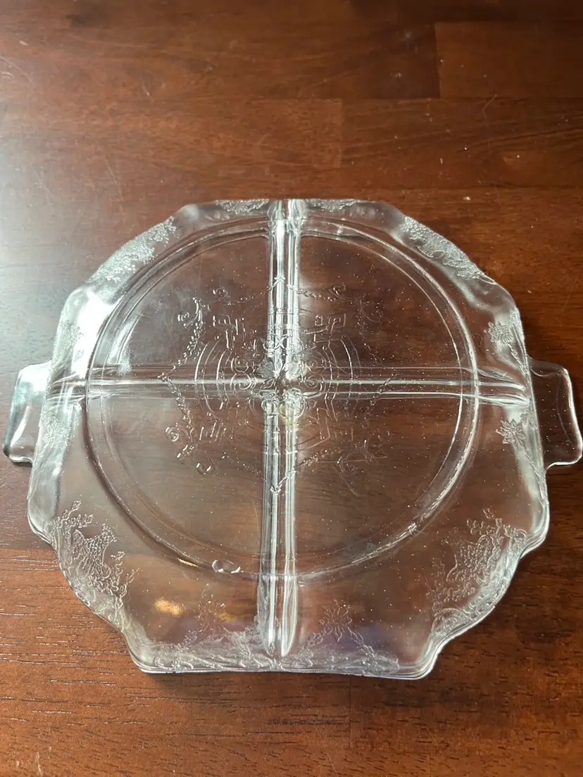 The Indiana Glass Company, founded in 1904 in Dunkirk, Indiana, was a prolific producer of Depression glass. Their "Lorain" pattern, often referred to as "Lorain Basket," is characterized by its delicate floral motifs and basket-like elements, typically rendered in clear or colored glass. This particular divided relish dish showcases the typical aesthetic of the era, combining functional design with decorative embossing.