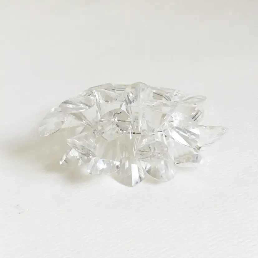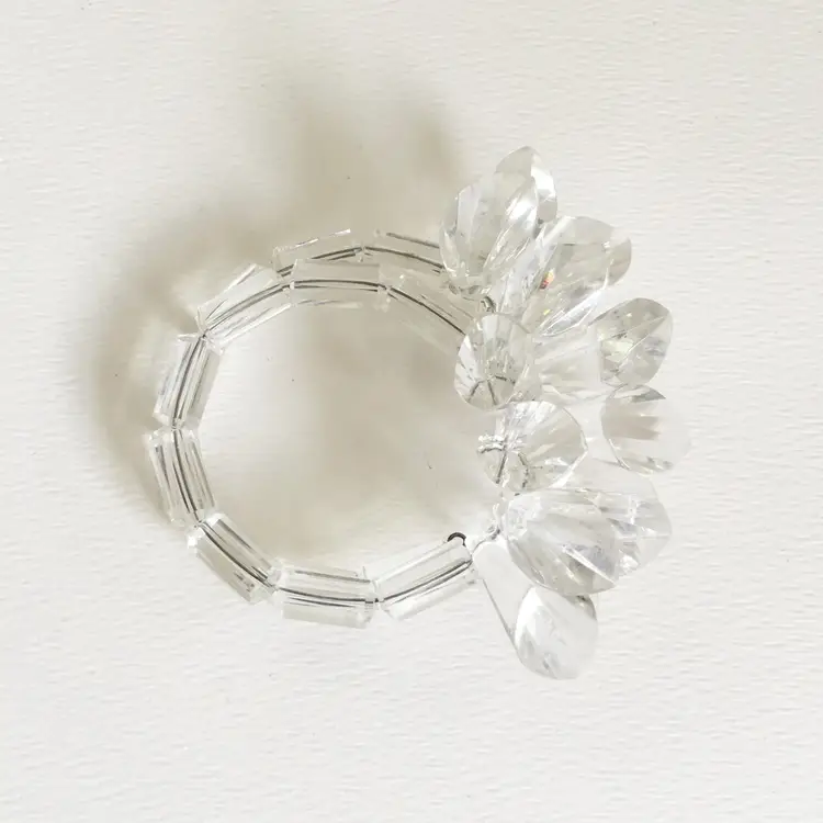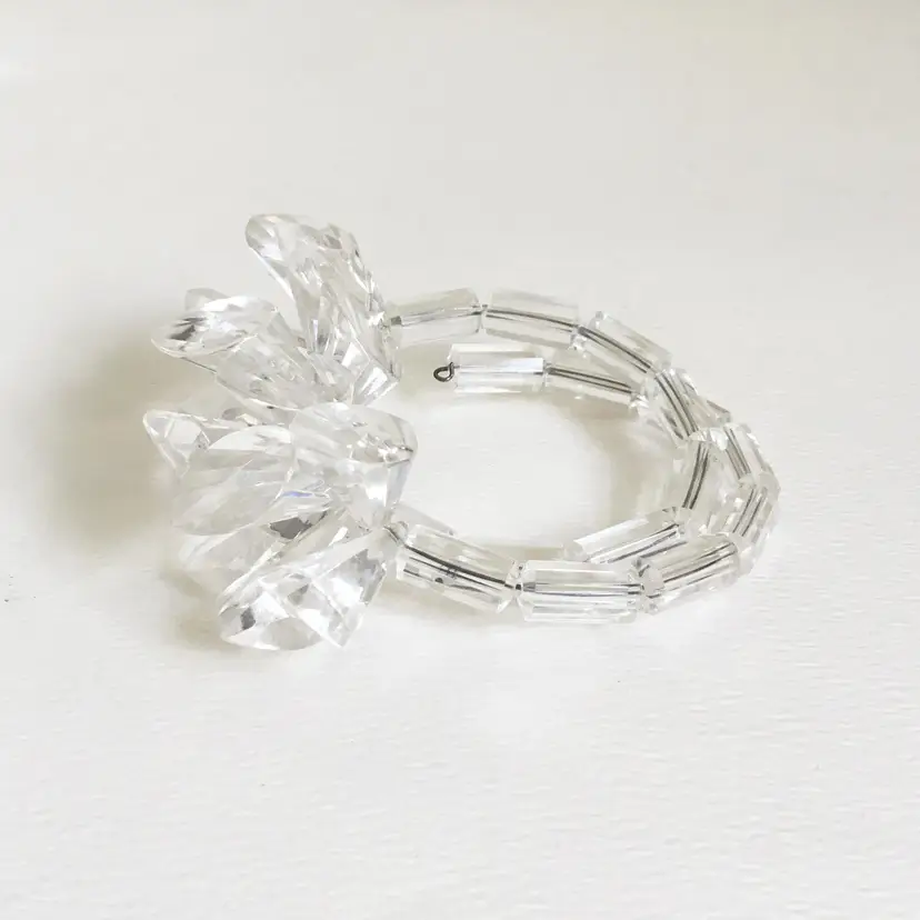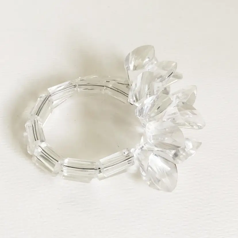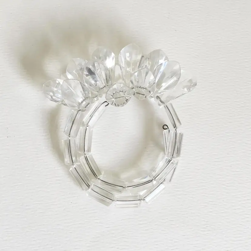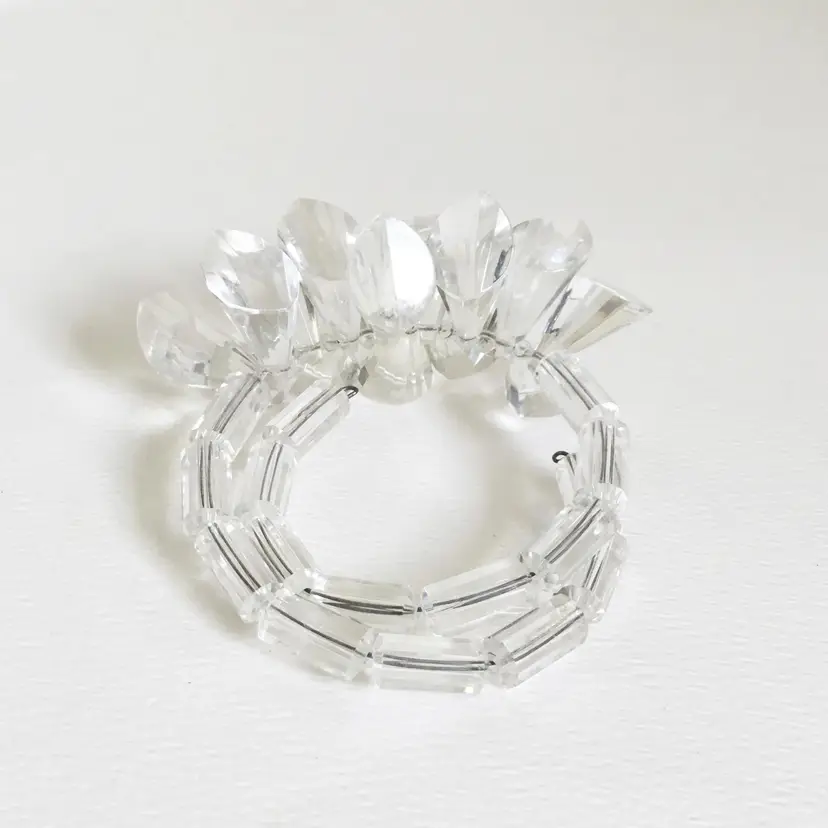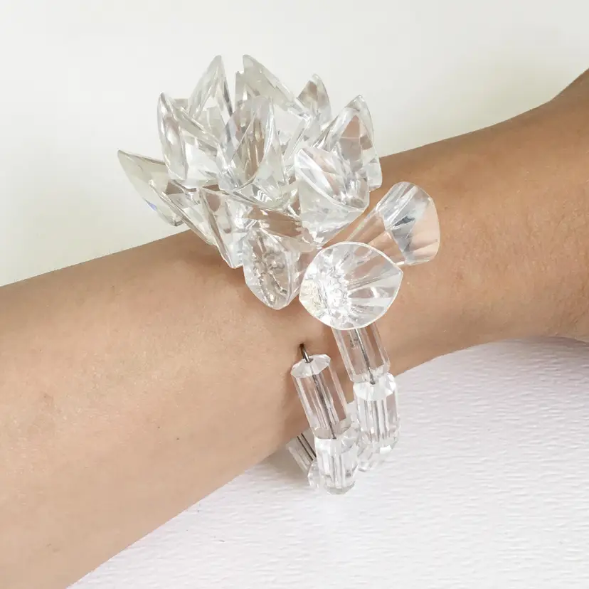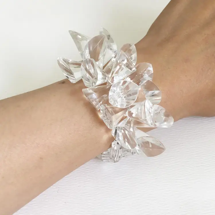 This coil bracelet features conical faceted clear plastic beads and smaller cylindrical ones on the band.