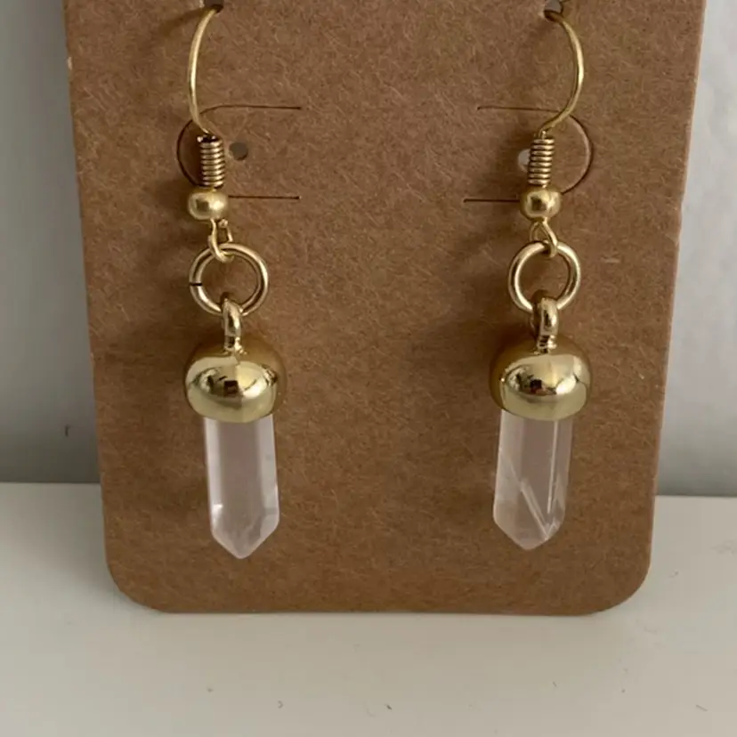 Vintage clear quartz point drop earrings. Clear quartz is said to absorb and nuetralize negative energy and emotions. The earrings measure 1/4” across and drop down 1 3/4”.