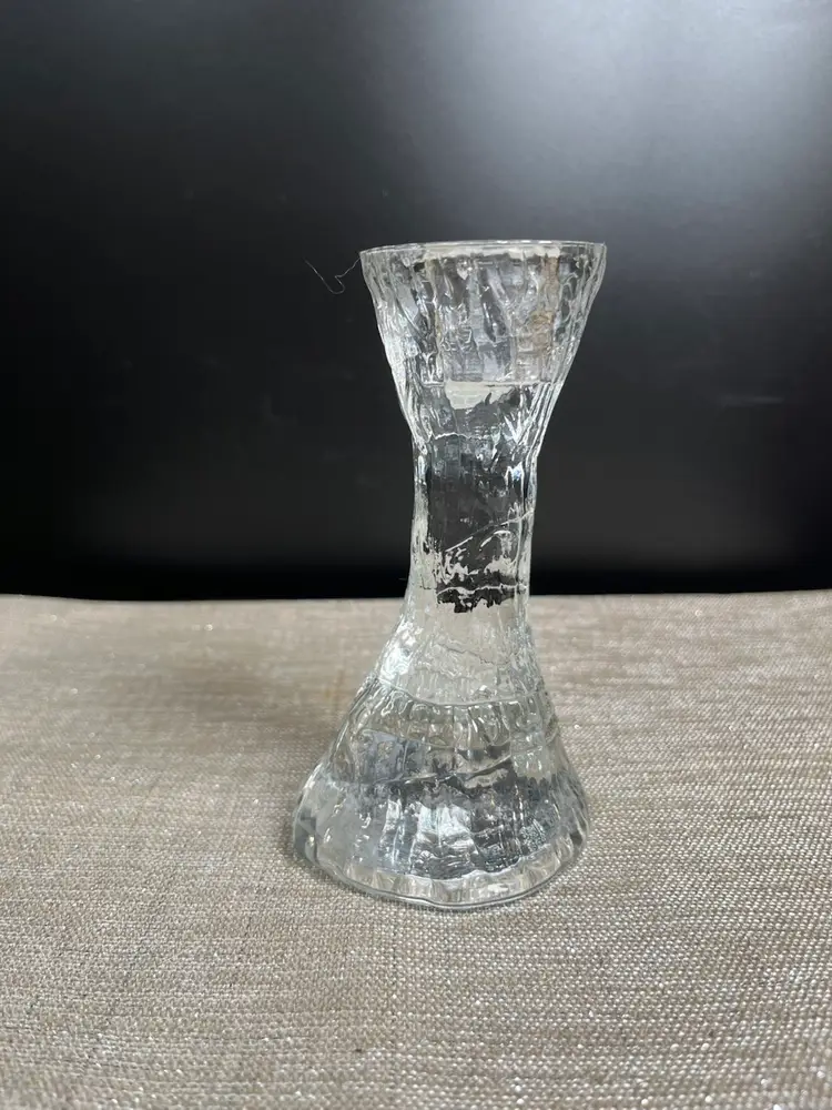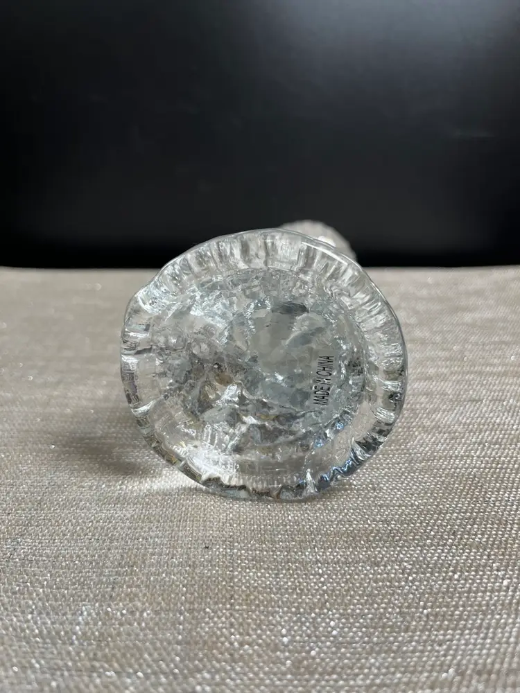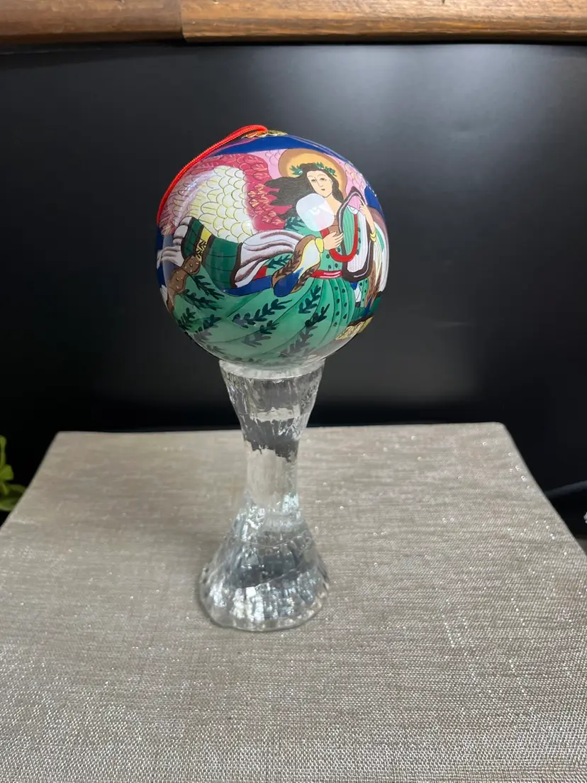 This is really pretty. Resembles a thick piece of icicle. Use as a riser for a large marble, paper weight, orb or ornament! Refer to pic-Christmas ornament is not included. Has a "Made in China" sticker on bottom. This has no chips, cracks or bruises. Is in good condition. It measures approx 5"H, 2.5" diameter at base, 12.6 Oz