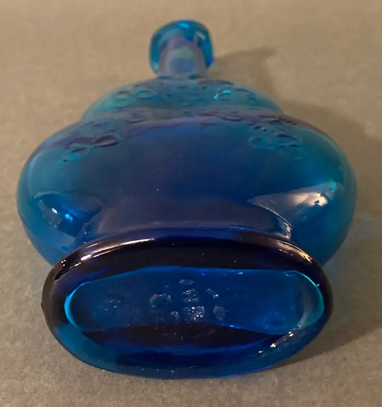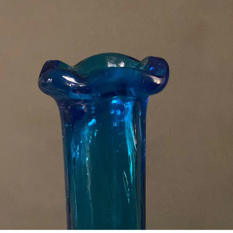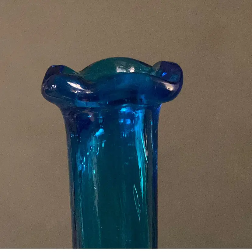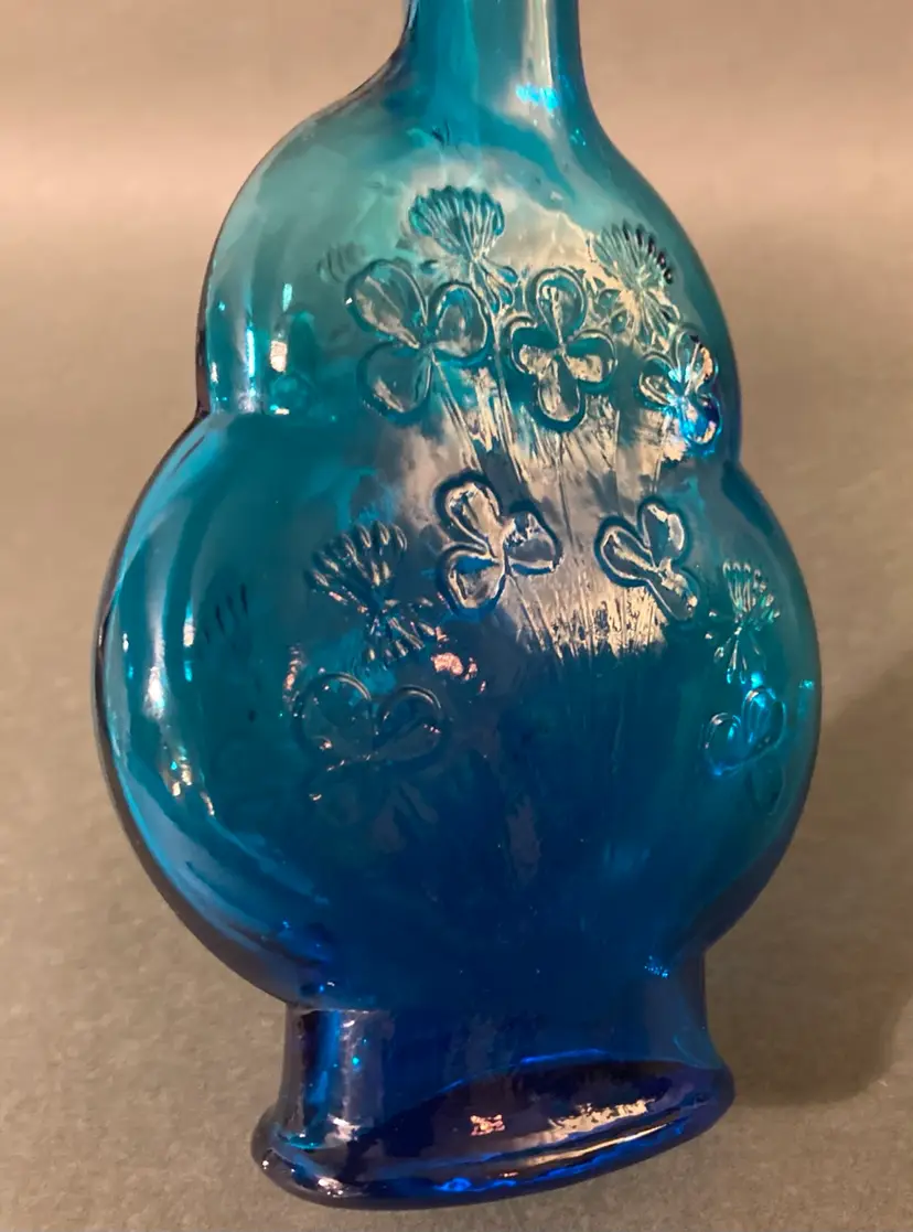 I believe this pretty blue vase was made by Clevenger Bros. It is marked “CB” on the bottom. It is about 8.25” tall and has an embossed three-leaf clover design on both sides. No chips or cracks.