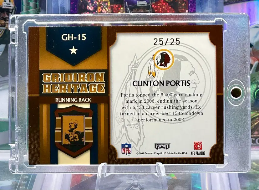 Clinton Portis 2007 Donruss Playoff Prestige BOOKEND Bookended FINAL LAST PRINT Sepia Bronze Gridiron Heritage Serial Number Numbered #’d #d 25/25 Parallel Holo Foil Refractor Insert SP Short Print Washington Commanders Redskins Broncos University of Miami Hurricanes RB Running Back Offense Offensive Player Rare NFL Football Card