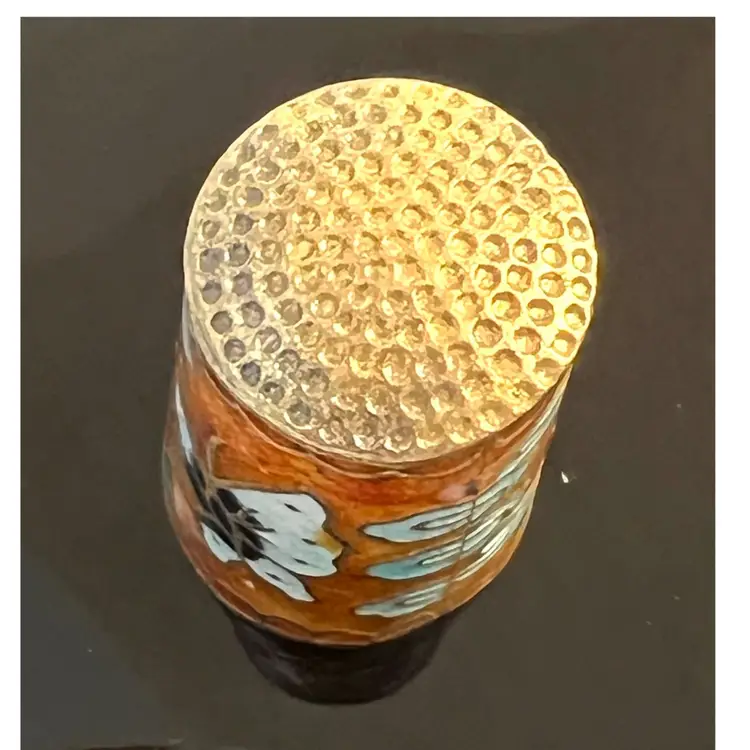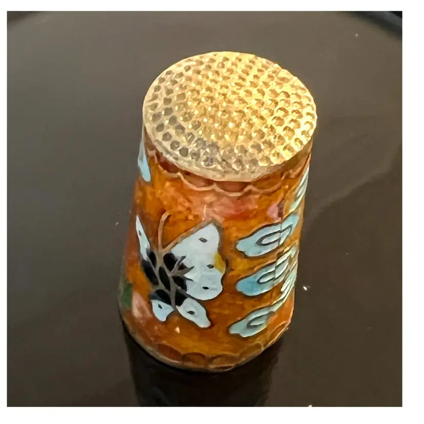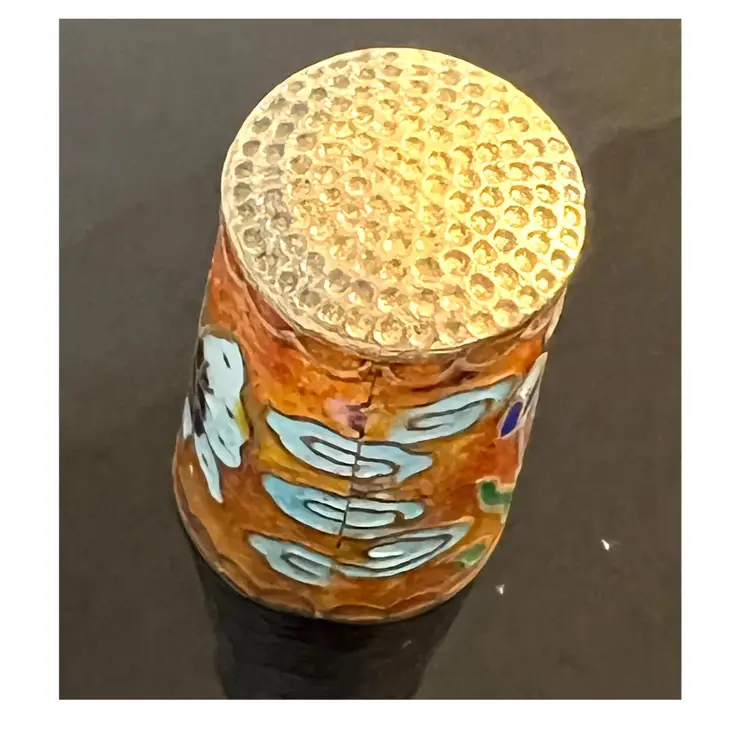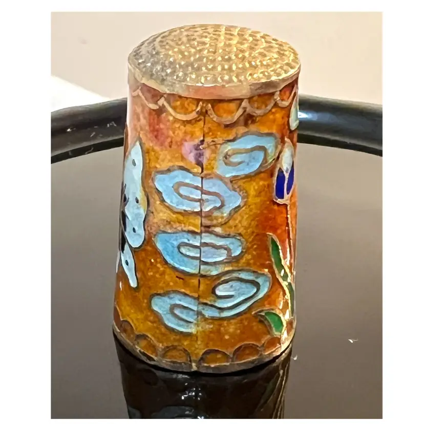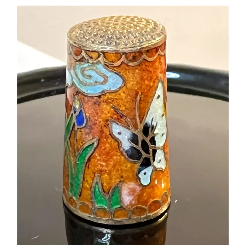 Cloisonne Collectible Enamel Metal Sewing Thimble Butterfly Flowers 1.1 in Height, 0.8 in Diameter. Some discolorations are visible (SEE PHOTOS)