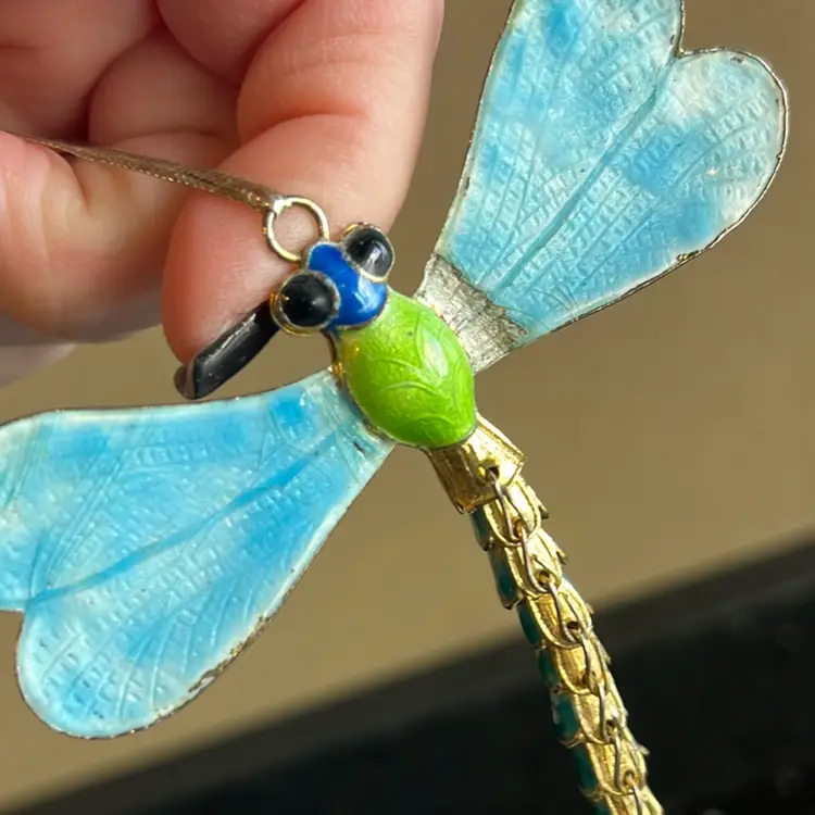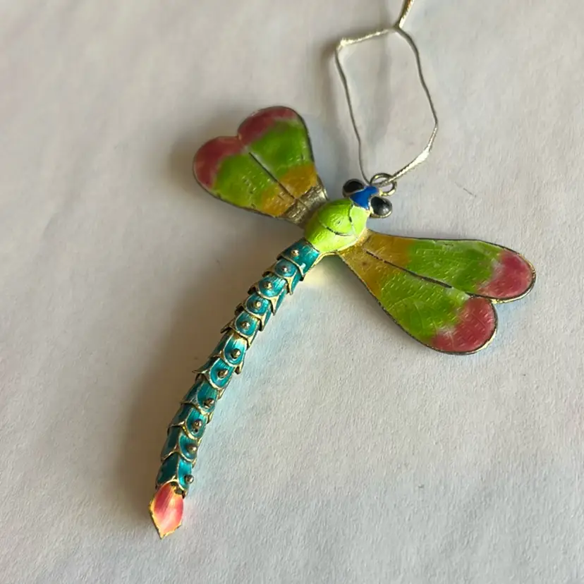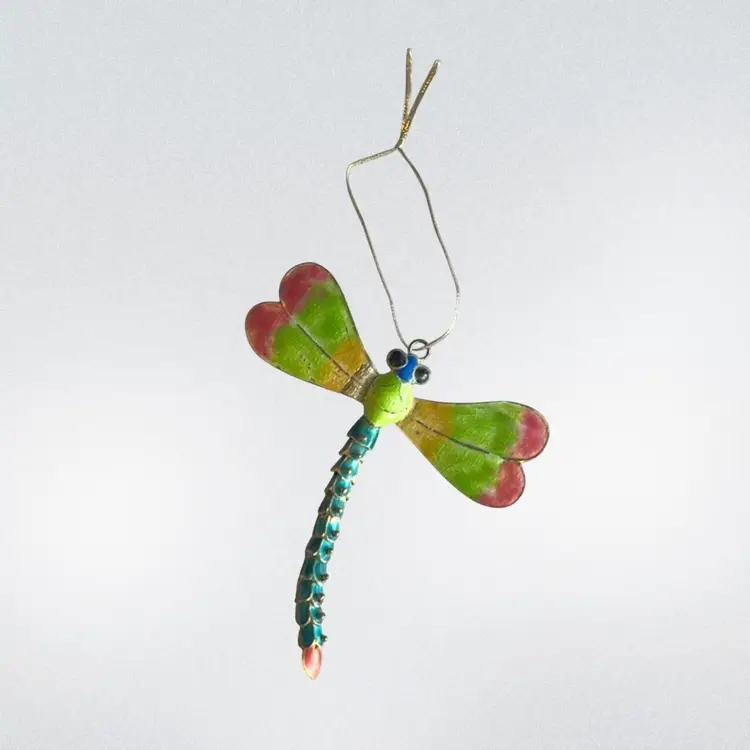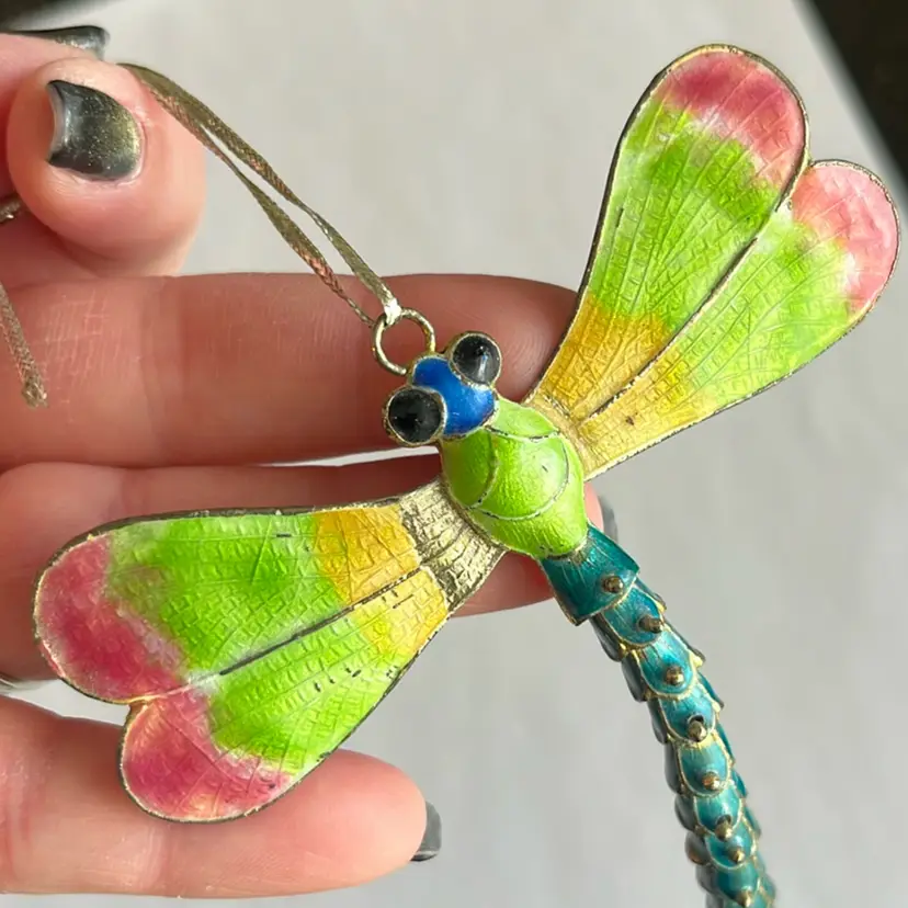 Shows some wear on wing towards body see pic. Beautiful multi color dragonfly ornament. Good vintage condition! Approx: 3.5” L x 3.25” w