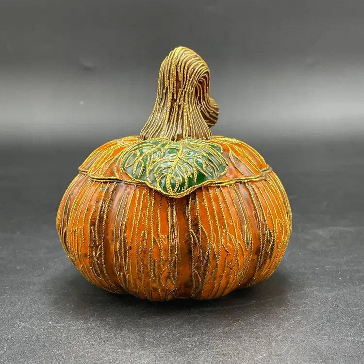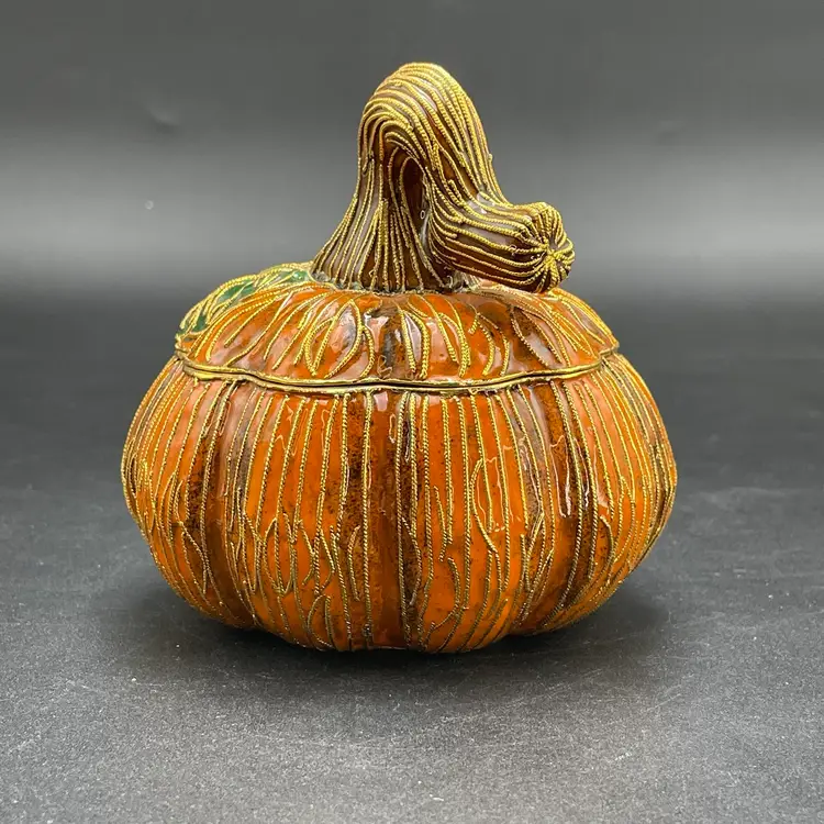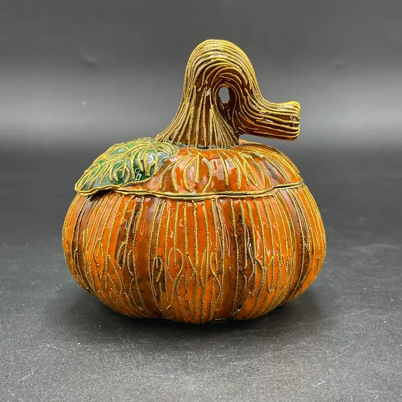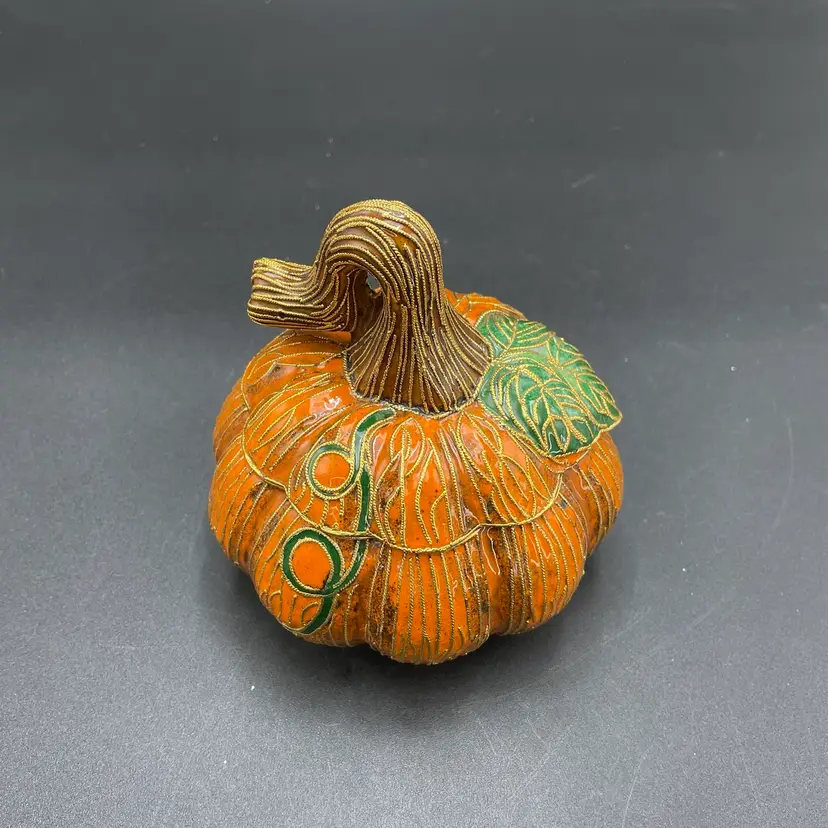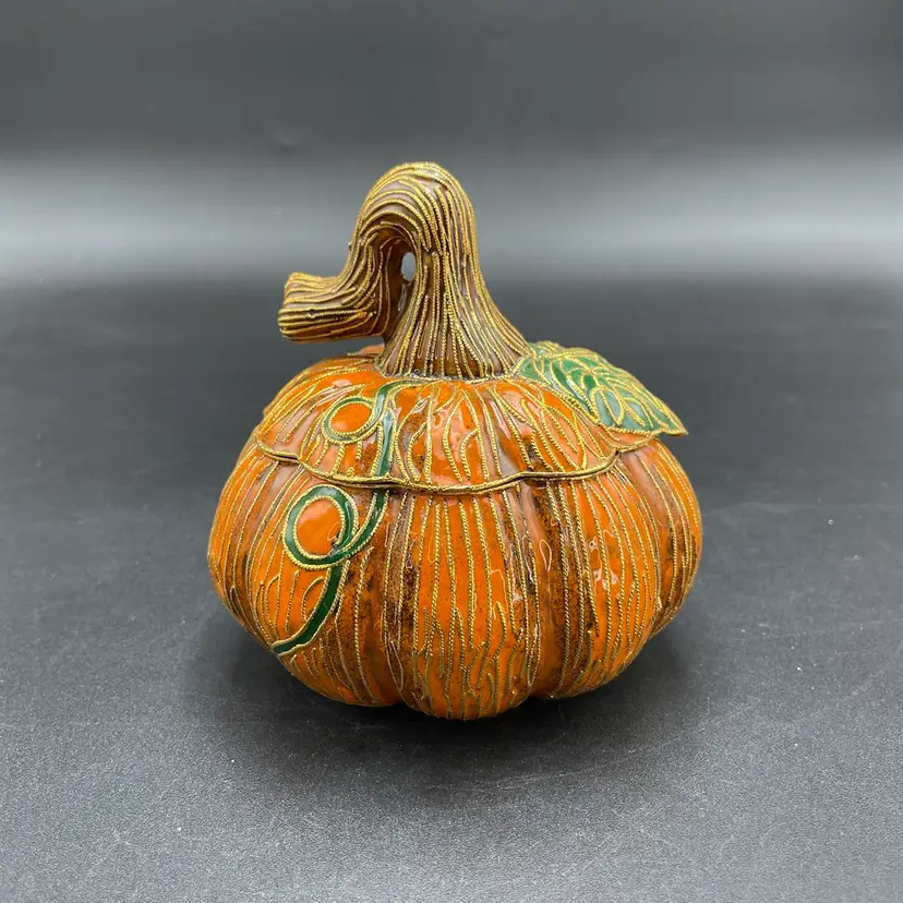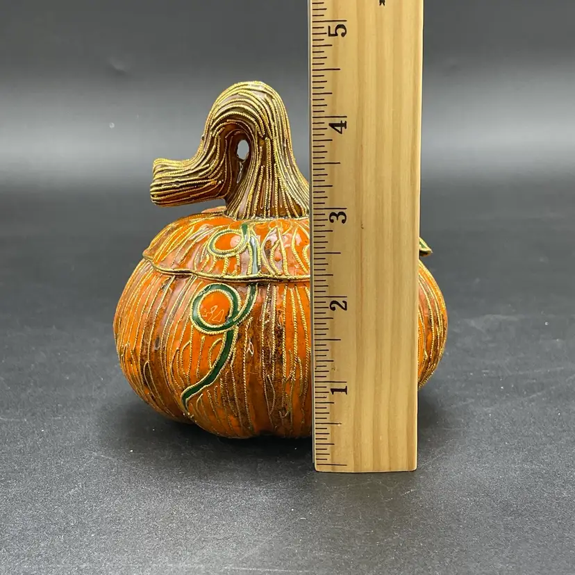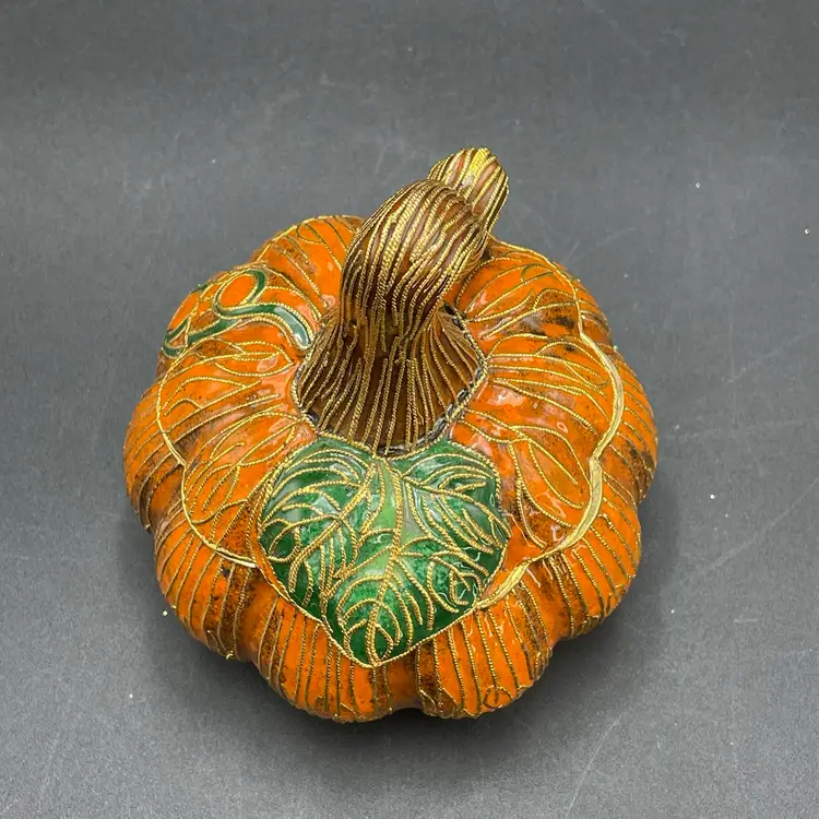 This is a cloisonné enamel on brass lidded pumpkin trinket box. Measures approximately 4.5" tall x 3.5" across. No major flaws.