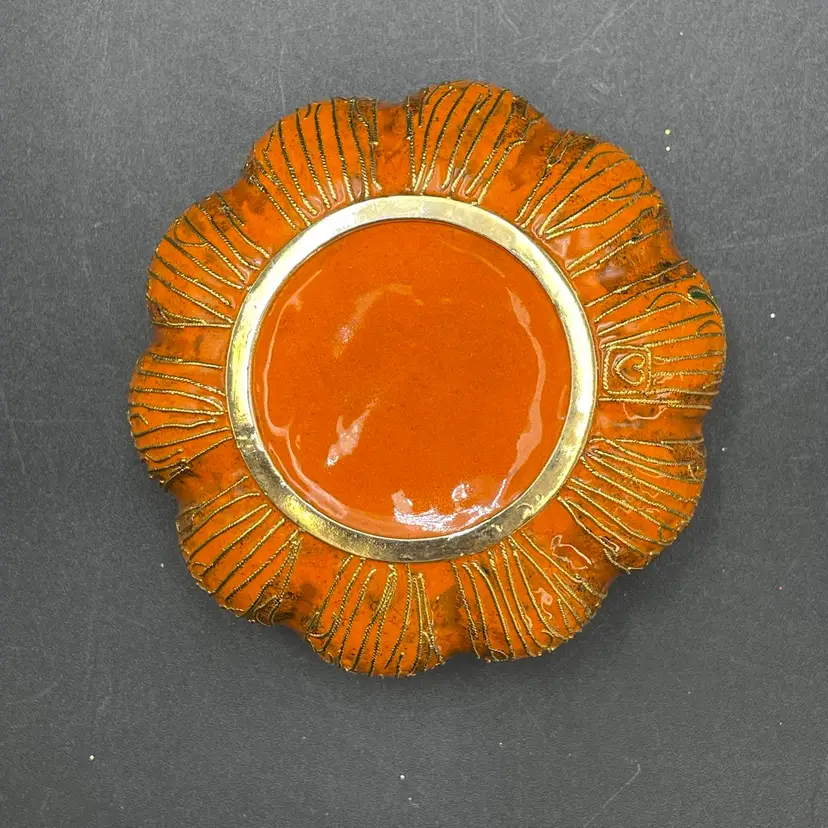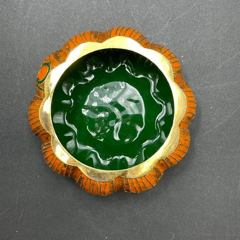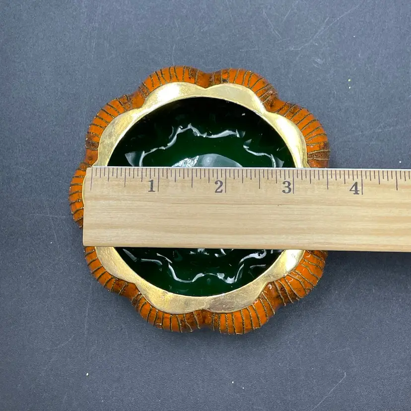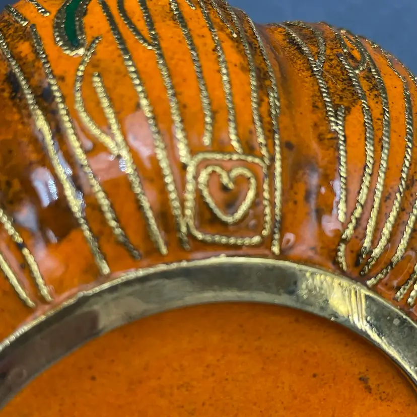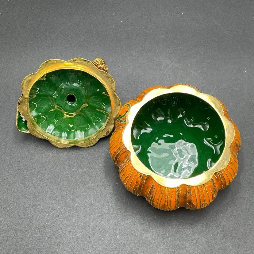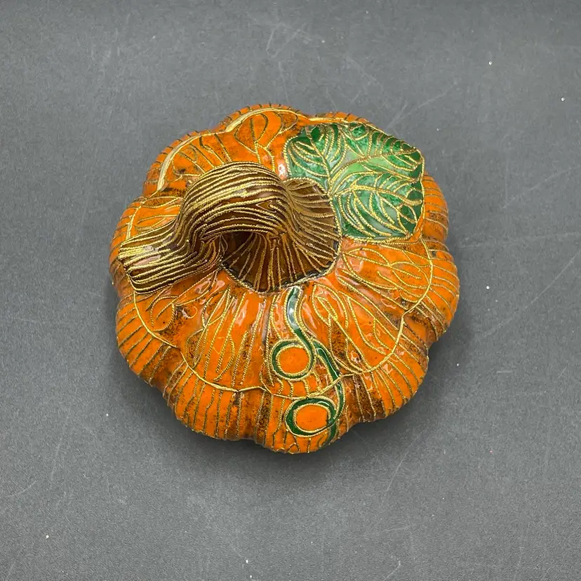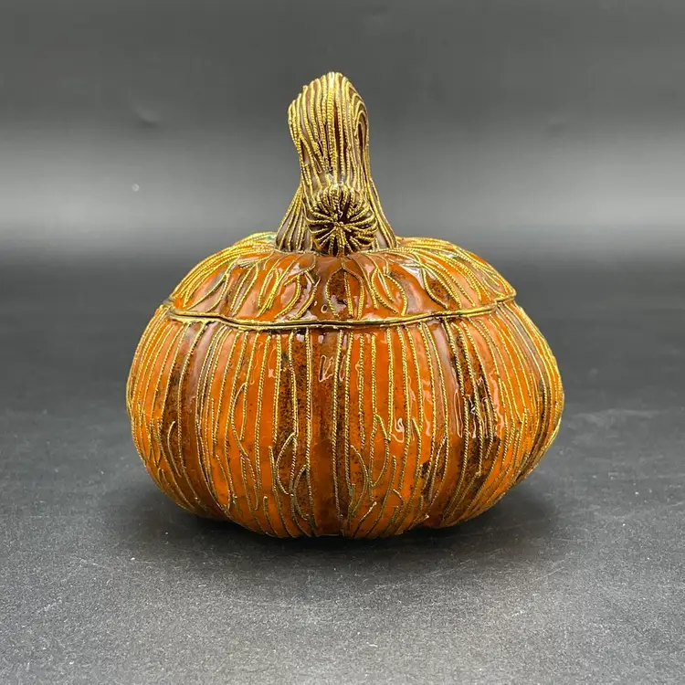 This is a cloisonné enamel on brass lidded pumpkin trinket box. Measures approximately 4.5" tall x 3.5" across. No major flaws.