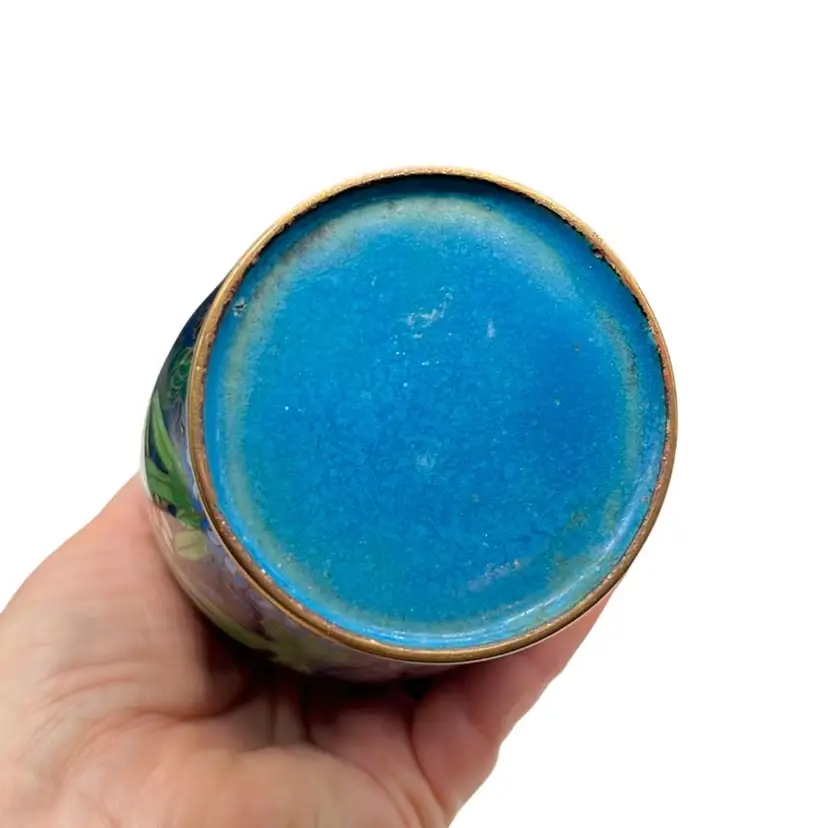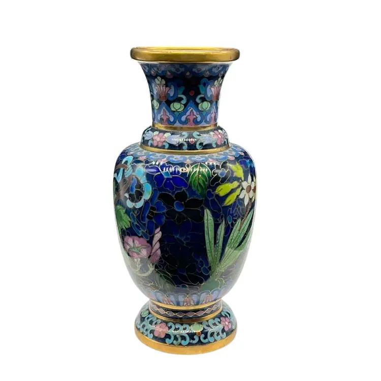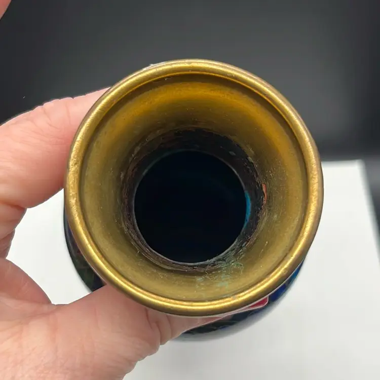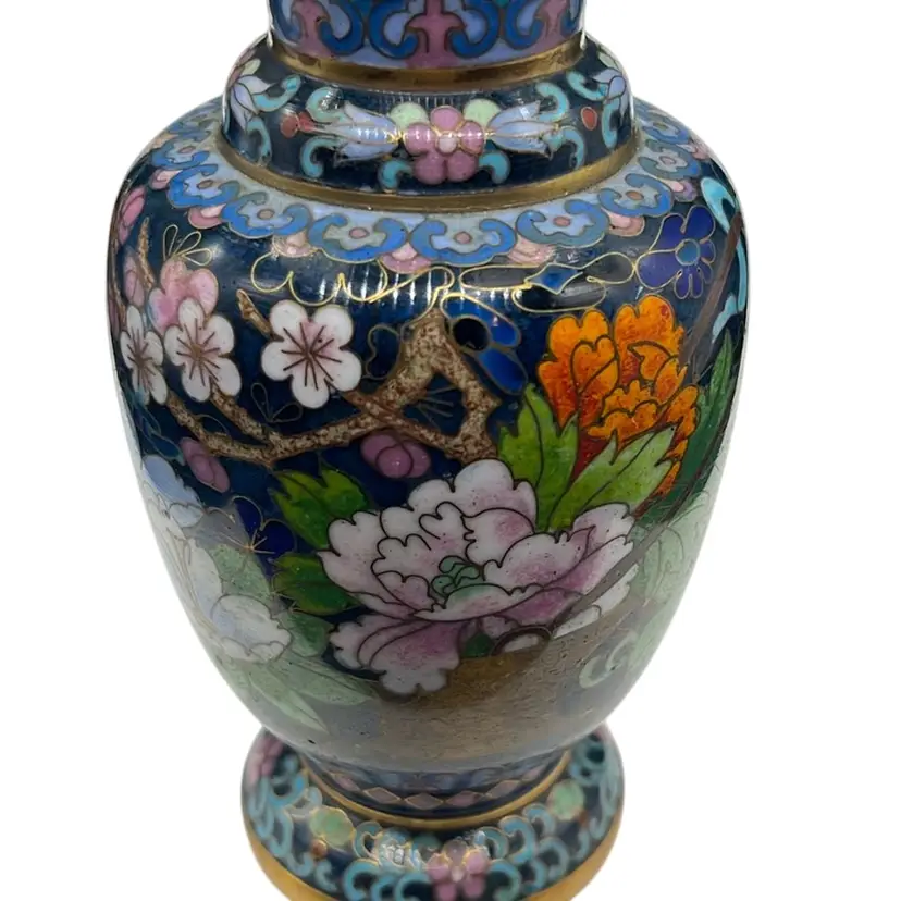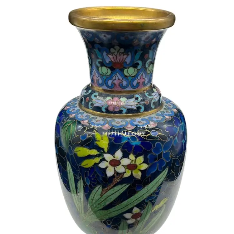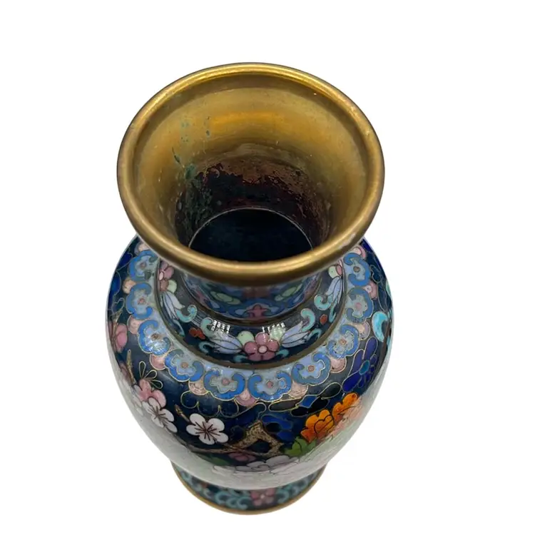 Beautiful vintage cloisonné enamel vase featuring a rich blue background with detailed floral and basket motifs. Shows minor wear and in great condition! Approx: 6” h x 3” w