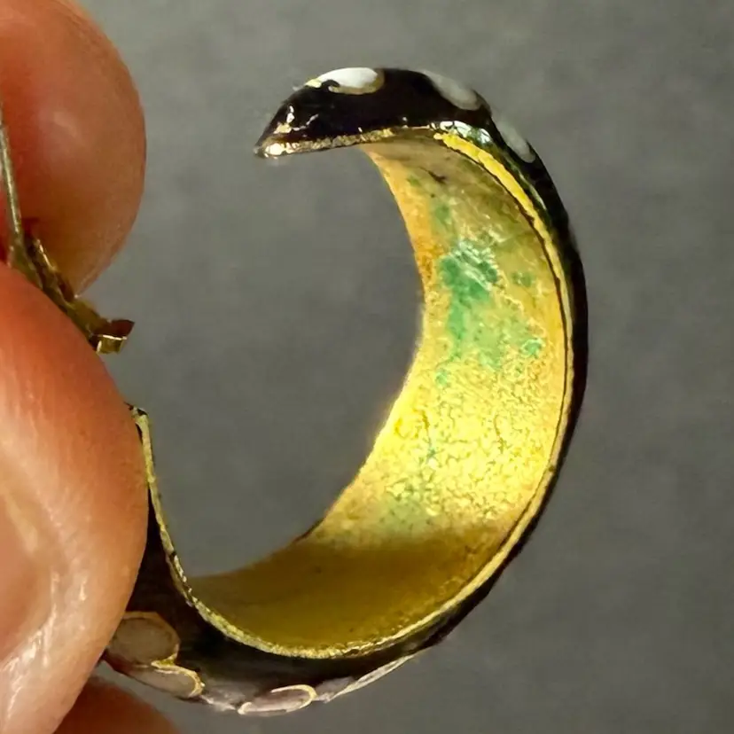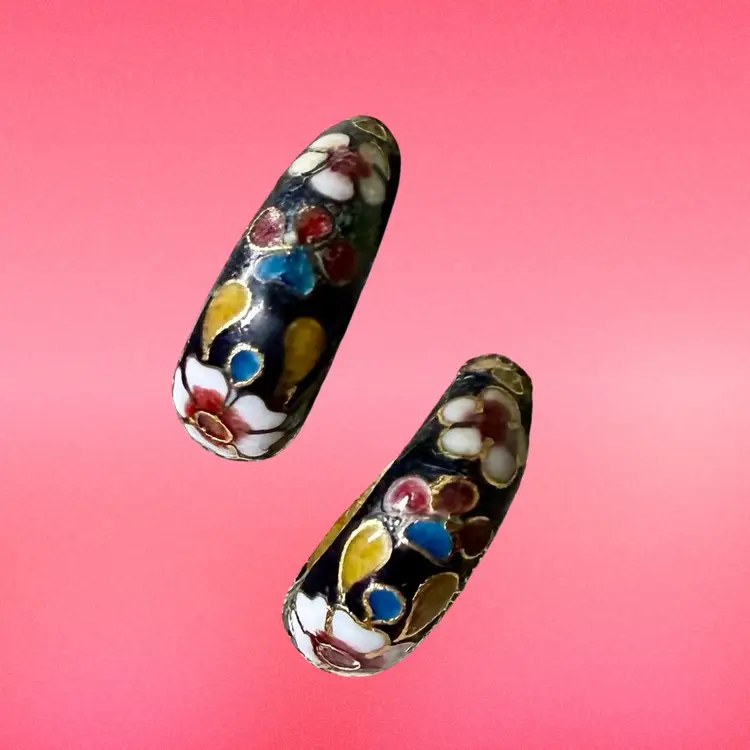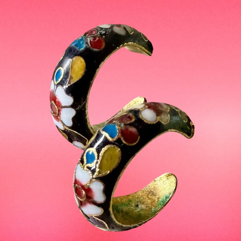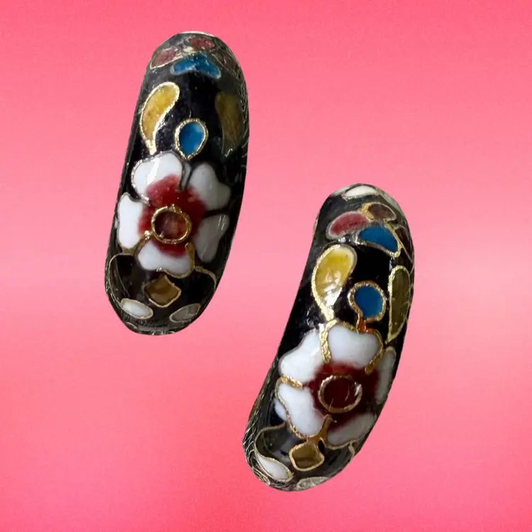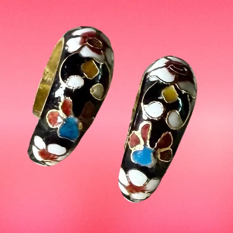 7/8" hoop size, 0.25" width of hoop.Floral cloisonné design - some of the gold tone metal (backside) is tarnished green. For pierced ears.