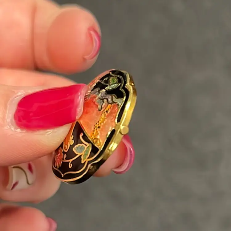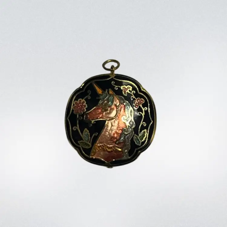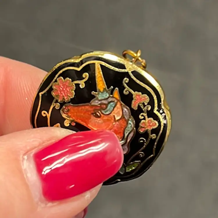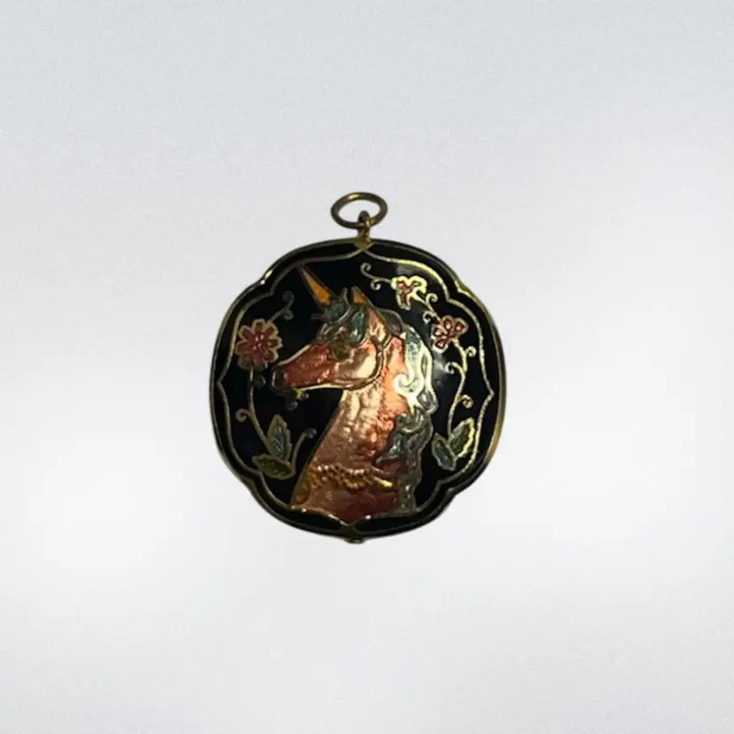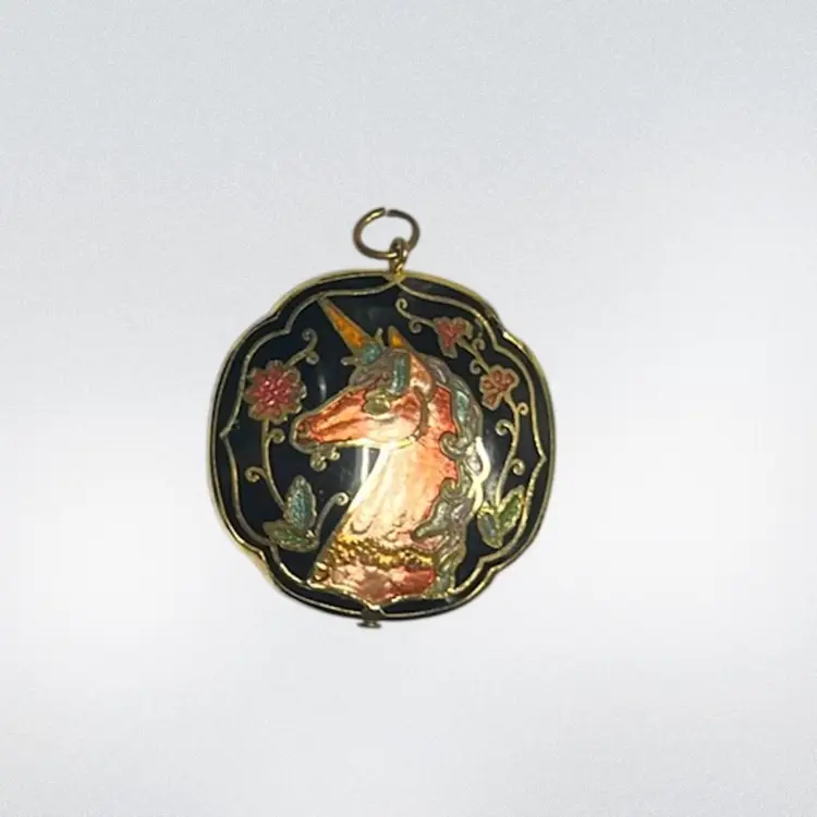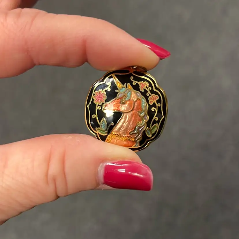 Beautiful unicorn beauty in a cloisonné design! Gold tone. Approx: 1”