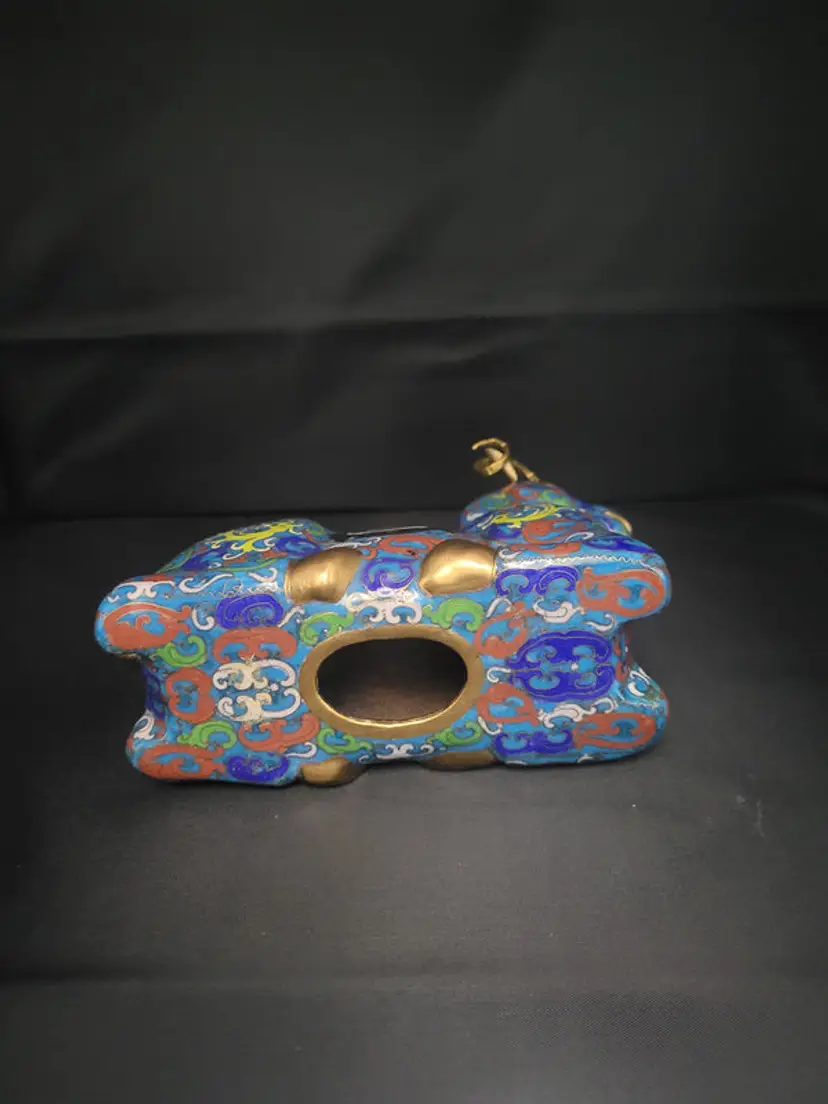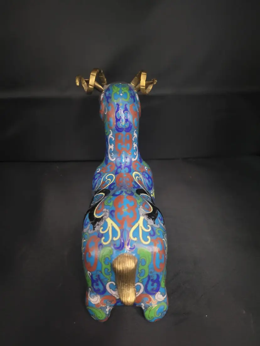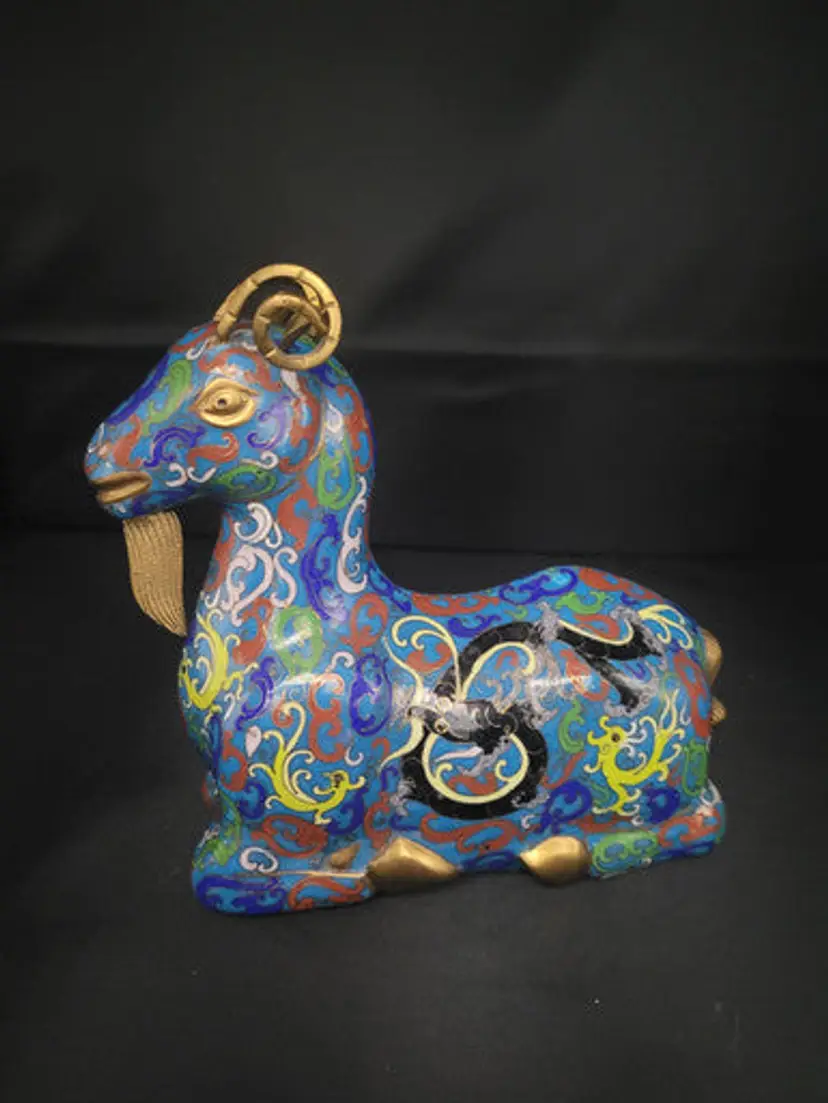 This striking cloisonne ram showcases masterful craftsmanship with its vivid, jewel-toned enameling. Standing 7½" tall and 7½" long, the kneeling figure commands attention as a sophisticated decorative accent. Its intricate detailing and luminous color palette make it an ideal focal point for discerning collectors or those seeking an artisanal conversation piece that elevates any interior setting.