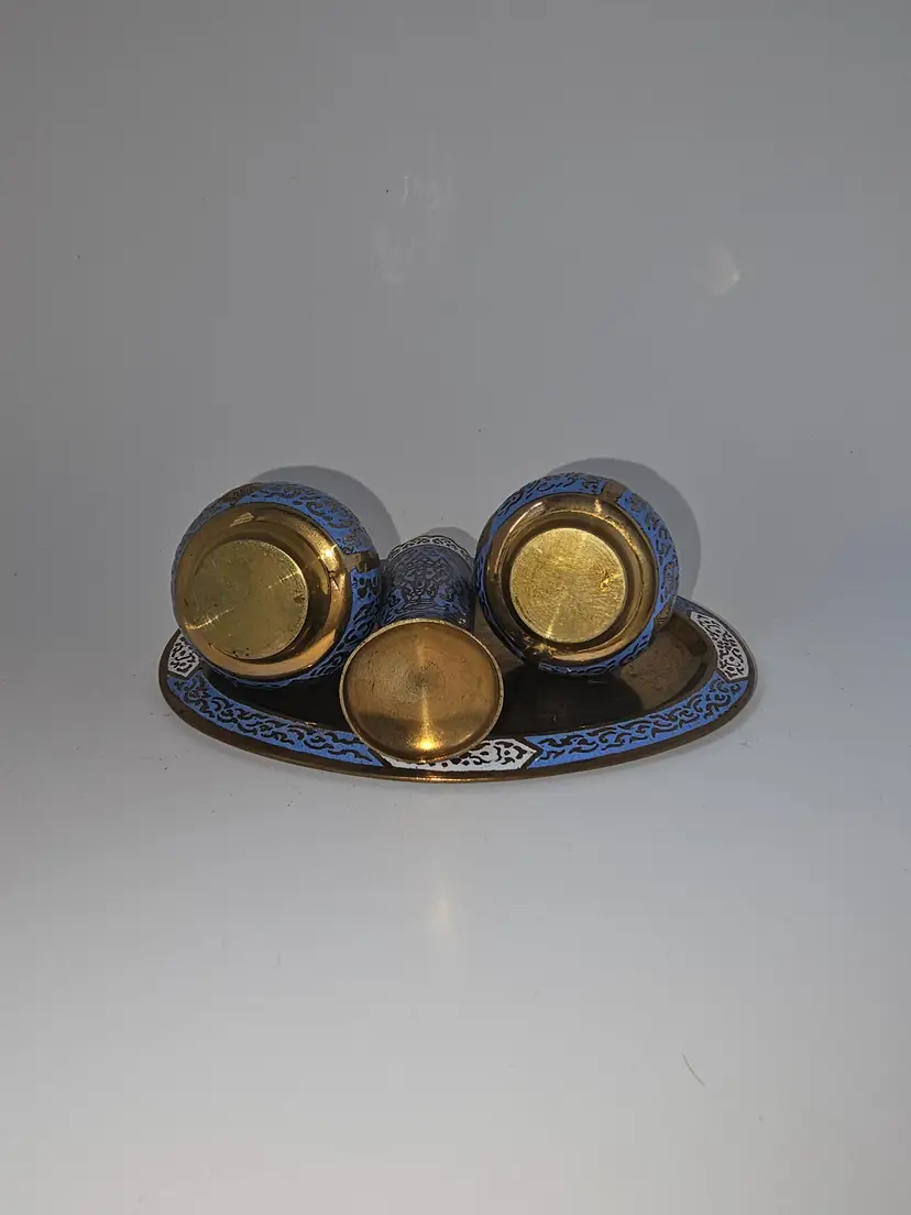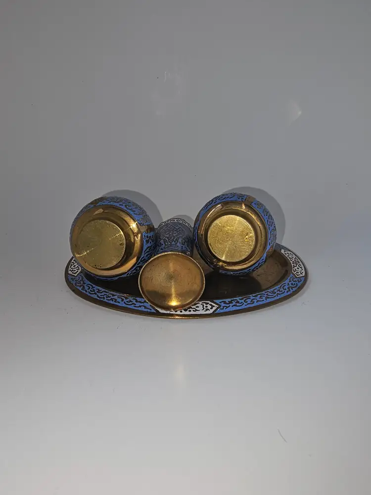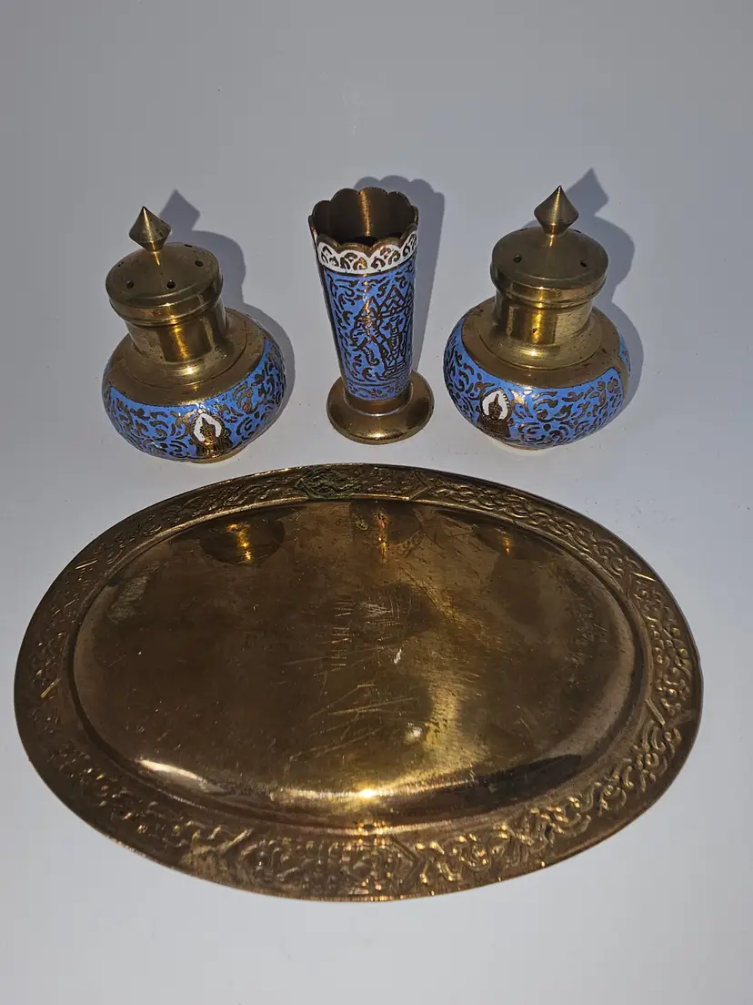 Stunning cloisonne salt & Pepper, toothpick holder and tray. All in great condition. Made in Thailand and measures 5"L x 2.75"H