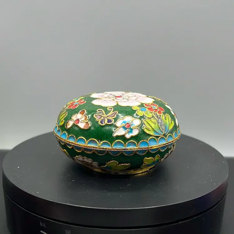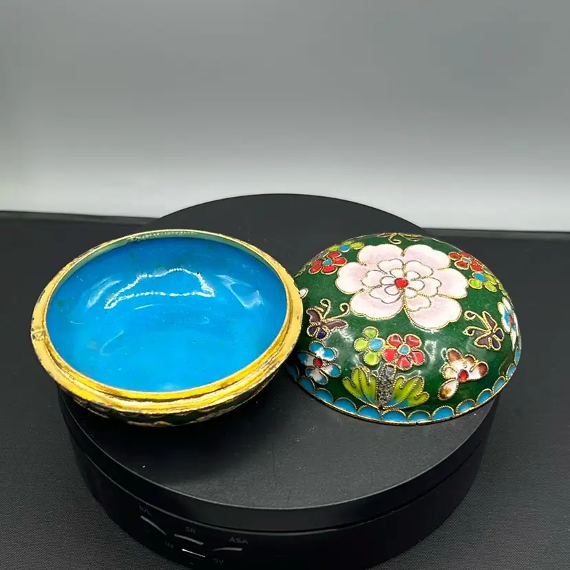 Chinese cloisonné enamel covered box, a decorative collectible item. Cloisonné is an ancient metalworking technique where colored enamel is held in place by metal strips or wires.