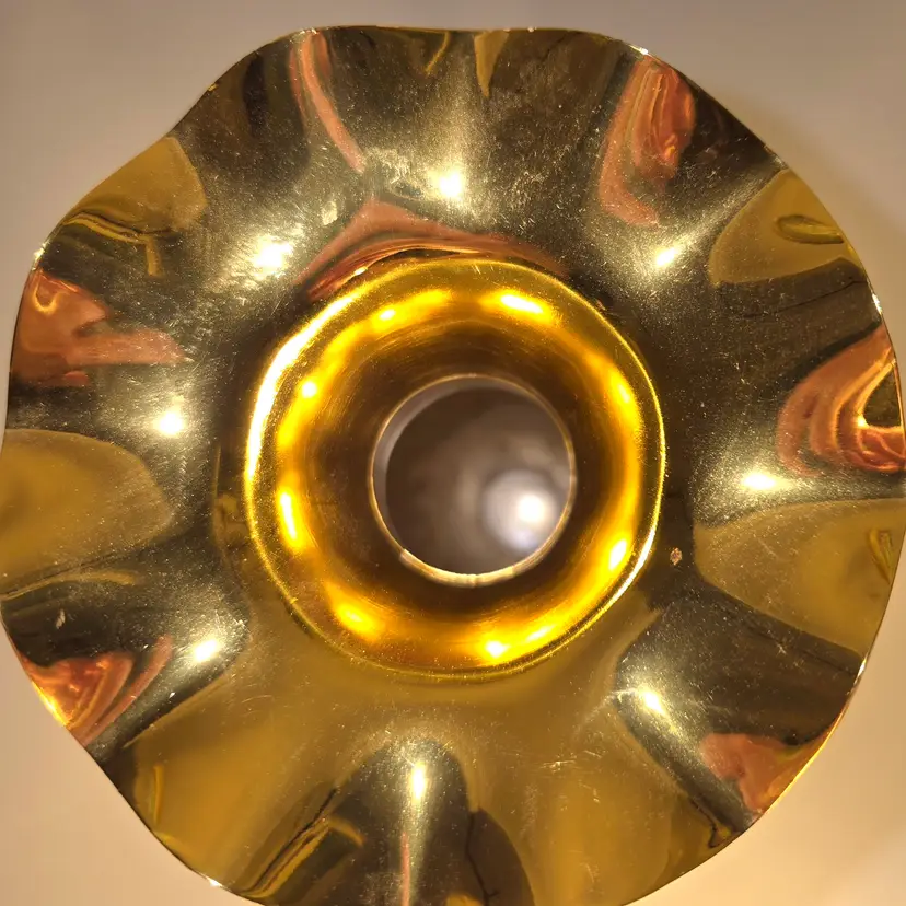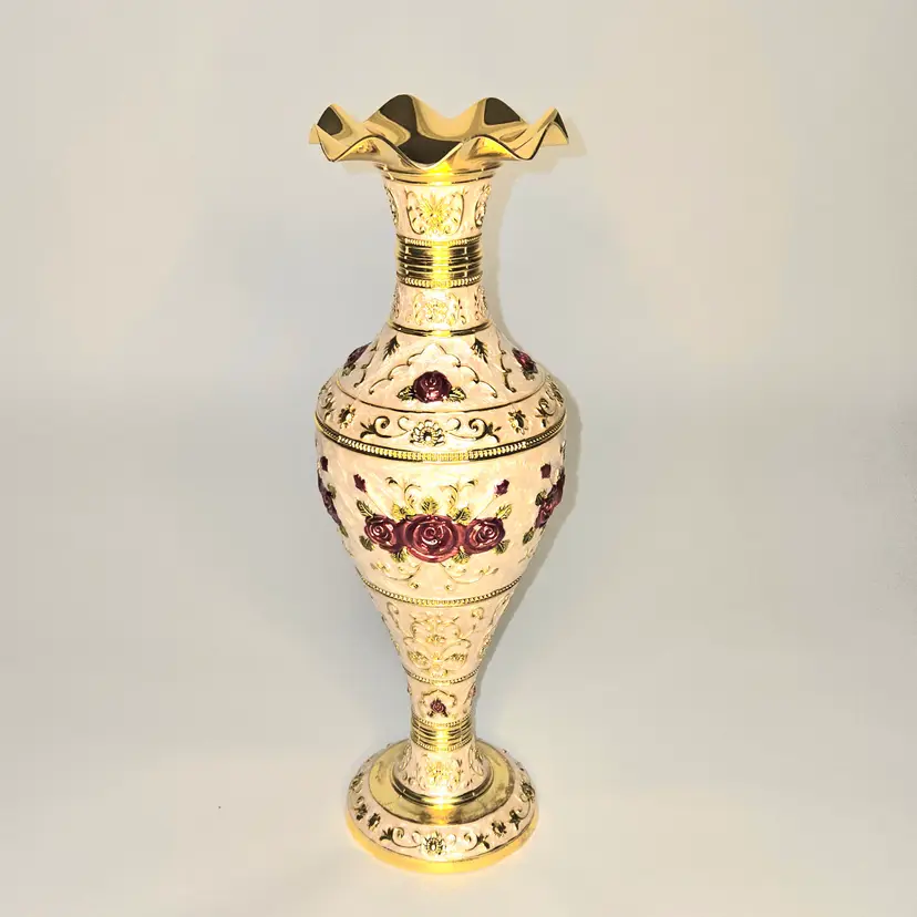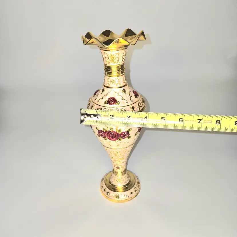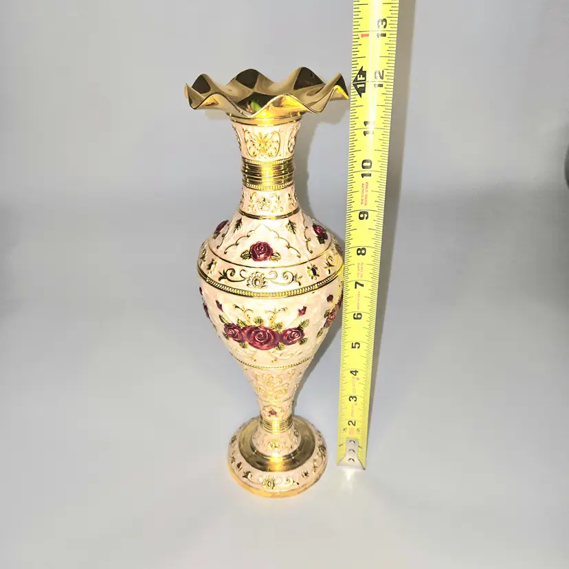I think this vase is stunning! The reds are vibrant and the cloisonne is done to perfection. The mark is inside the neck and hard to see. The maker is Benesifit and my research indicated they are Turkish. It has a very Russian style. Ther are both cloisonne and champleve decorations. Ruffled rim. Flawless. See pics for dimensions.