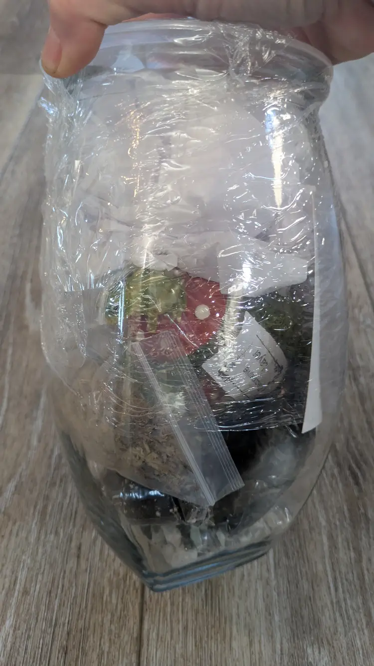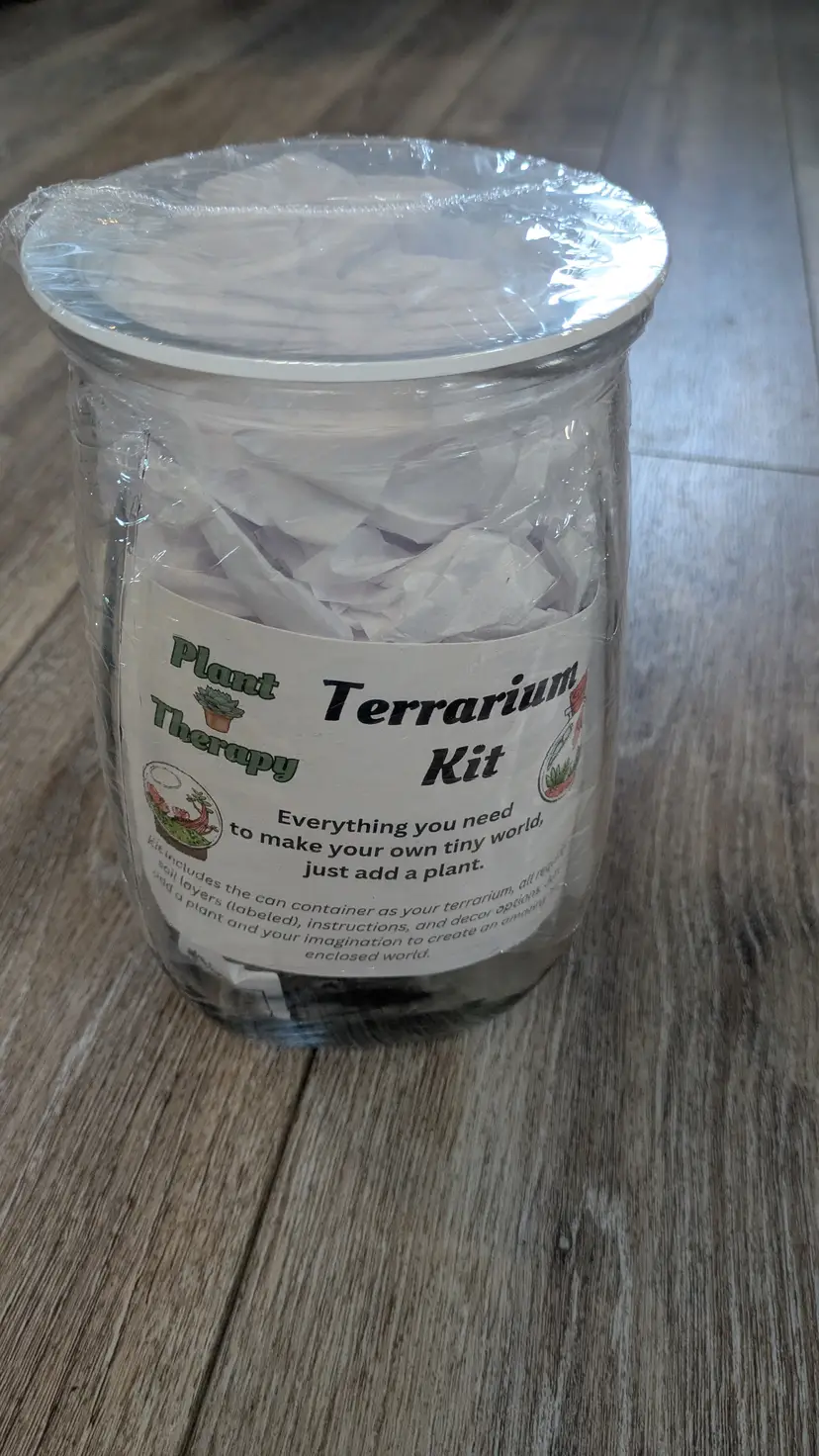 This large (round to square tapered 9" tall by 5" wide) glass lidded terrarium includes everything you need to make a terrarium at the beginner to intermediate level. Printed directions, care instructions, all layers of the terrarium which will be labeled for you. You'll also receive lots of decor options such as wood, rocks or figurines. Each kit has a theme. Just Add your own plants and imagination.