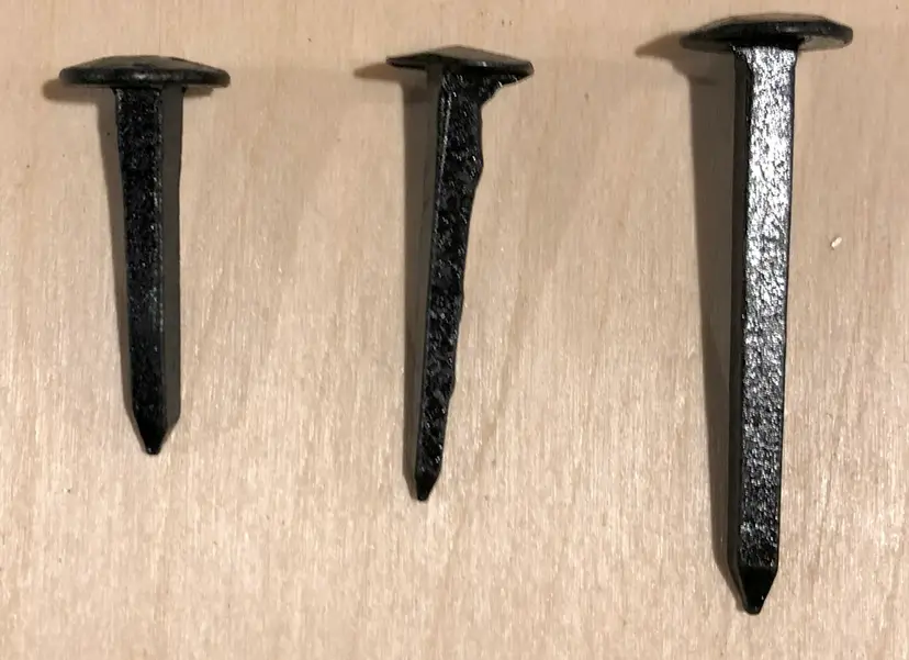 The pictures above show the shape of the hammered head and the 50 mm nail is pictured at the right of the center picture.