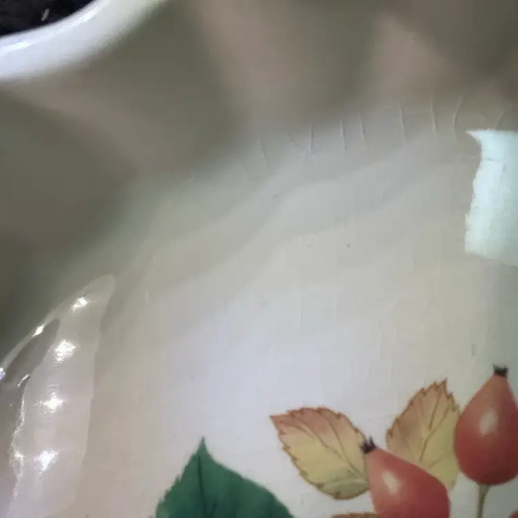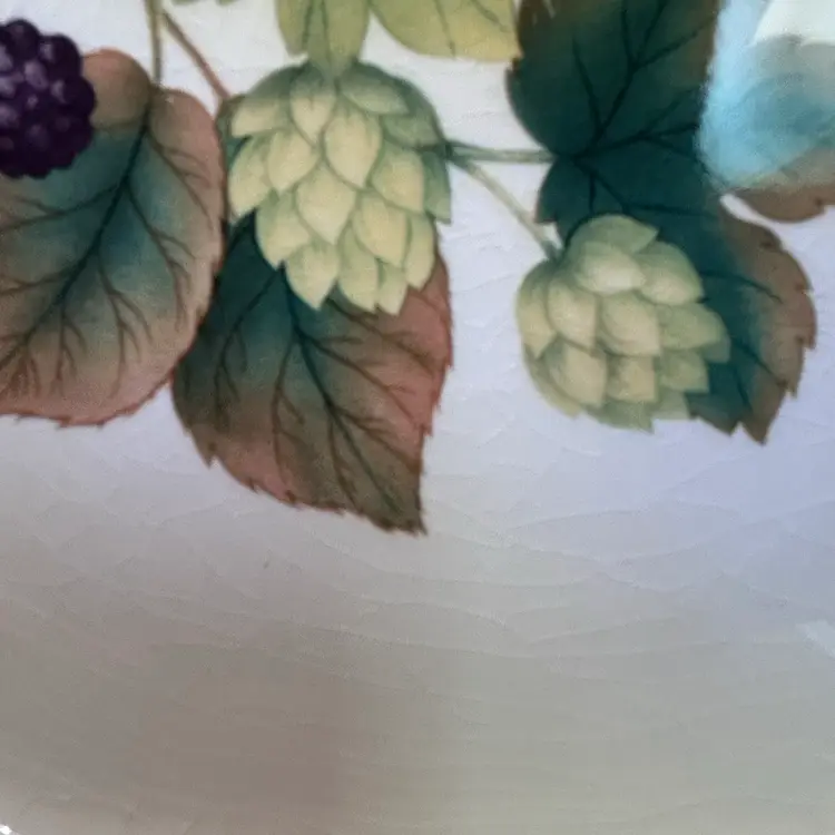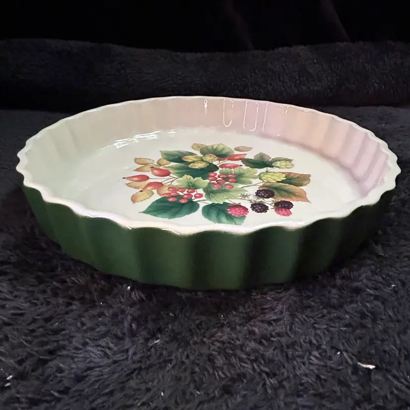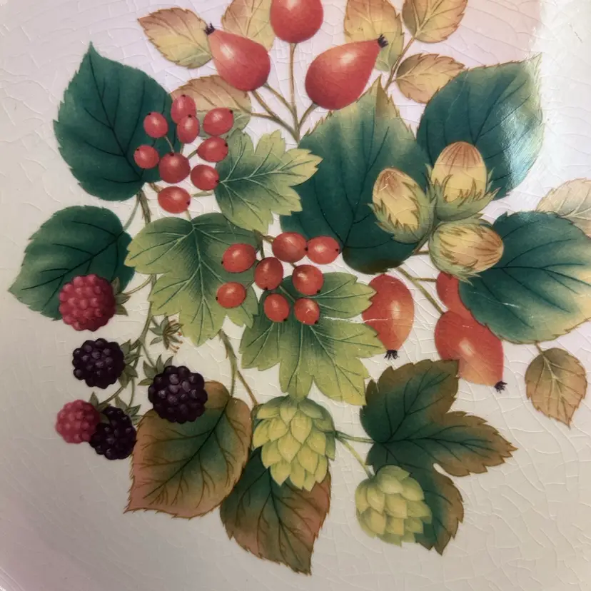 Cloverleaf Ceramic Country Fruits pie/quiche dish. A lovely large Cloverleaf Ceramic flan dish in the country fruits pattern. This very attractive pattern shows autumn fruits,hips,hazelnuts,blackberries hops & guelder rose on a cream background with green sides.It is in good condition no chips/cracks , it does have slight crazing as shown in the last pics. It is marked on the base Cloverleaf Country Fruits