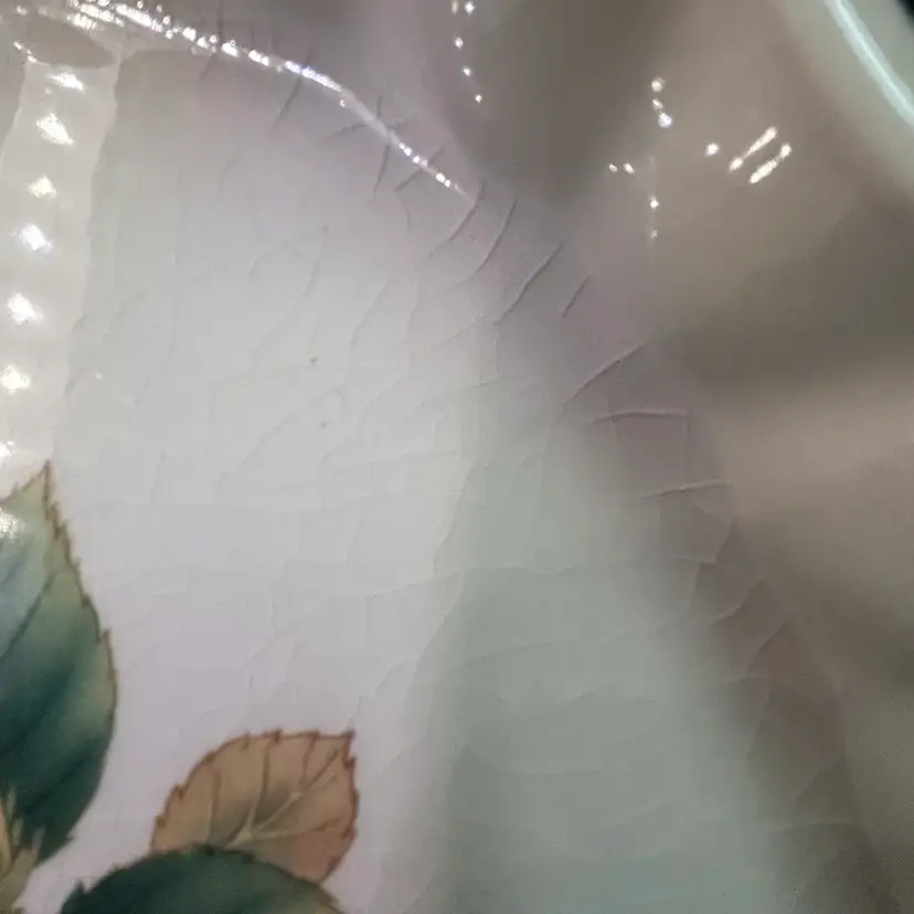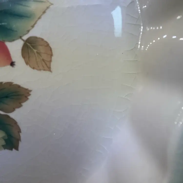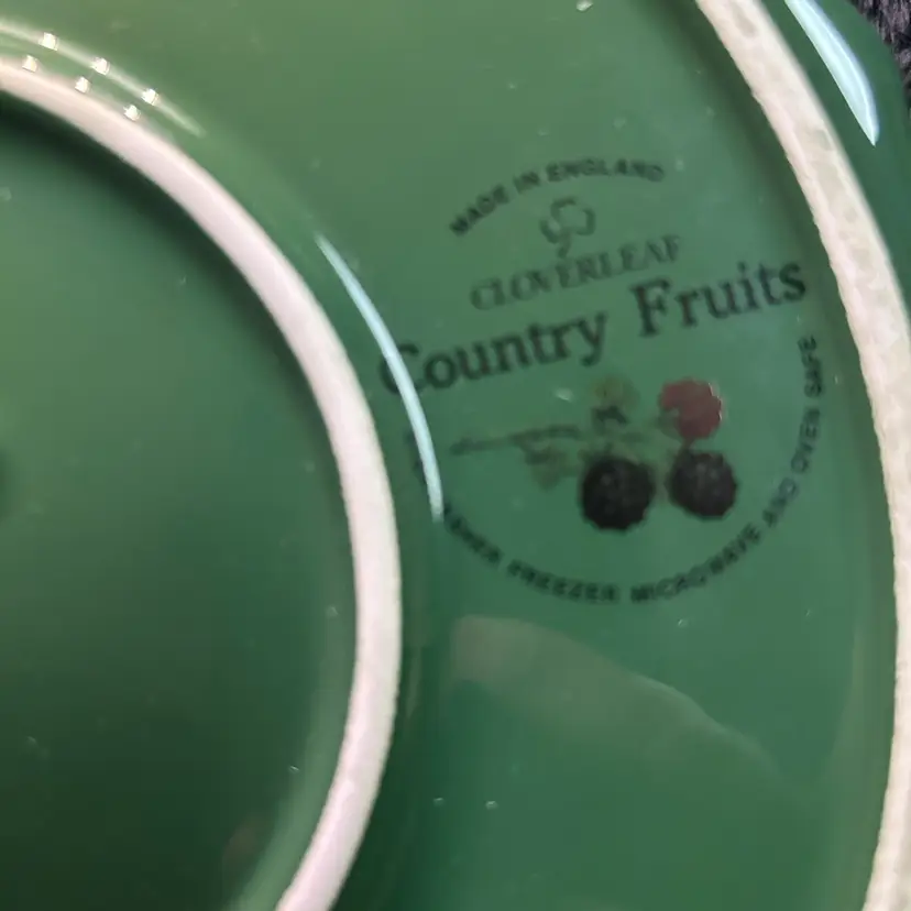 Cloverleaf Ceramic Country Fruits pie/quiche dish. A lovely large Cloverleaf Ceramic flan dish in the country fruits pattern. This very attractive pattern shows autumn fruits,hips,hazelnuts,blackberries hops & guelder rose on a cream background with green sides.It is in good condition no chips/cracks , it does have slight crazing as shown in the last pics. It is marked on the base Cloverleaf Country Fruits