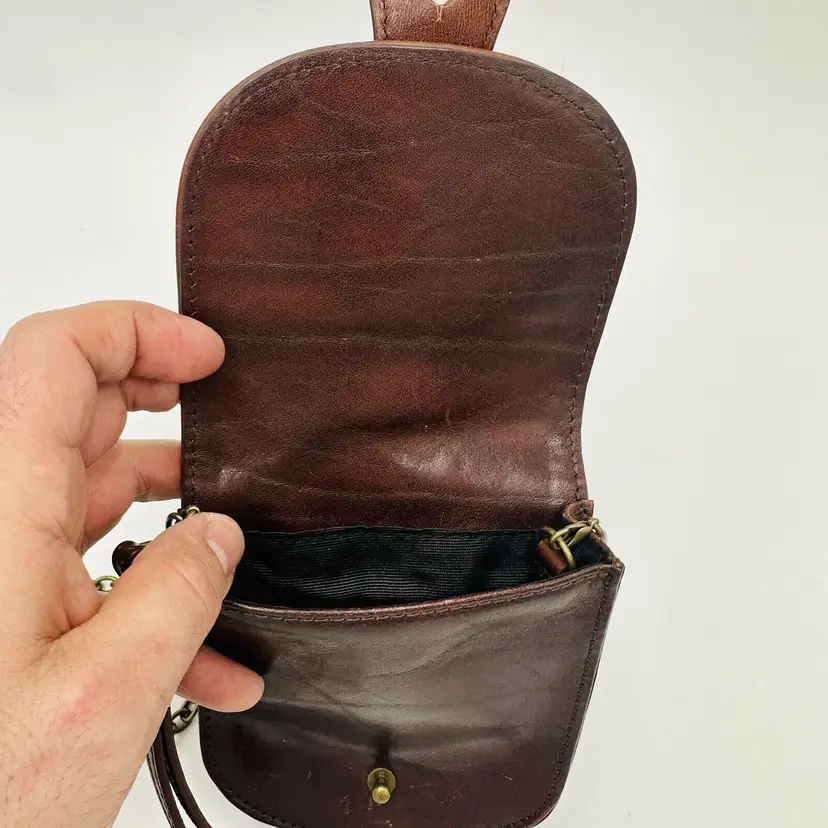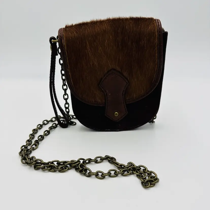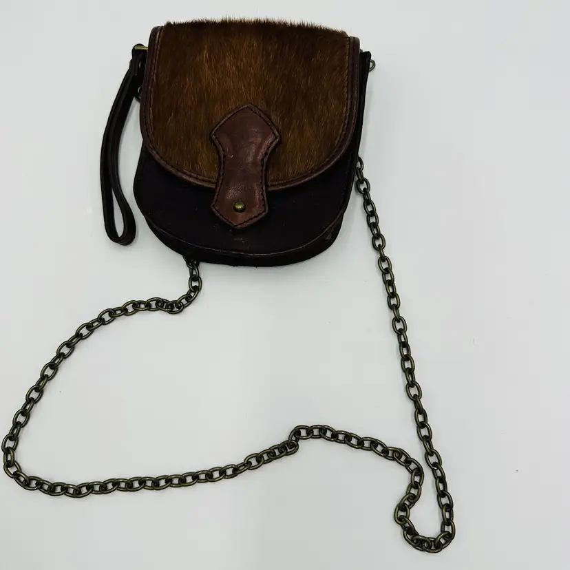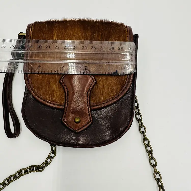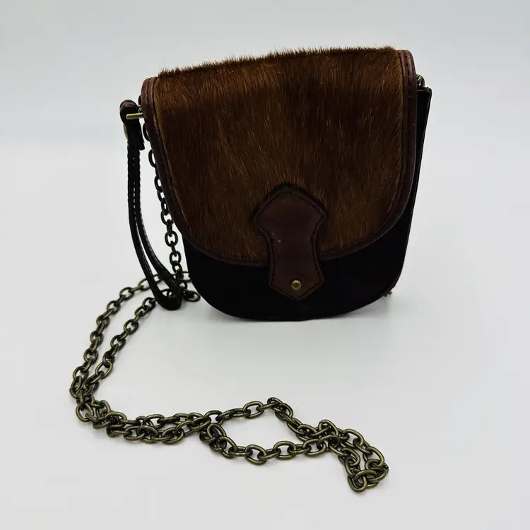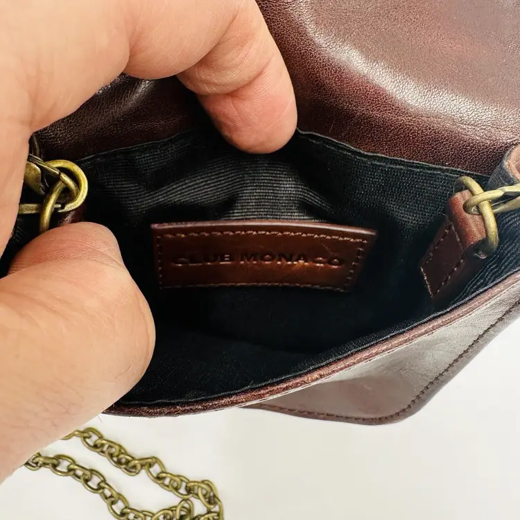 Features: Chain Strap Exterior Color: Brown Department: Women Pattern: Leather Lining Color: Black Exterior Material: Leather Handle/Strap Color: Brown Bag Height: 5 in Size: Small Product Line: Club Monaco Hardware Color: Brown Handle/Strap Material: Leather Bag Width: 5 in Bag Depth: 5 in Brand: Club Monaco Style: Crossbody Closure: Button