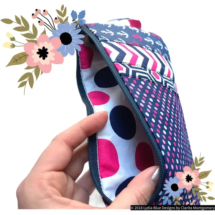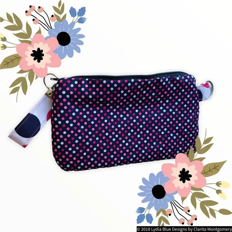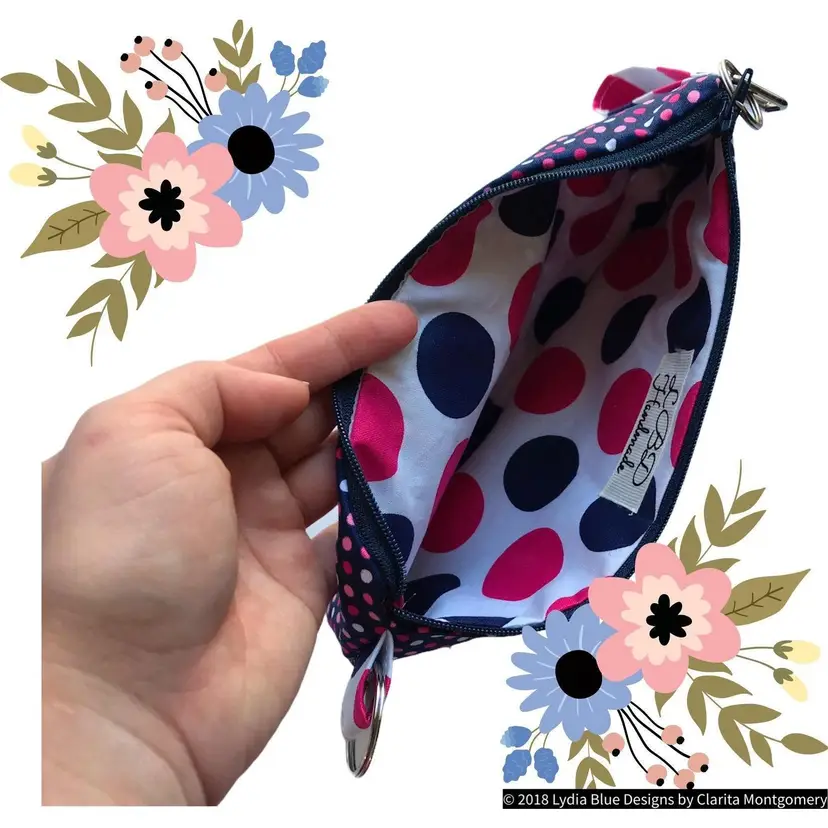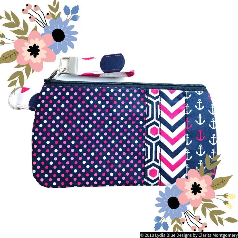 Materials: Key Fob with Silver Hardware Cotton Fabric Interfacing Cotton -Liner fabric, Applique Fabric and Outside Fabric Navy #3 Style Zipper with Nylon coils.