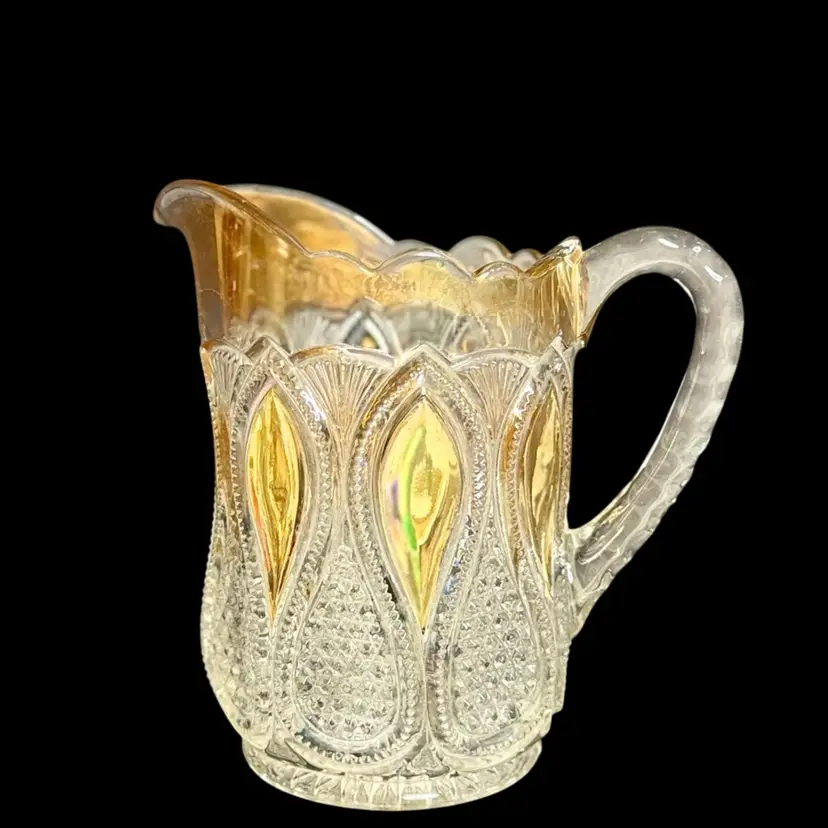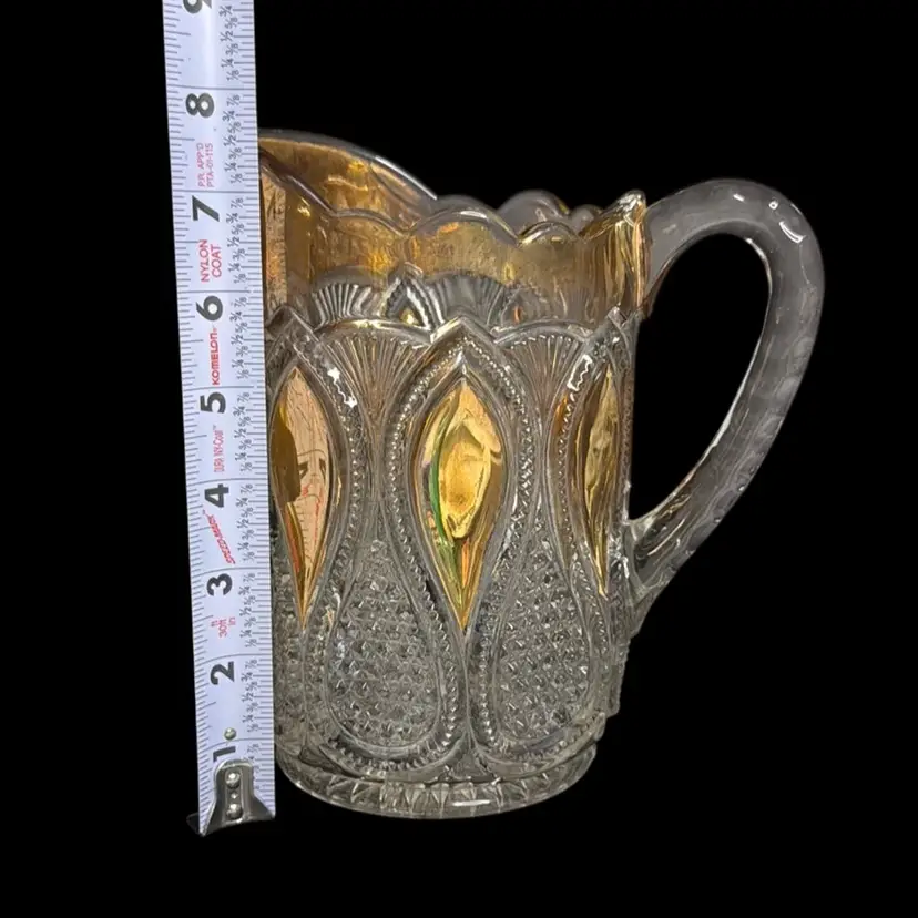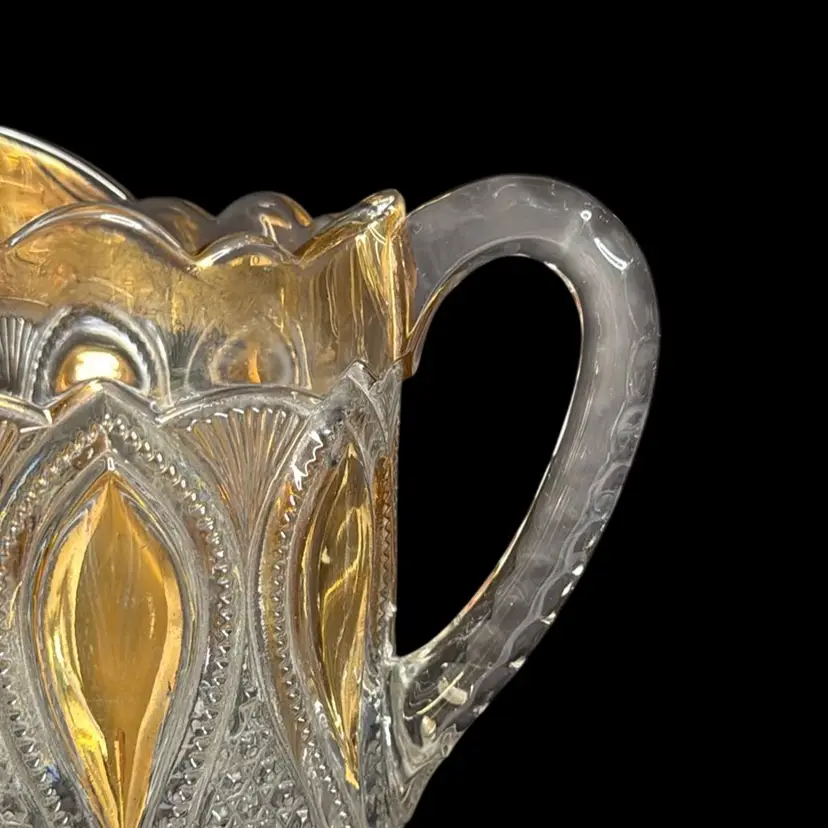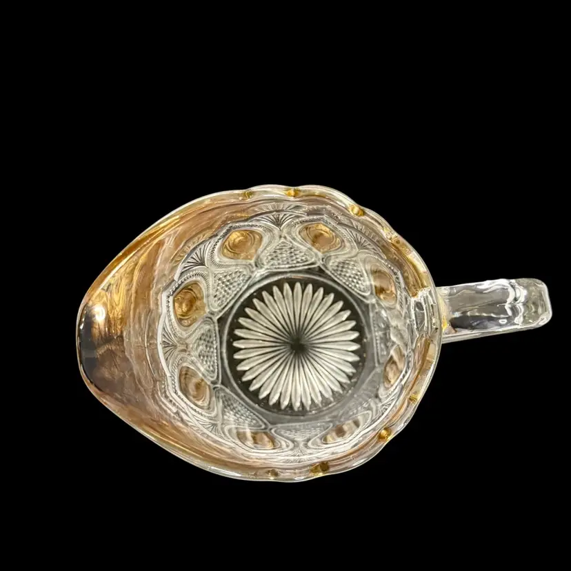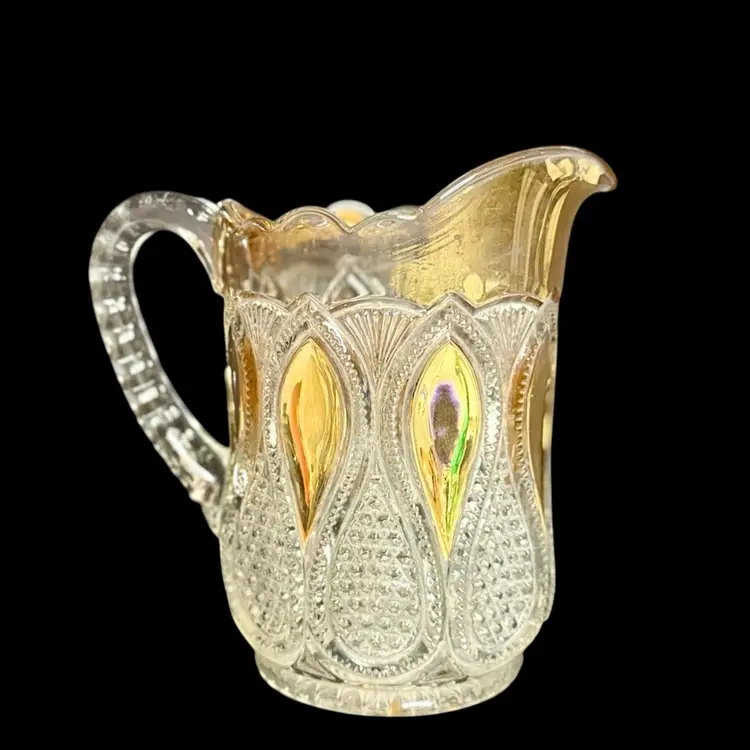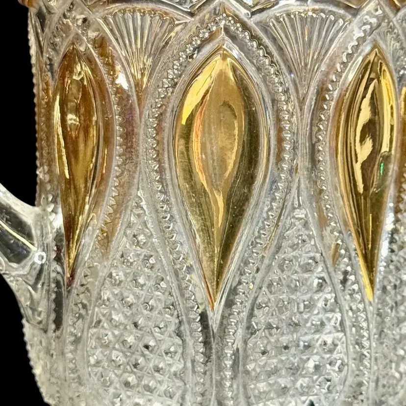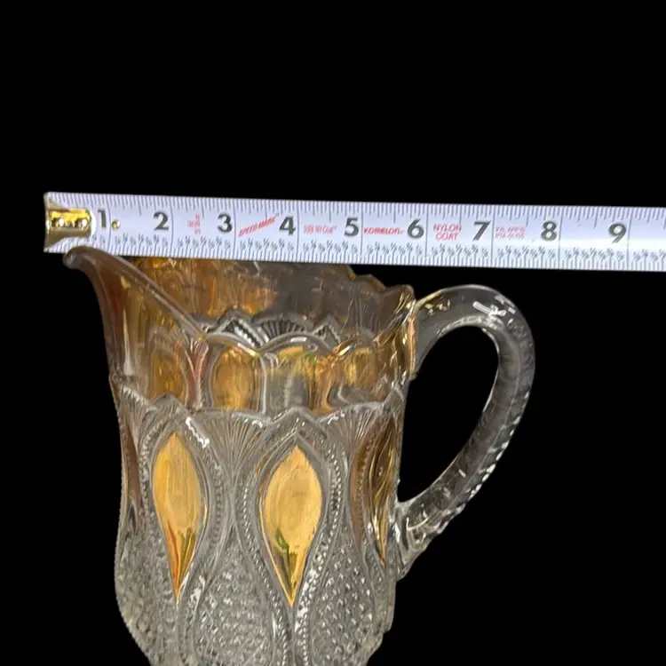 Co-operative Flint Glass Co. Pitcher Beautiful clear glass, “gold circle” pattern. and gold gilding. This is an Early American Pattern Glass (EAPG). Maganese glow with a 365 UV Light.