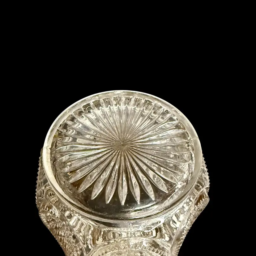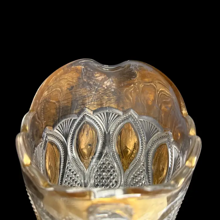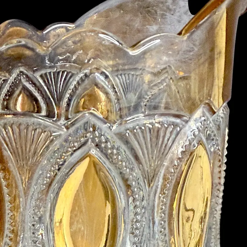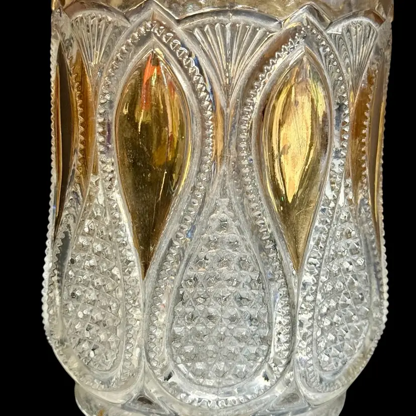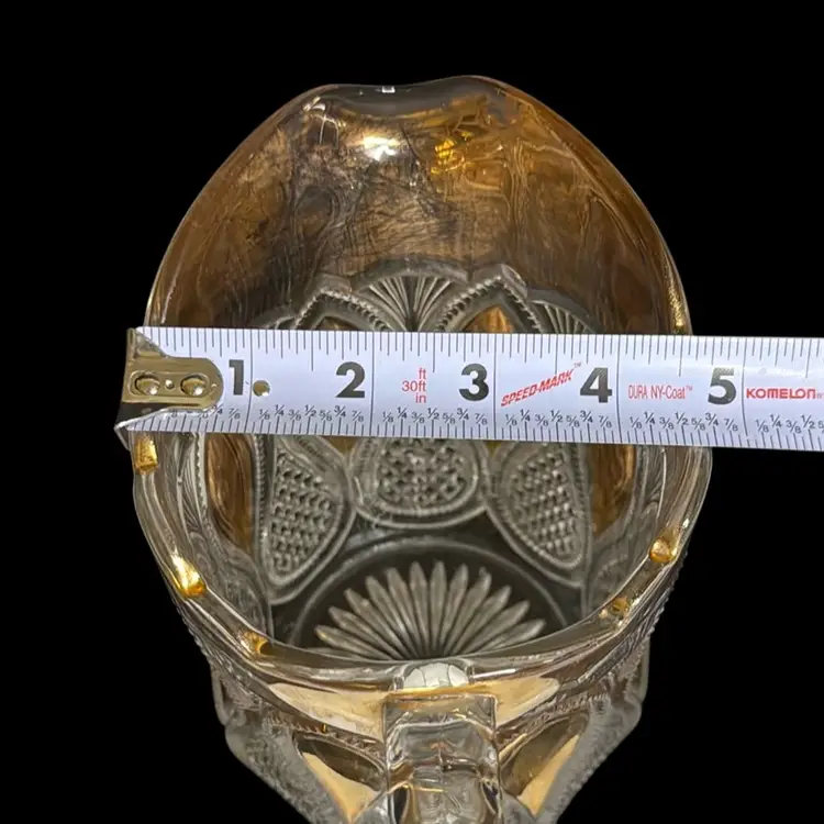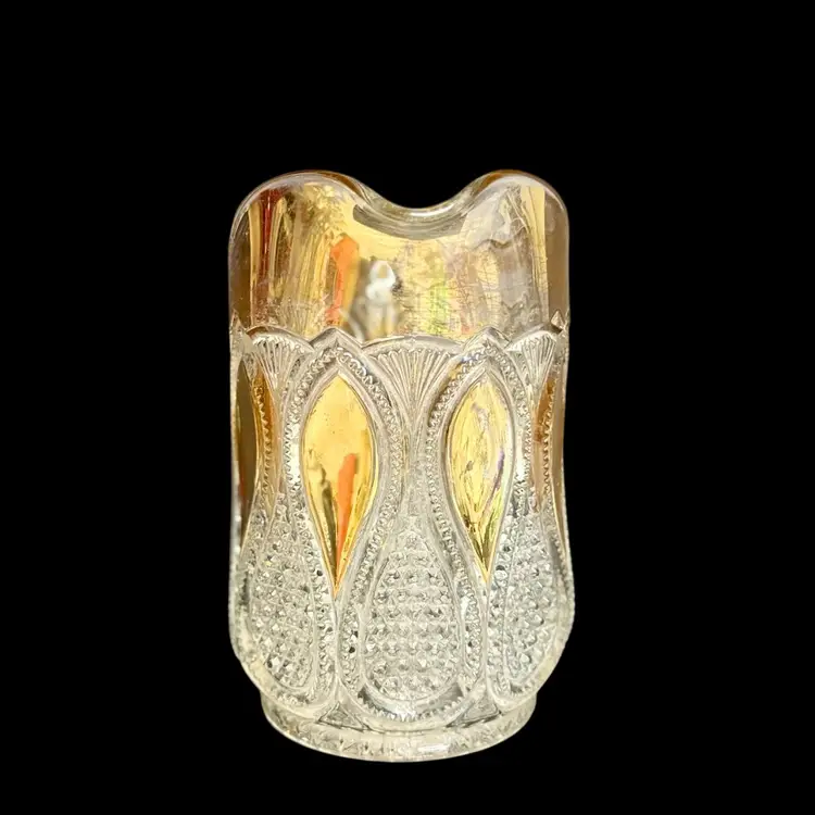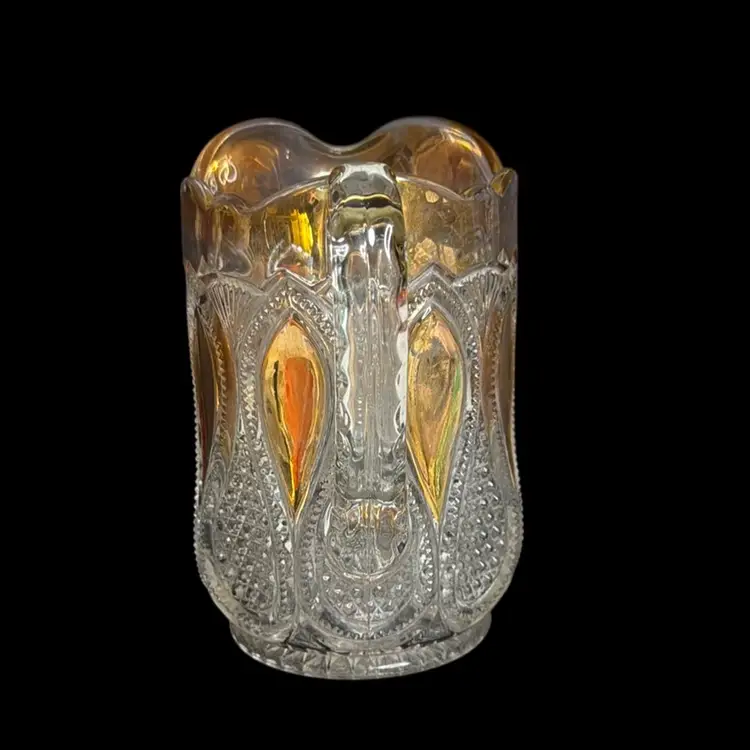 Co-operative Flint Glass Co. Pitcher Beautiful clear glass, “gold circle” pattern. and gold gilding. This is an Early American Pattern Glass (EAPG). Maganese glow with a 365 UV Light.