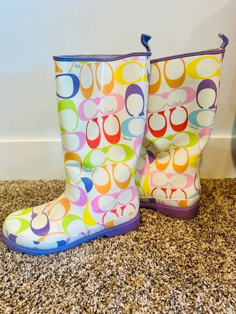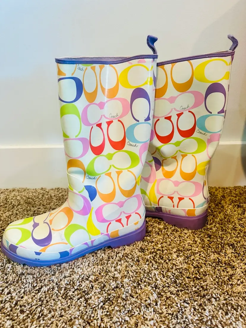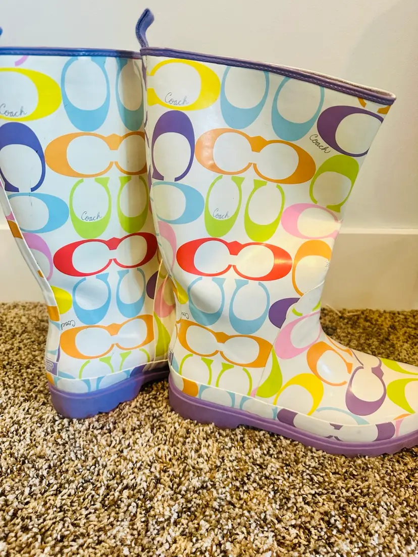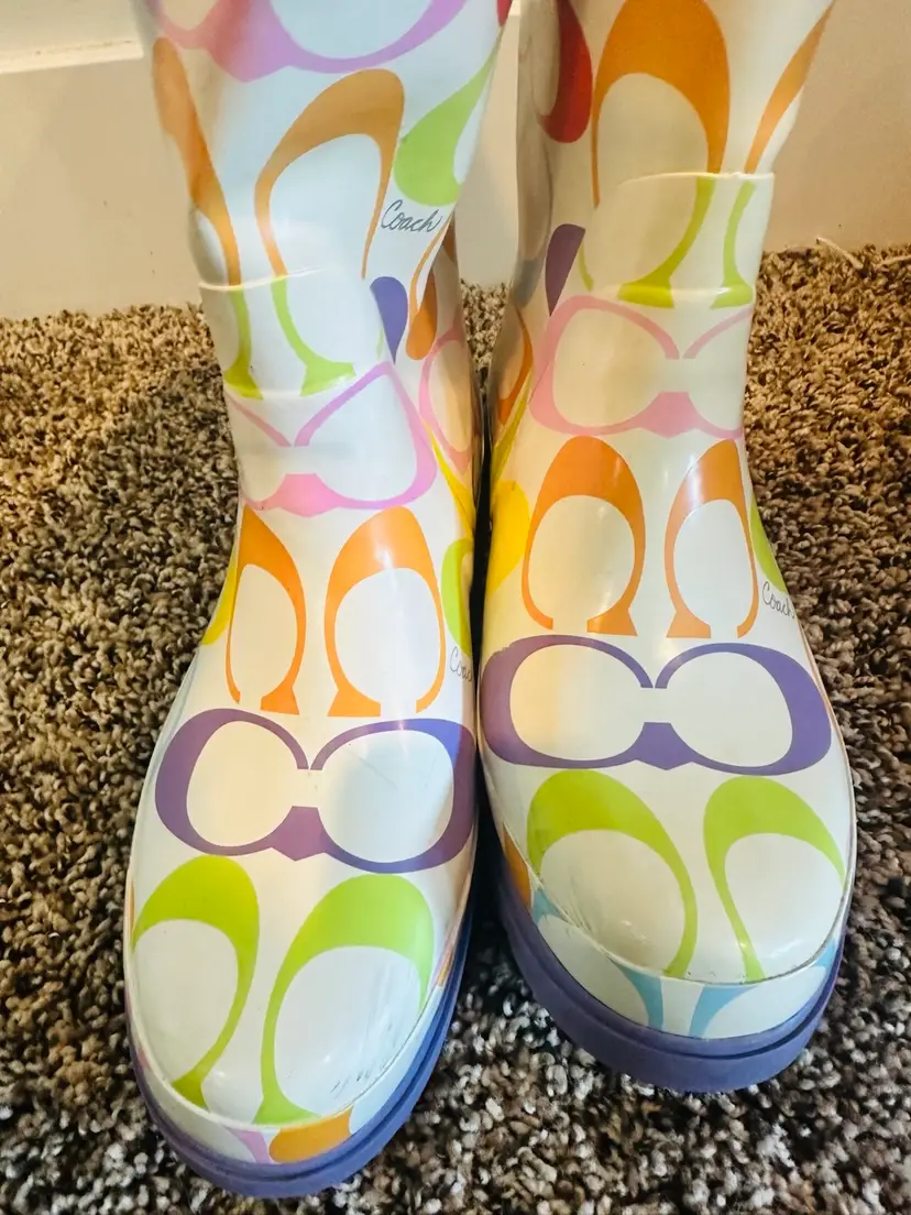 These COACH rain boots in a vibrant multicolor pattern feature the brand's logo throughout. With a knee-high shaft and a low block heel, they offer a preppy and stylish look. Made from rubber, they are designed for women in US shoe size 9B Perfect for adding a playful touch to any rainy day outfit. There is a little wear on toes and back but it will come off with cleaning. Coquette, preppy, Y2K, Vintage Coach SKU:XL001LUX