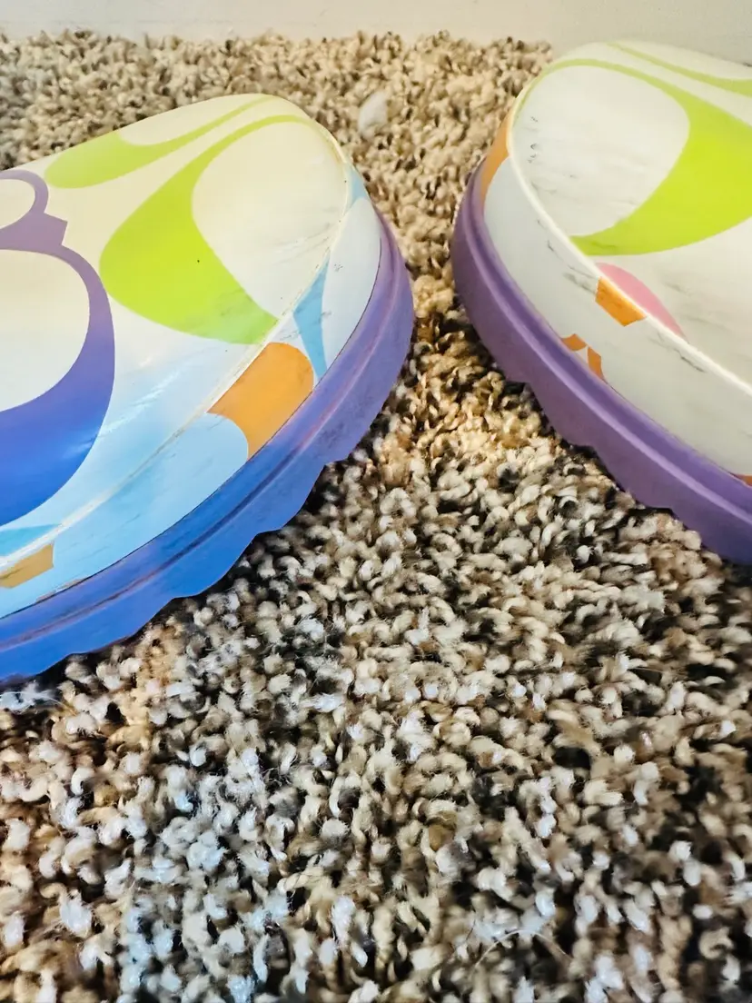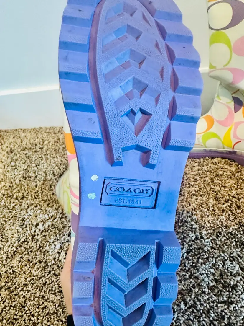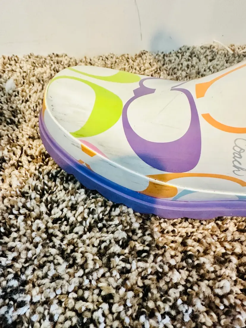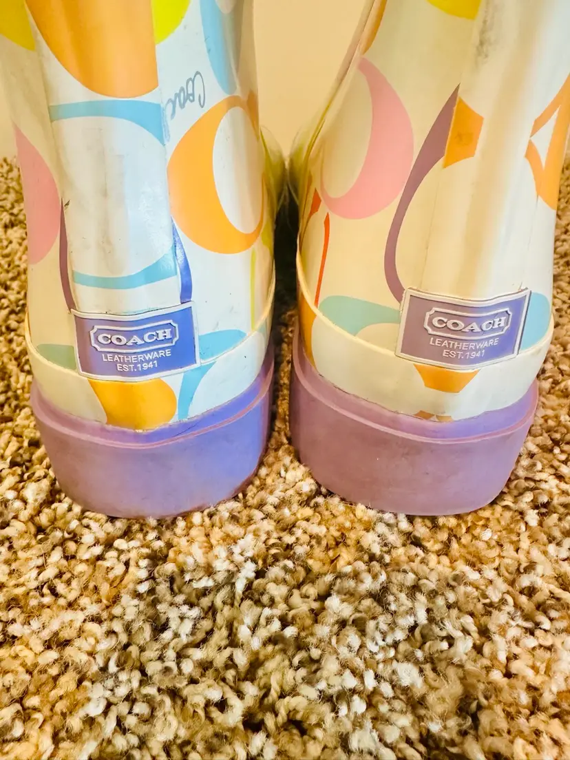These COACH rain boots in a vibrant multicolor pattern feature the brand's logo throughout. With a knee-high shaft and a low block heel, they offer a preppy and stylish look. Made from rubber, they are designed for women in US shoe size 9B Perfect for adding a playful touch to any rainy day outfit. There is a little wear on toes and back but it will come off with cleaning. Coquette, preppy, Y2K, Vintage Coach SKU:XL001LUX