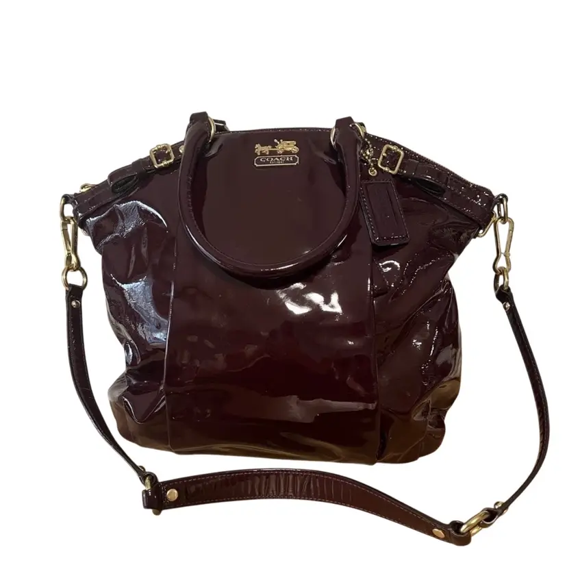 Patent leather with its original patent leather hang tag. The leather and gold hardware are simply gorgeous. The inside upper trim show signs wear. The outside side pocket has a little residue of melted hard candy. Wallet is not exact color and shows minor signs of wear