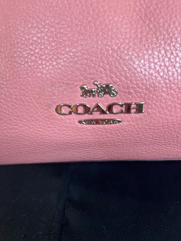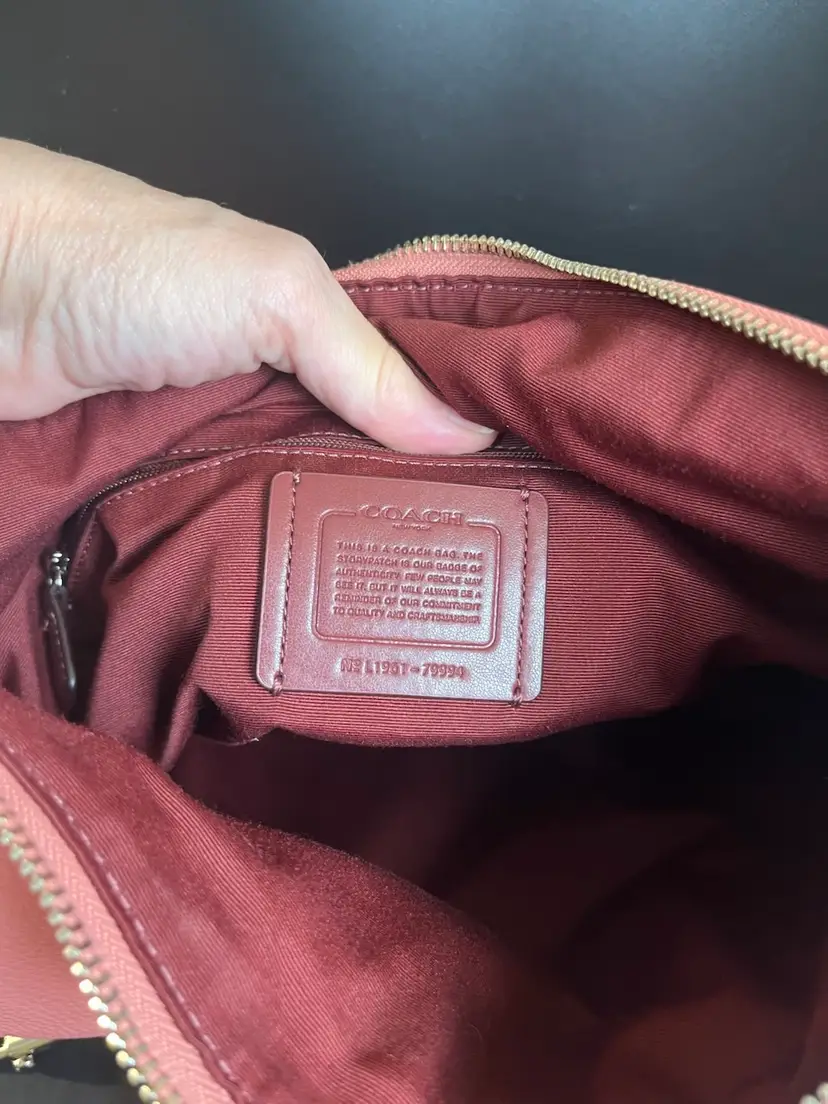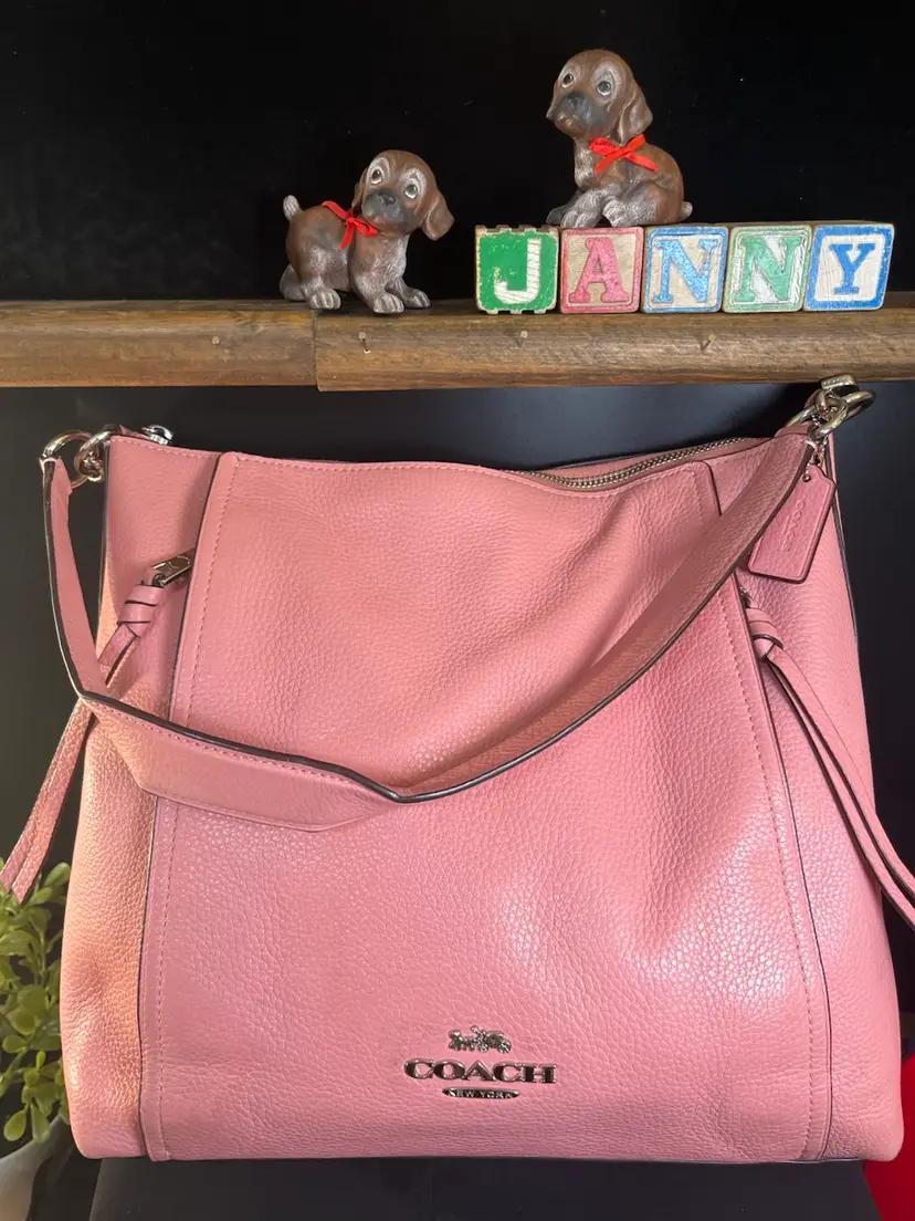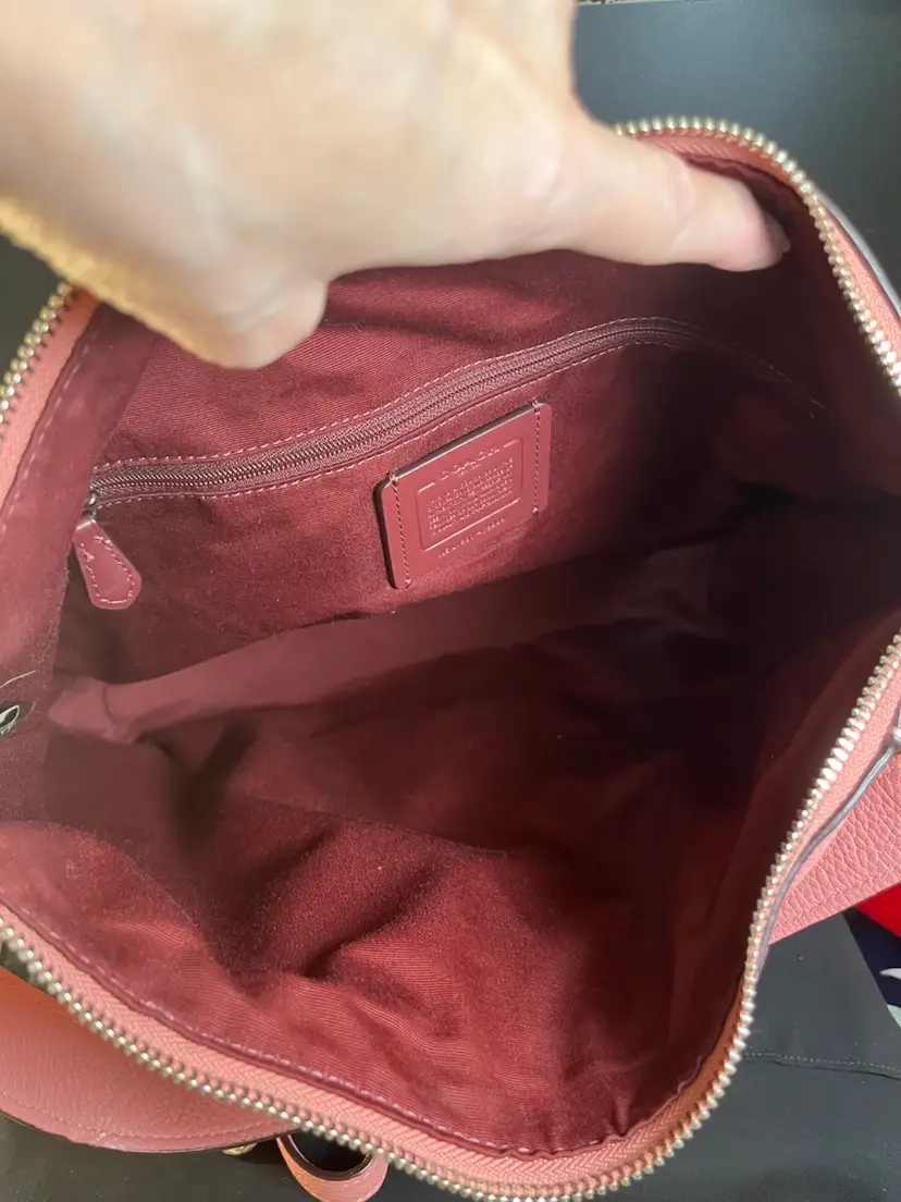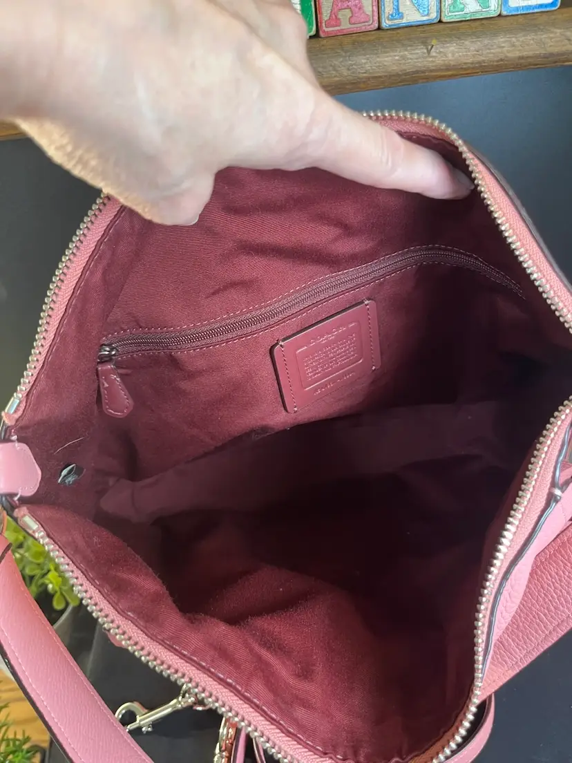 Absolutely beautiful quality purse. NO wear on straps or in the interior. 2 divided vertical zippered pockets on the front outside. Beautifully and evening stitched. Zippered enclosure to the inside. W/ one small zippered side pocket inside. Silver toned hardware is all stamped with COACH &/or its logo. It weighs approx 1 Lb 13 Oz, Measures approx 13" at base of purse, 12" vertically on outside side of purse.