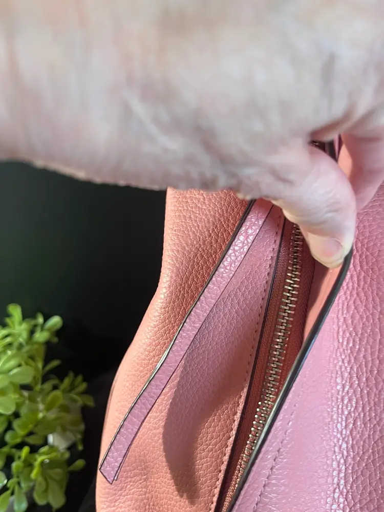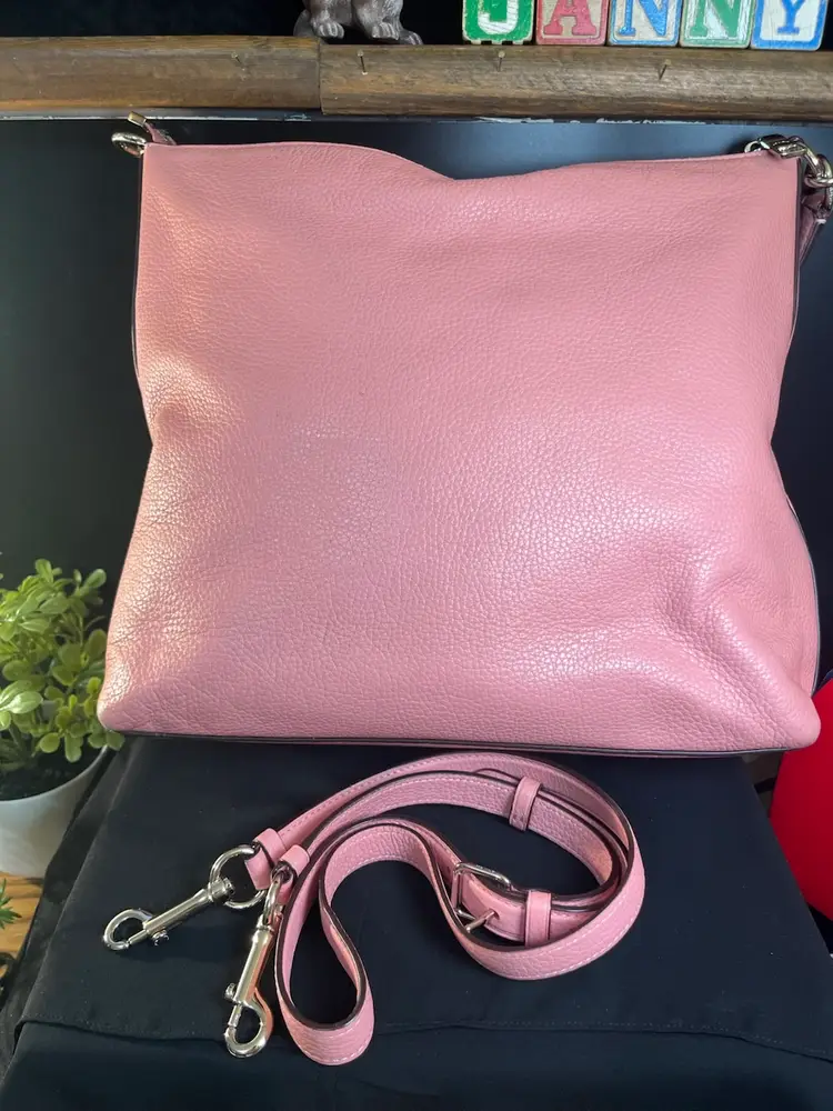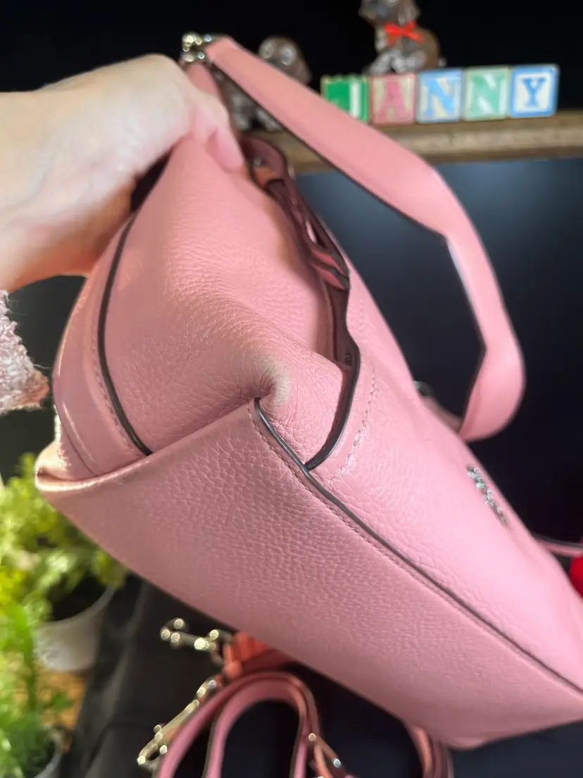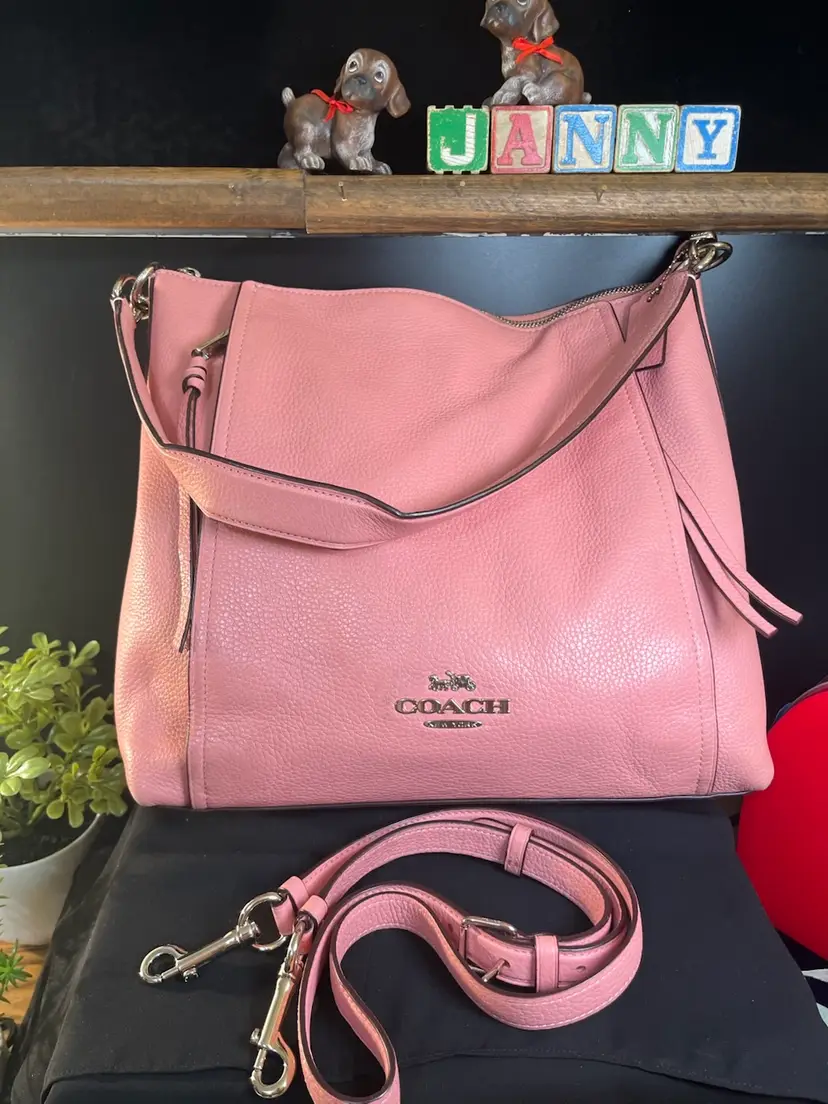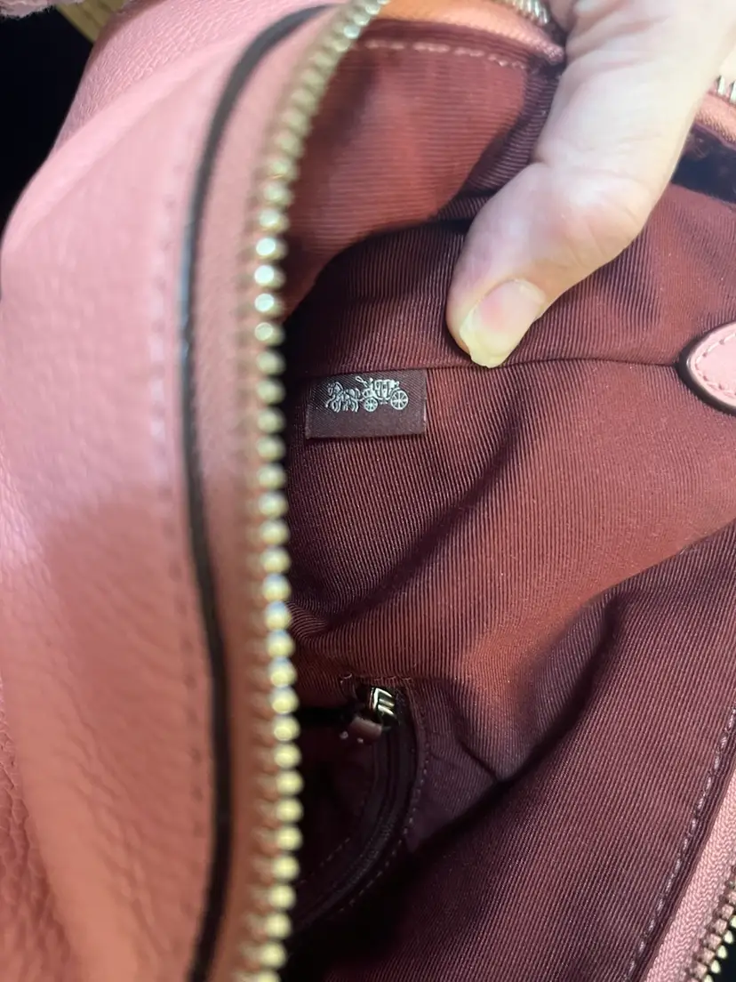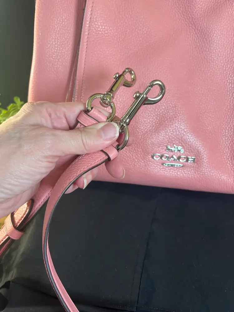 Absolutely beautiful quality purse. NO wear on straps or in the interior. 2 divided vertical zippered pockets on the front outside. Beautifully and evening stitched. Zippered enclosure to the inside. W/ one small zippered side pocket inside. Silver toned hardware is all stamped with COACH &/or its logo. It weighs approx 1 Lb 13 Oz, Measures approx 13" at base of purse, 12" vertically on outside side of purse.