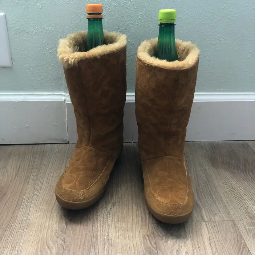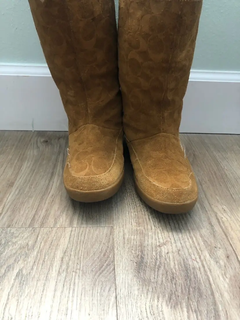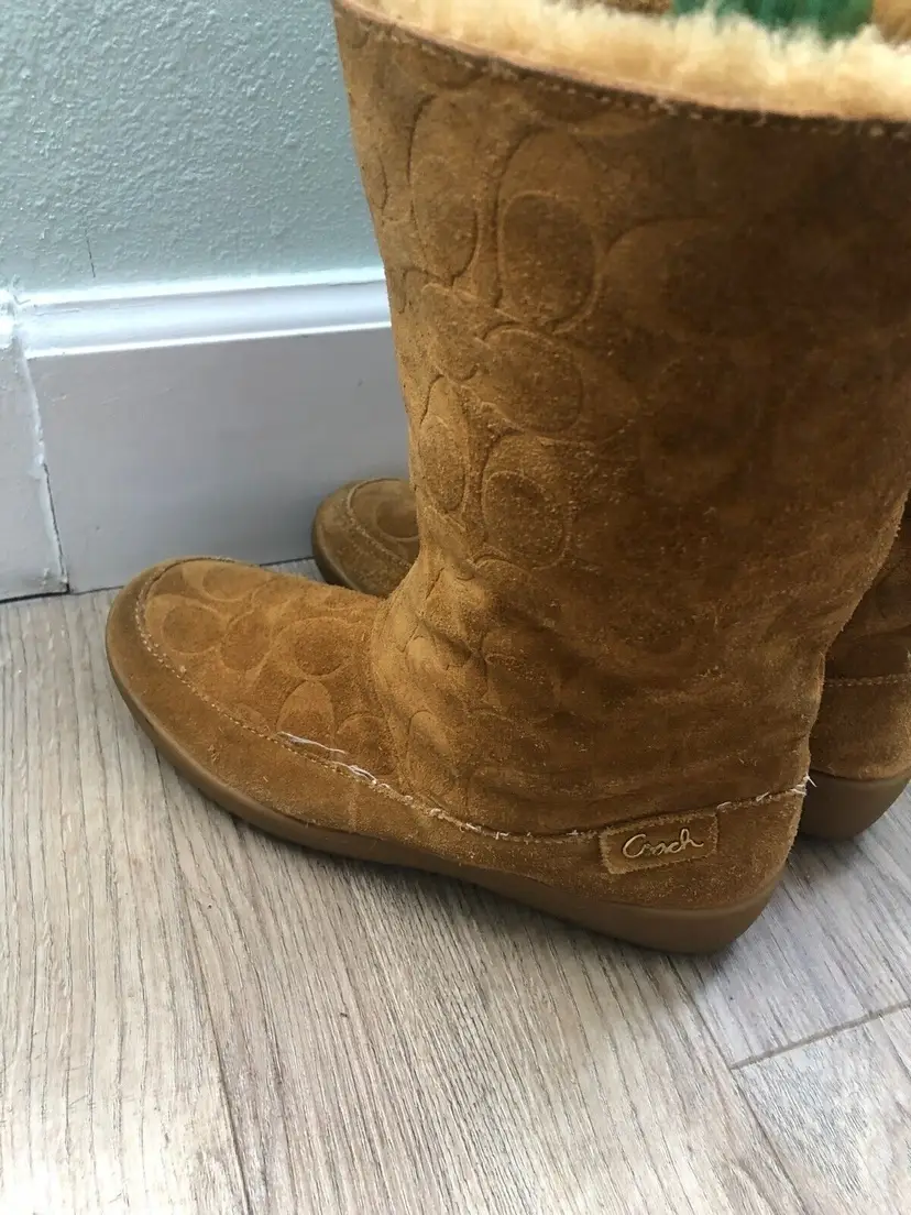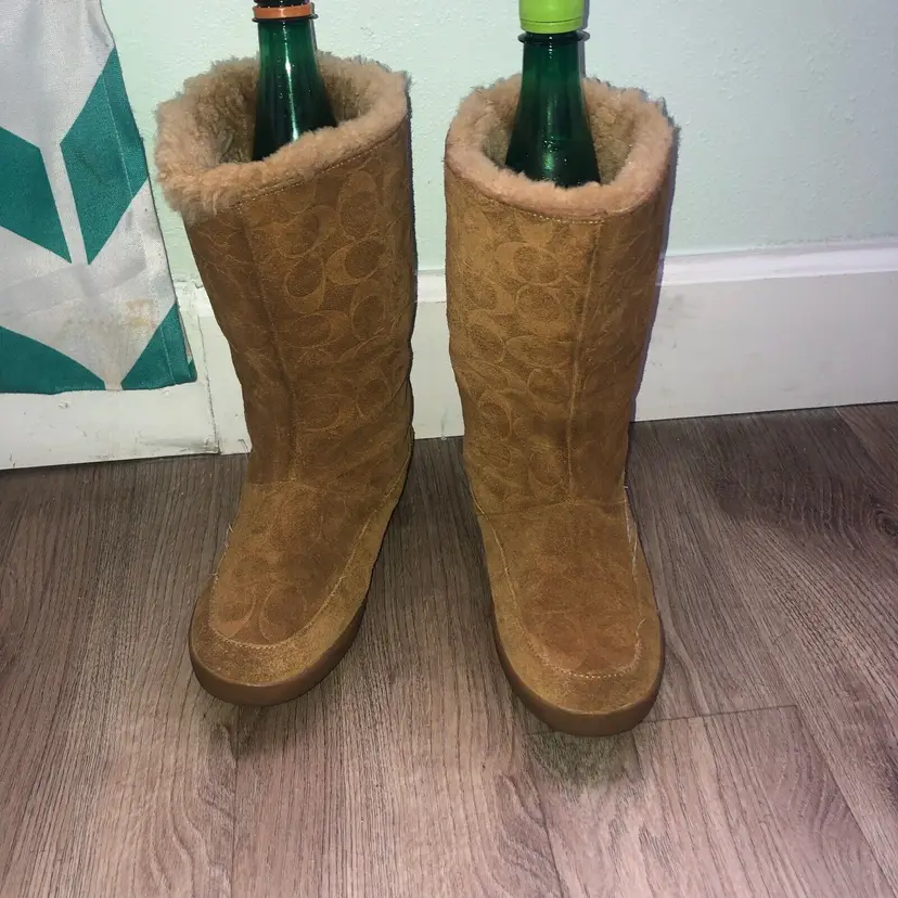 Model: Monogram Shoe Shaft Style: Mid-Calf Pattern: signature Toe Shape: Round Toe Character: Coach Signature, Boots Closure: Pull On US Shoe Size: 9 Color: Brown Lining Material: Fur Brand: Coach Department: Women Type: Boot Customized: No Heel Style: Wedge Style: Boots Theme: Winter Features: Lined Season: Winter Upper Material: Cotton Product Line: Coach Signature