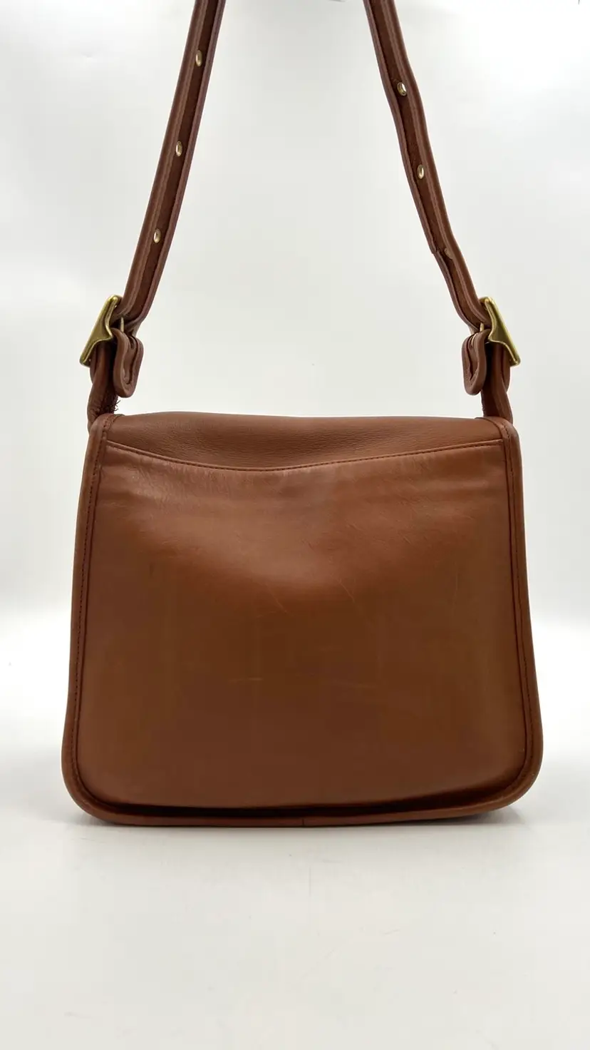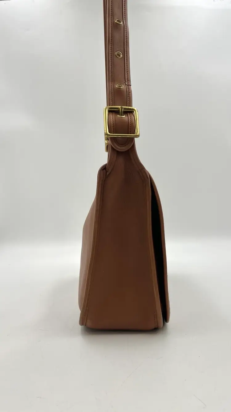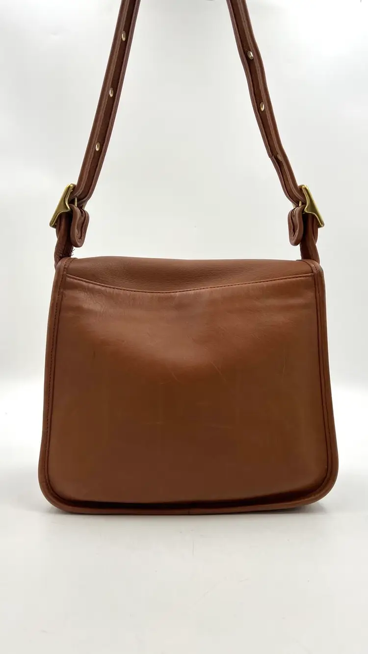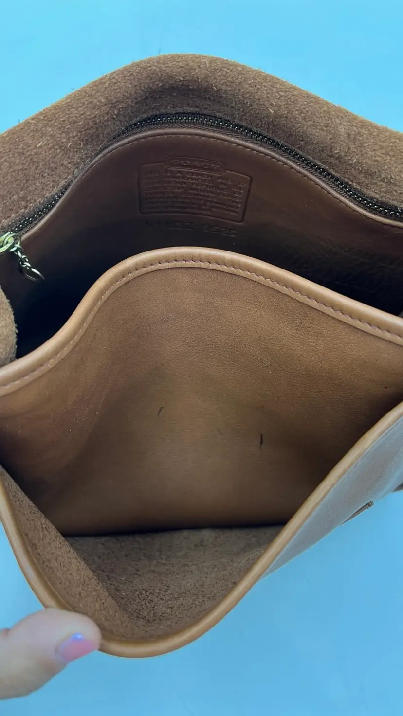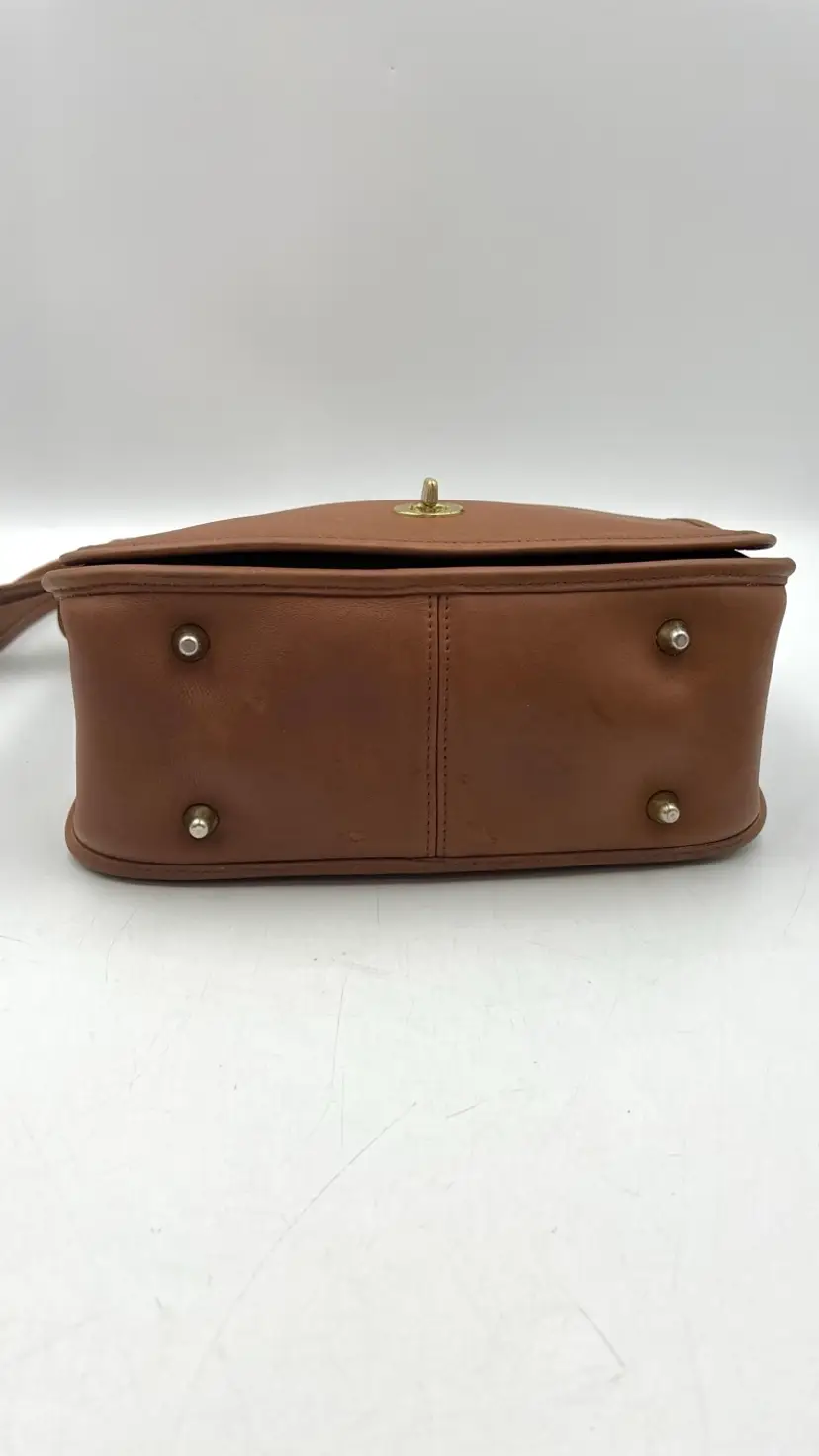 Vintage 90s Coach Stewardess Bag Tan Leather Handbag 9525 Purse Crossbody Size 11.5 x 8.5 x 4” Preowned item in excellent condition. Inside there are some light pen marks. Exterior bottom has some light marks upon close inspection. Nothing out of line with a preowned bag from 1993. Has been cleaned and conditioned for a new owner. Crafted from high-quality leather, this bag is built to last and will only improve with age if properly maintained. Made in the Dominican Republic.