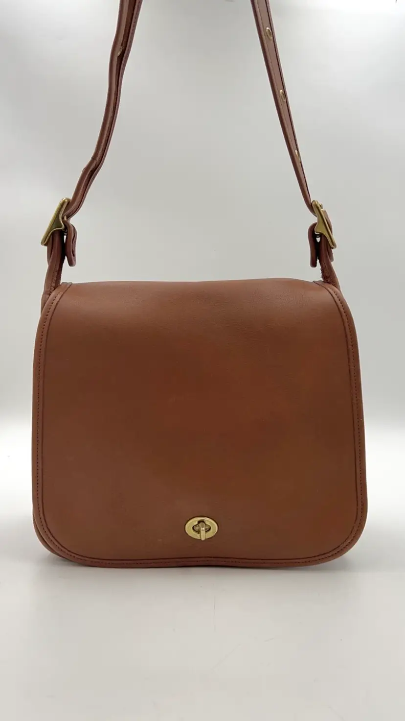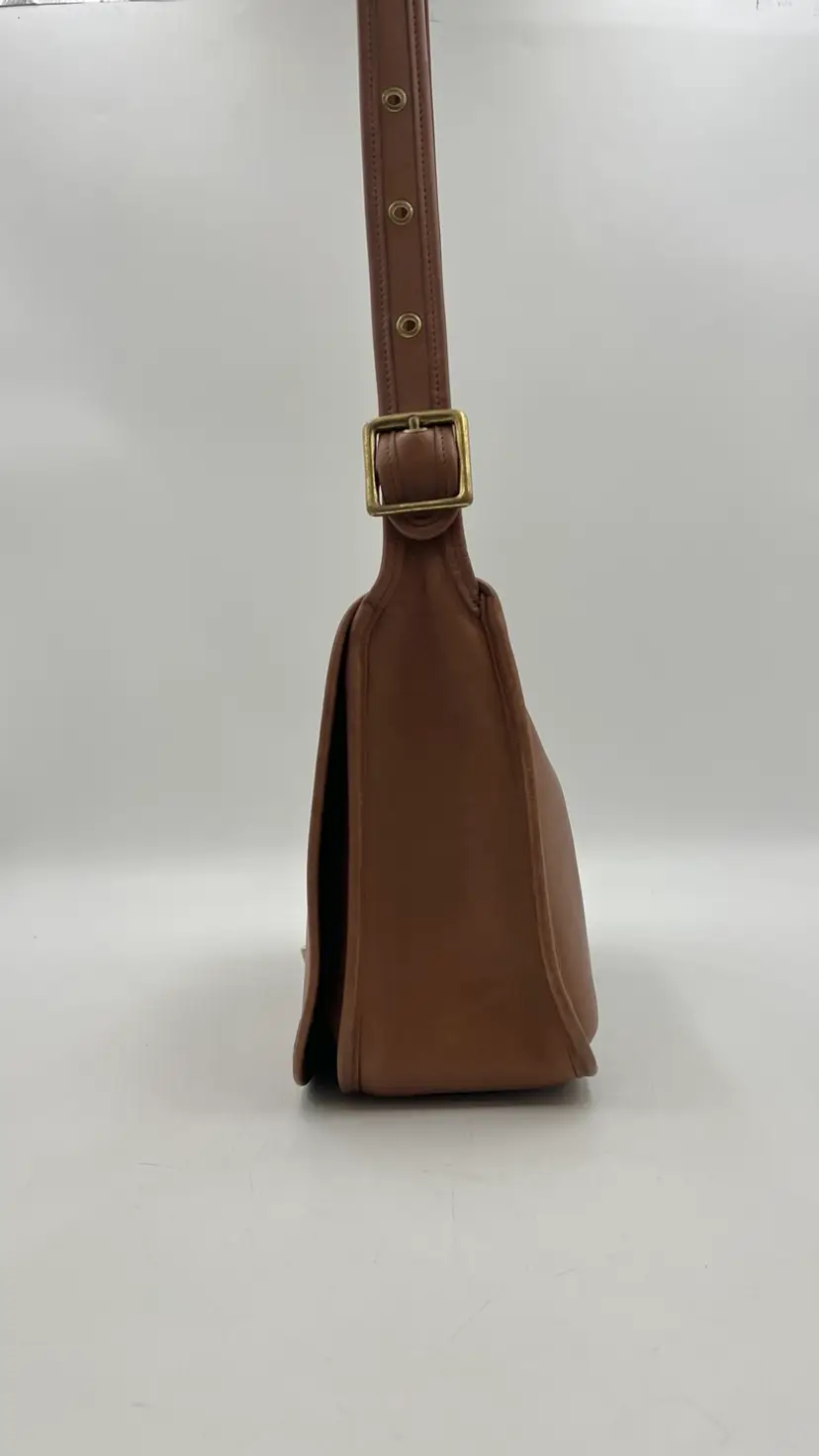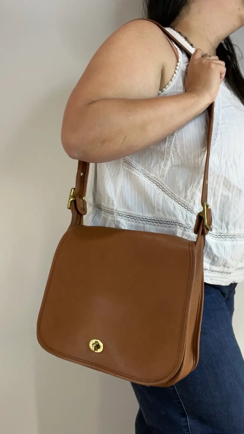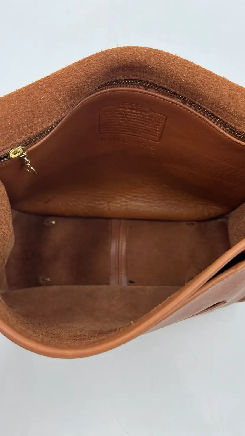 Vintage 90s Coach Stewardess Bag Tan Leather Handbag 9525 Purse Crossbody Size 11.5 x 8.5 x 4” Preowned item in excellent condition. Inside there are some light pen marks. Exterior bottom has some light marks upon close inspection. Nothing out of line with a preowned bag from 1993. Has been cleaned and conditioned for a new owner. Crafted from high-quality leather, this bag is built to last and will only improve with age if properly maintained. Made in the Dominican Republic.