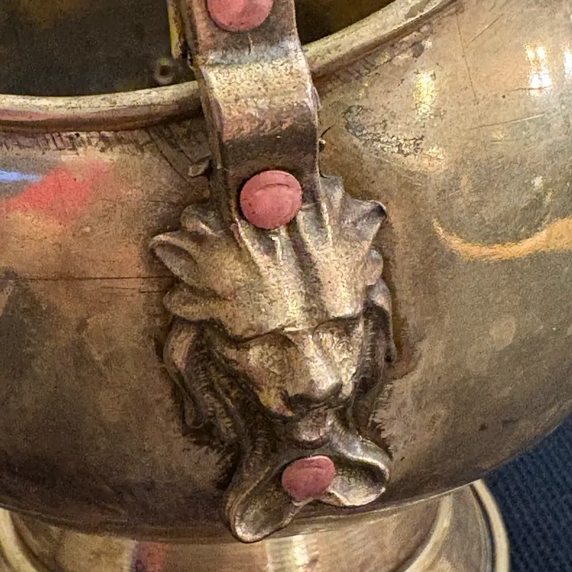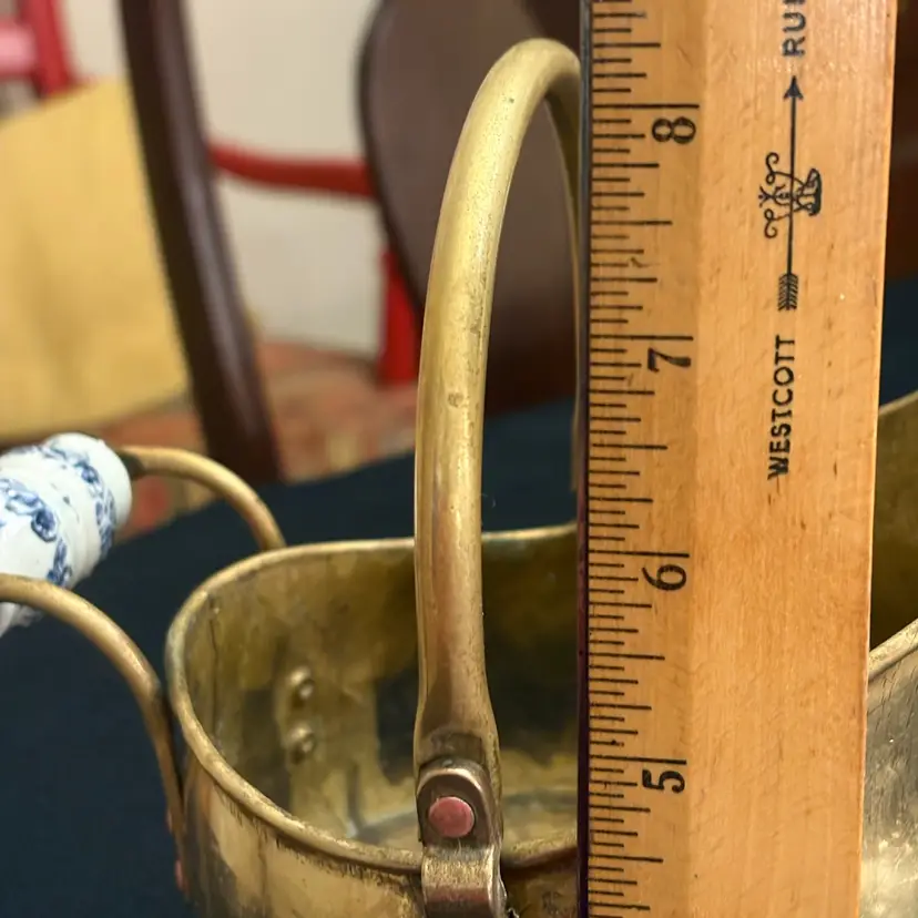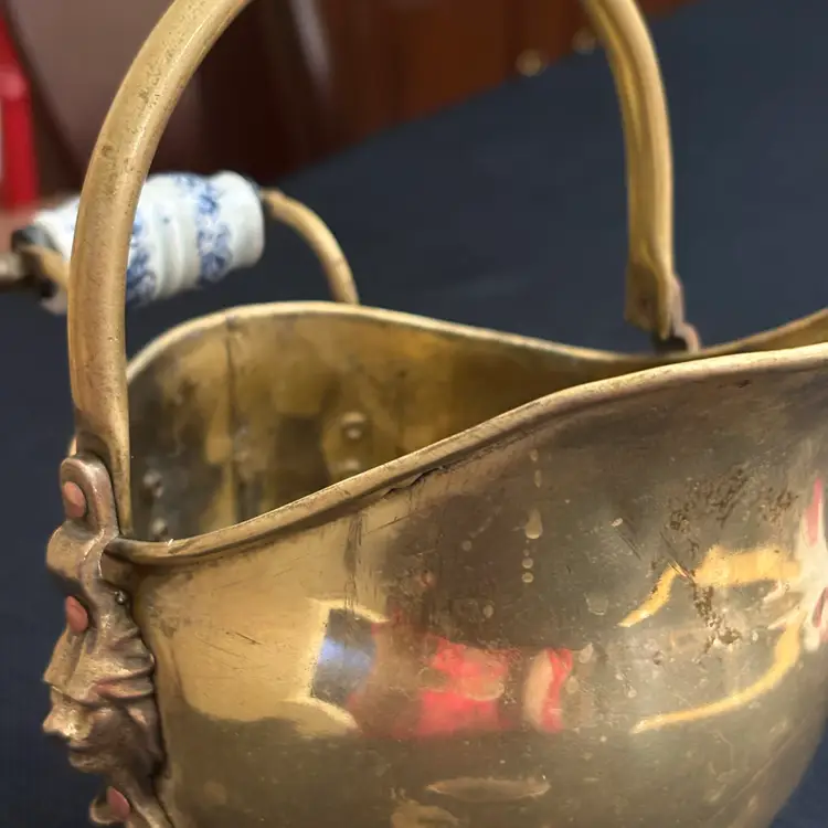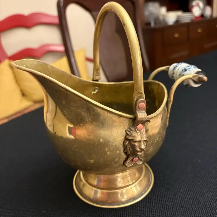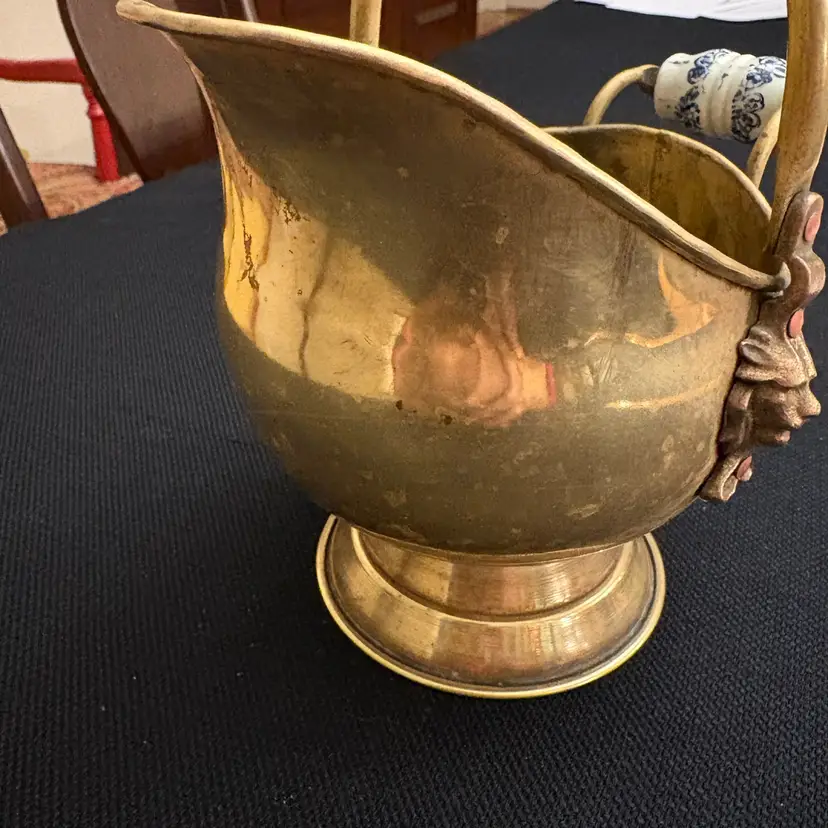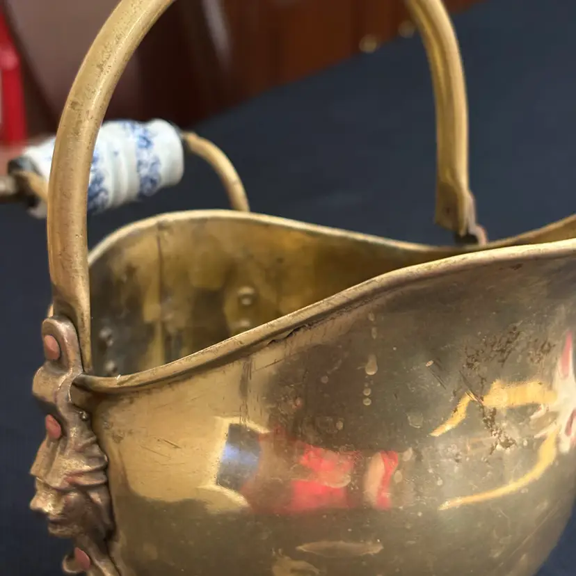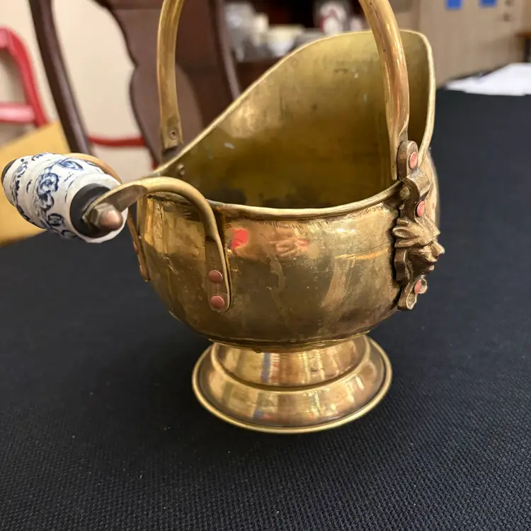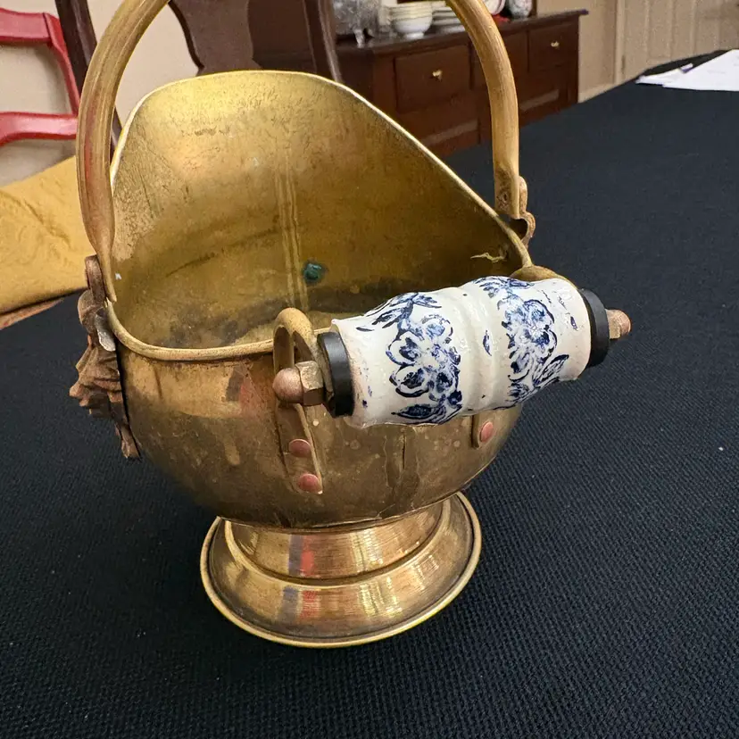 This Coal Scuttle Brass Planter is a unique and elegant piece with a porcelain handle face and copper studs. Made of brass and originating from Denmark, it features a design that adds a touch of sophistication to any room. The combination of materials and craftsmanship make it a standout collectible item for those who appreciate metalware and vintage decor.