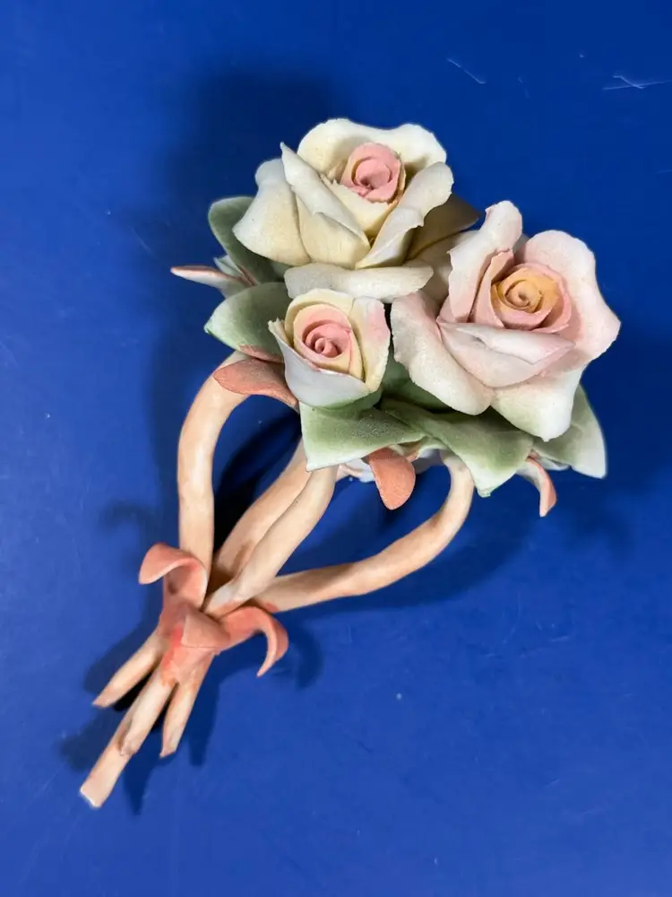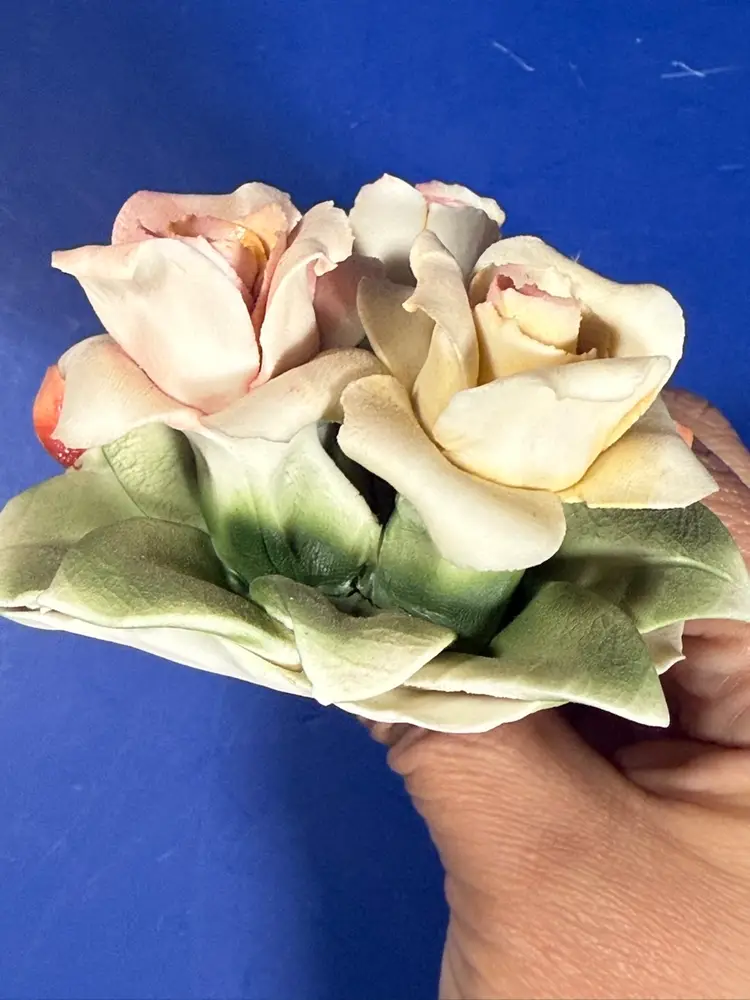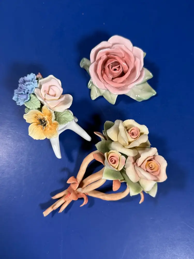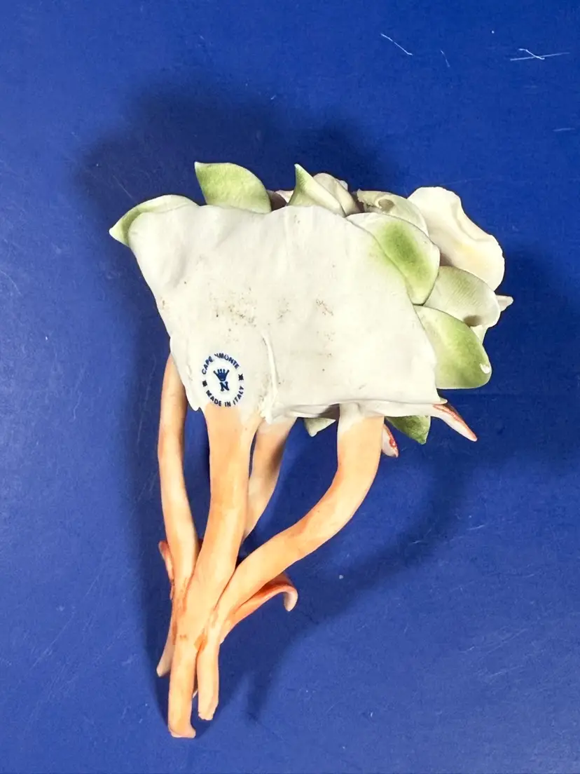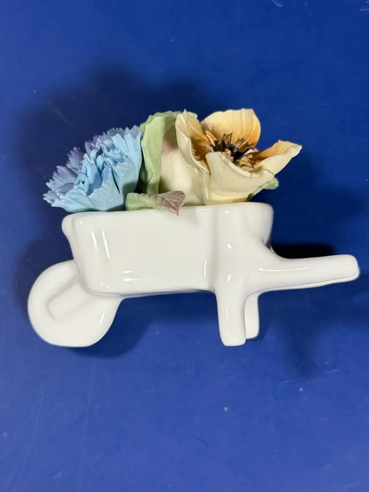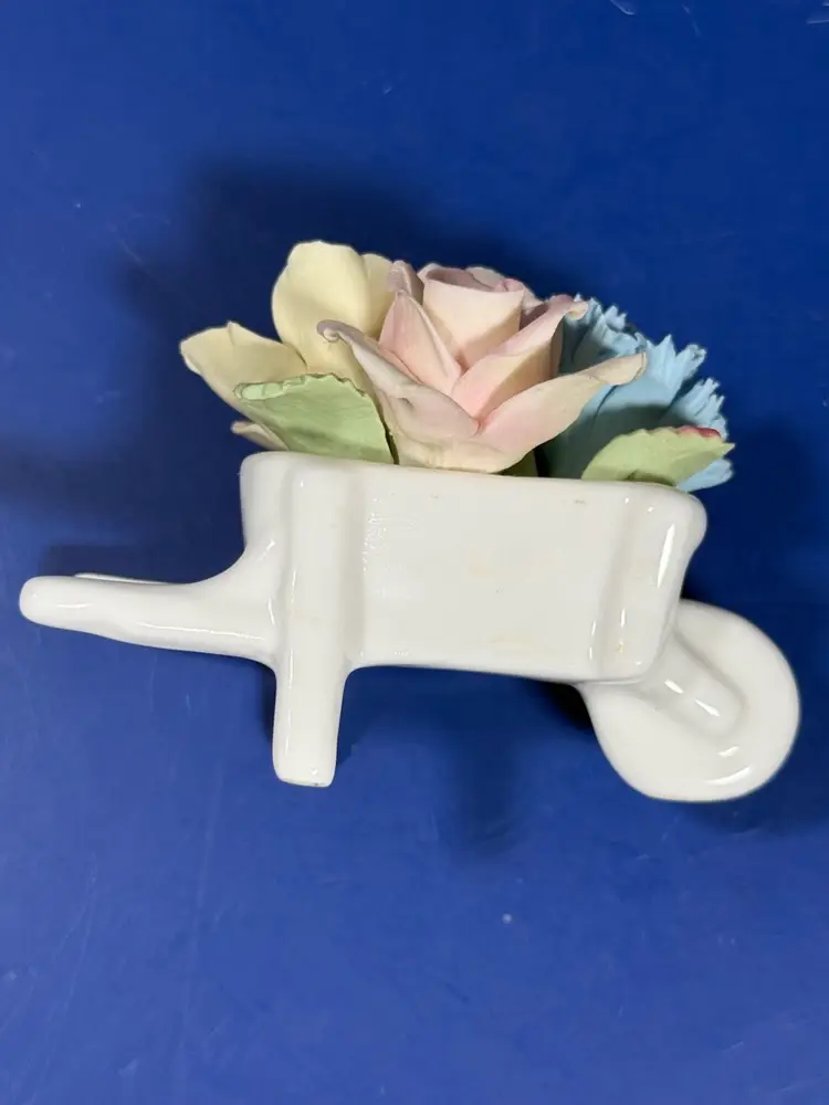 • Lot of 3 vintage ceramic floral décor pieces, each from a different maker and country • Coalport Bone China (England) – small wheelbarrow with hand‑applied flowers • Capodimonte (Italy) – multi‑rose bouquet with classic Italian sculpted petals • ENS Germany – single flower with detailed leaves and soft coloring • All pieces measure between 3” and 4” long • Beautiful hand‑crafted florals with vibrant colors and fine detailing • Light age‑appropriate wear only; no major defects noted • Perfect for collectors of European porcelain, floral figurines, or mixed‑maker display sets • Lovely for curio cabinets, cottage décor, or gift giving