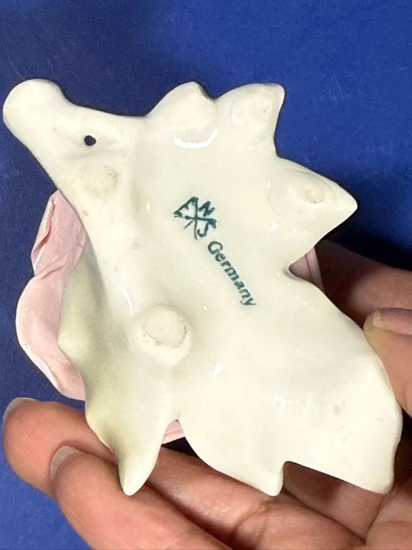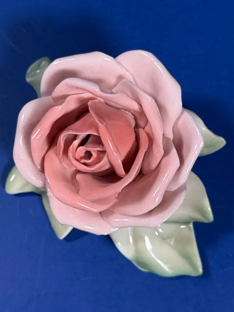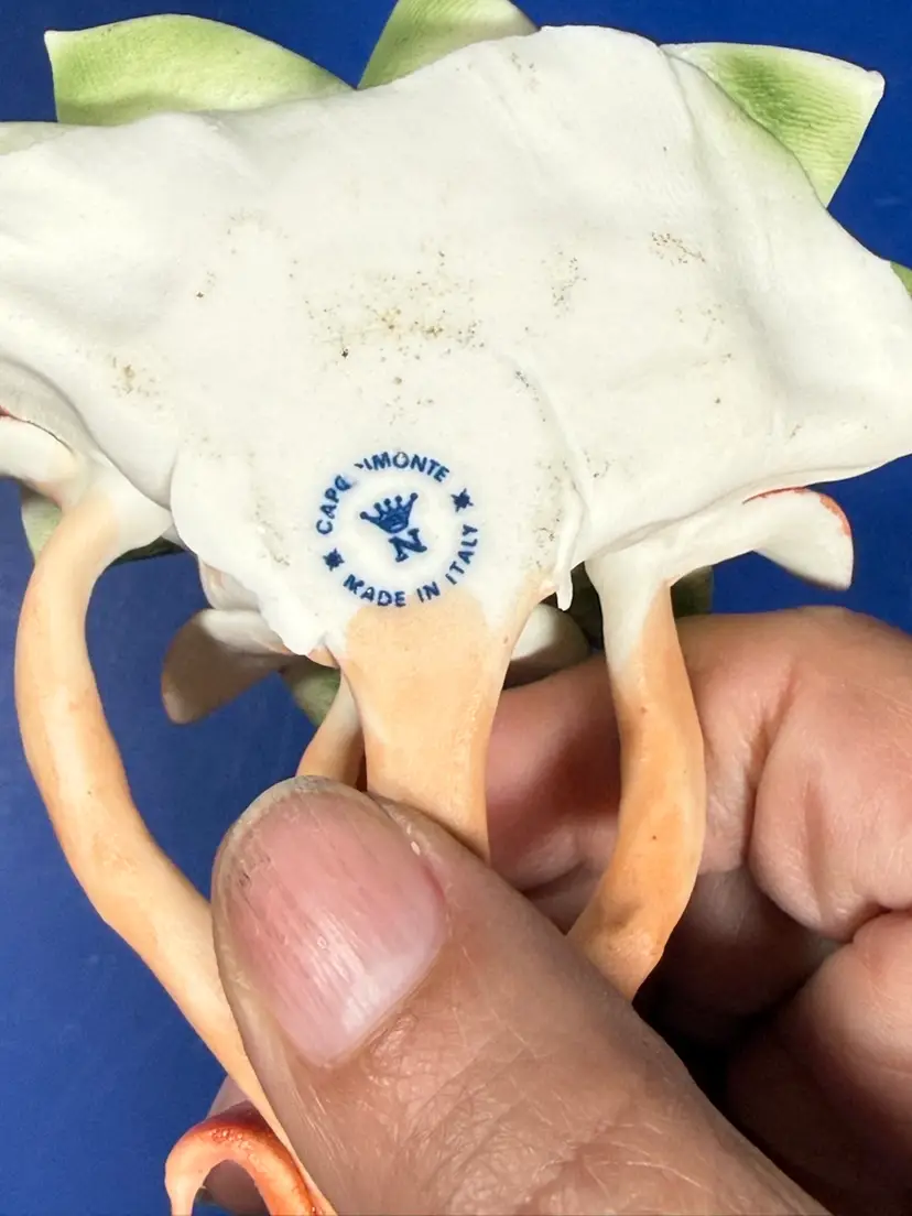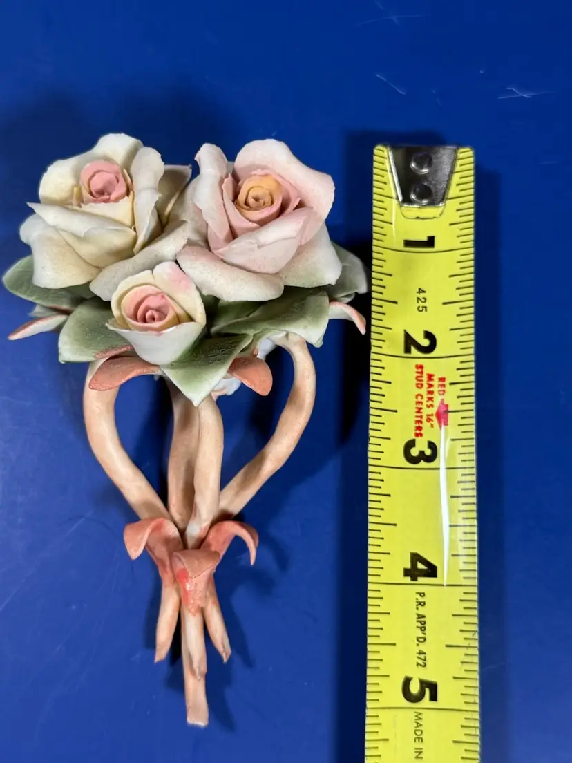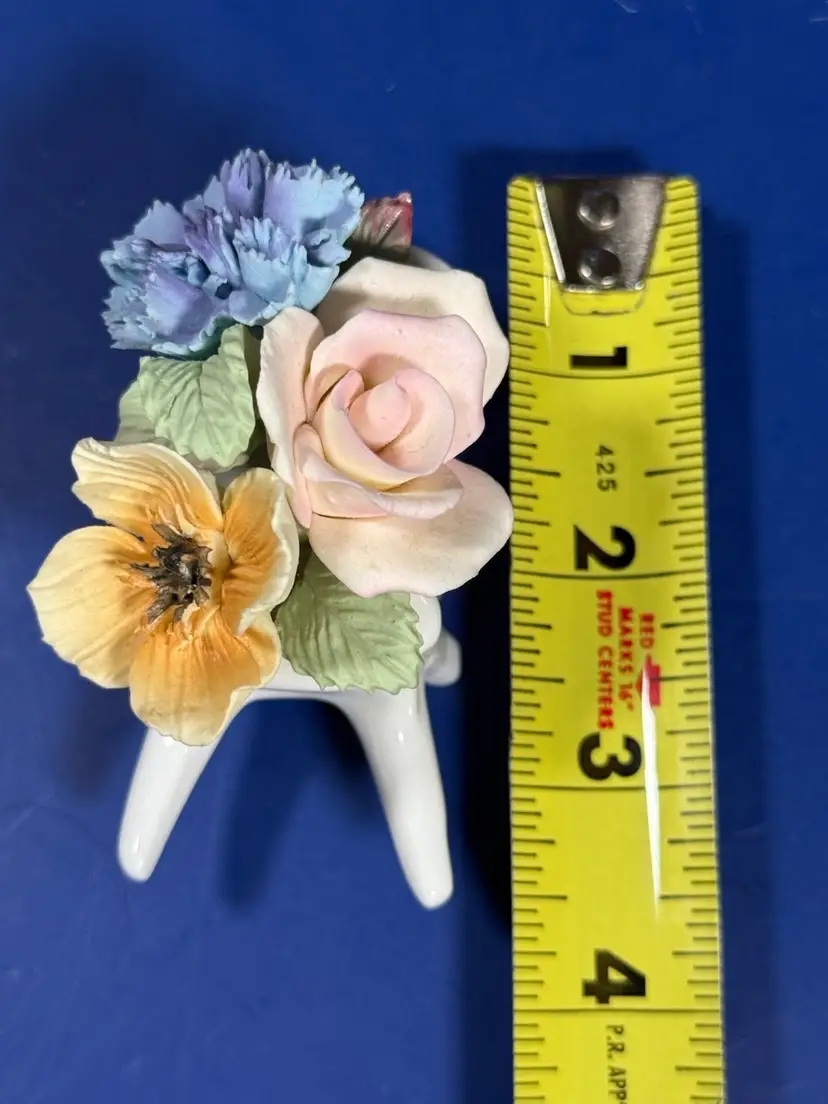 • Lot of 3 vintage ceramic floral décor pieces, each from a different maker and country • Coalport Bone China (England) – small wheelbarrow with hand‑applied flowers • Capodimonte (Italy) – multi‑rose bouquet with classic Italian sculpted petals • ENS Germany – single flower with detailed leaves and soft coloring • All pieces measure between 3” and 4” long • Beautiful hand‑crafted florals with vibrant colors and fine detailing • Light age‑appropriate wear only; no major defects noted • Perfect for collectors of European porcelain, floral figurines, or mixed‑maker display sets • Lovely for curio cabinets, cottage décor, or gift giving