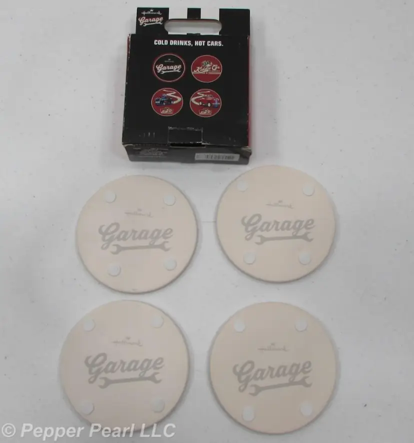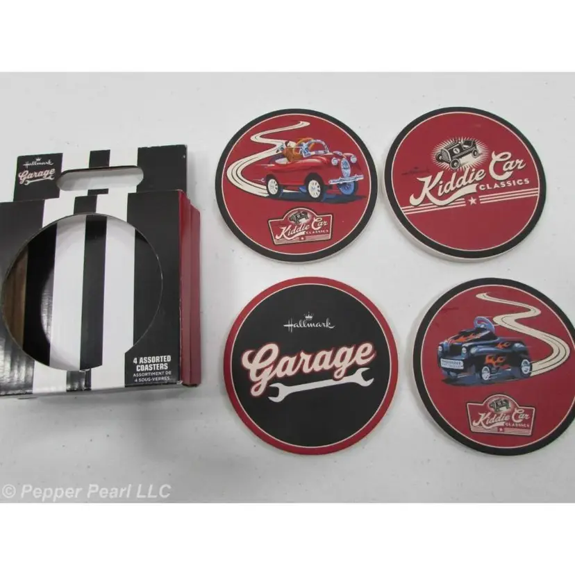 new Hallmark Garage Kiddie Car Classics Coaster Set, Four Pieces, assorted designs Heavy pottery, box has wear